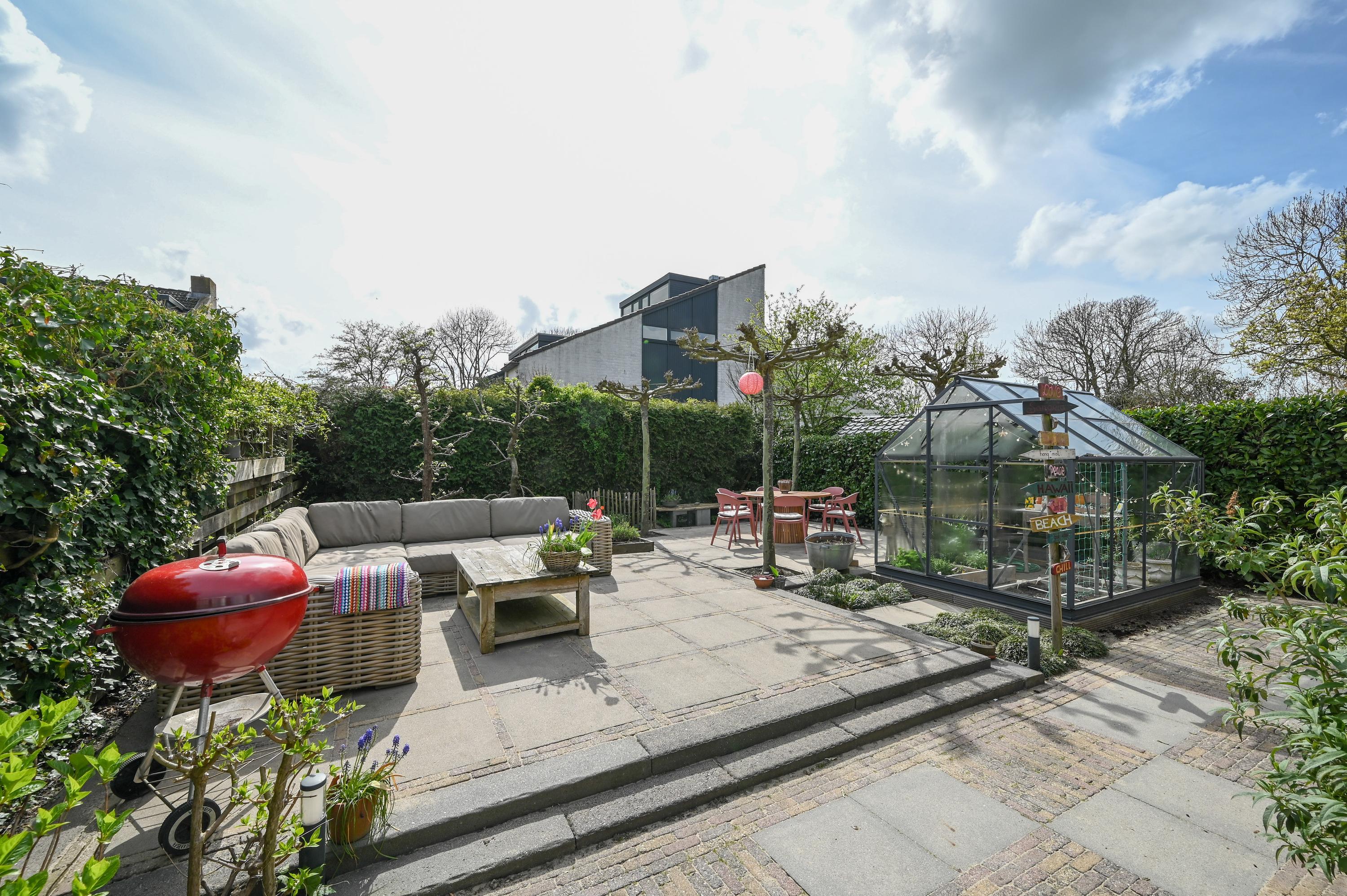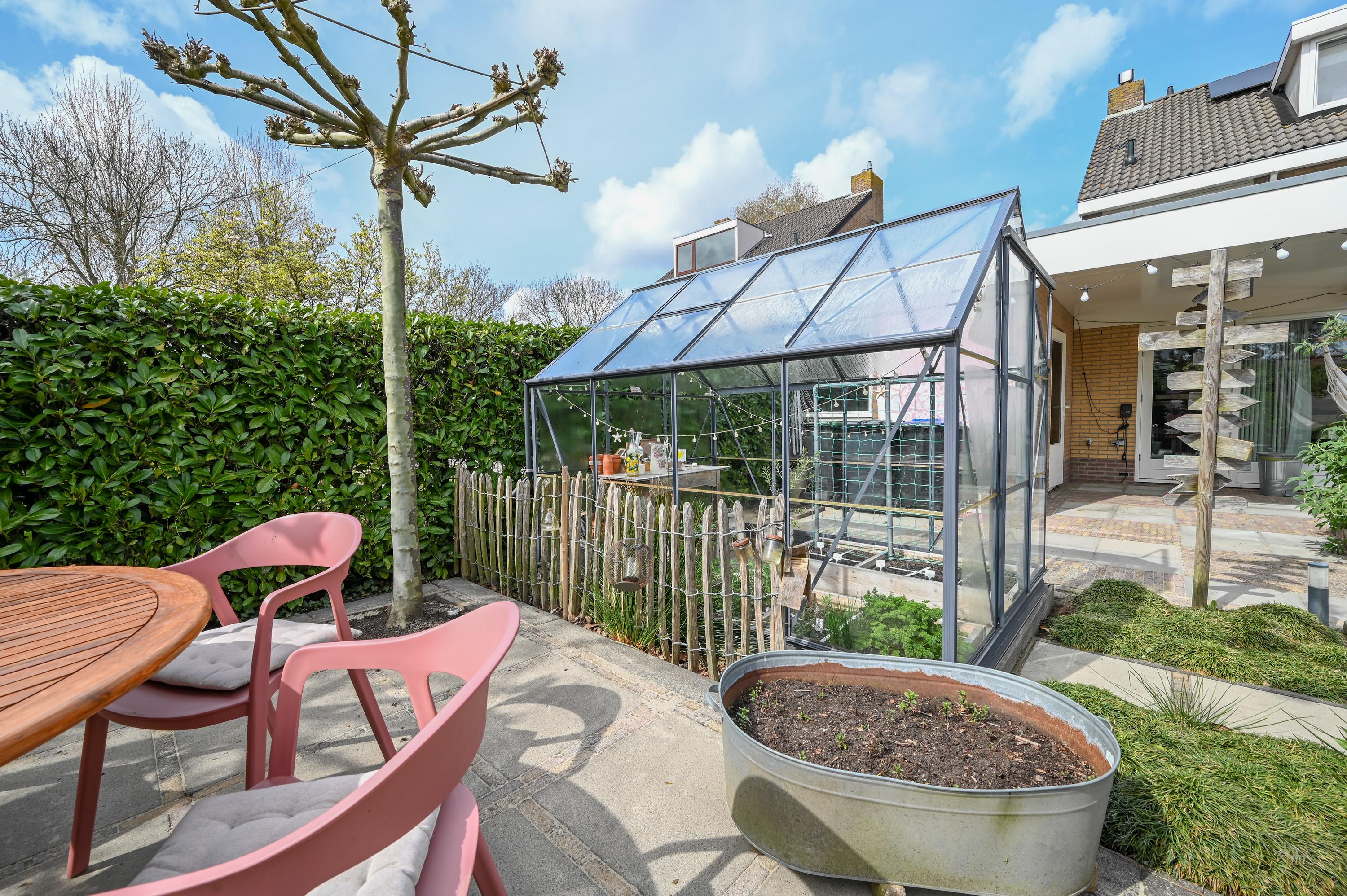 The garden has been thoughtfully landscaped with a mix of terraces, borders, and greenery. A small greenhouse offers space for homegrown produce and hobbies, while fruit trees add a playful and natural character. The layout provides multiple seating areas, each offering a different experience of sun and privacy.