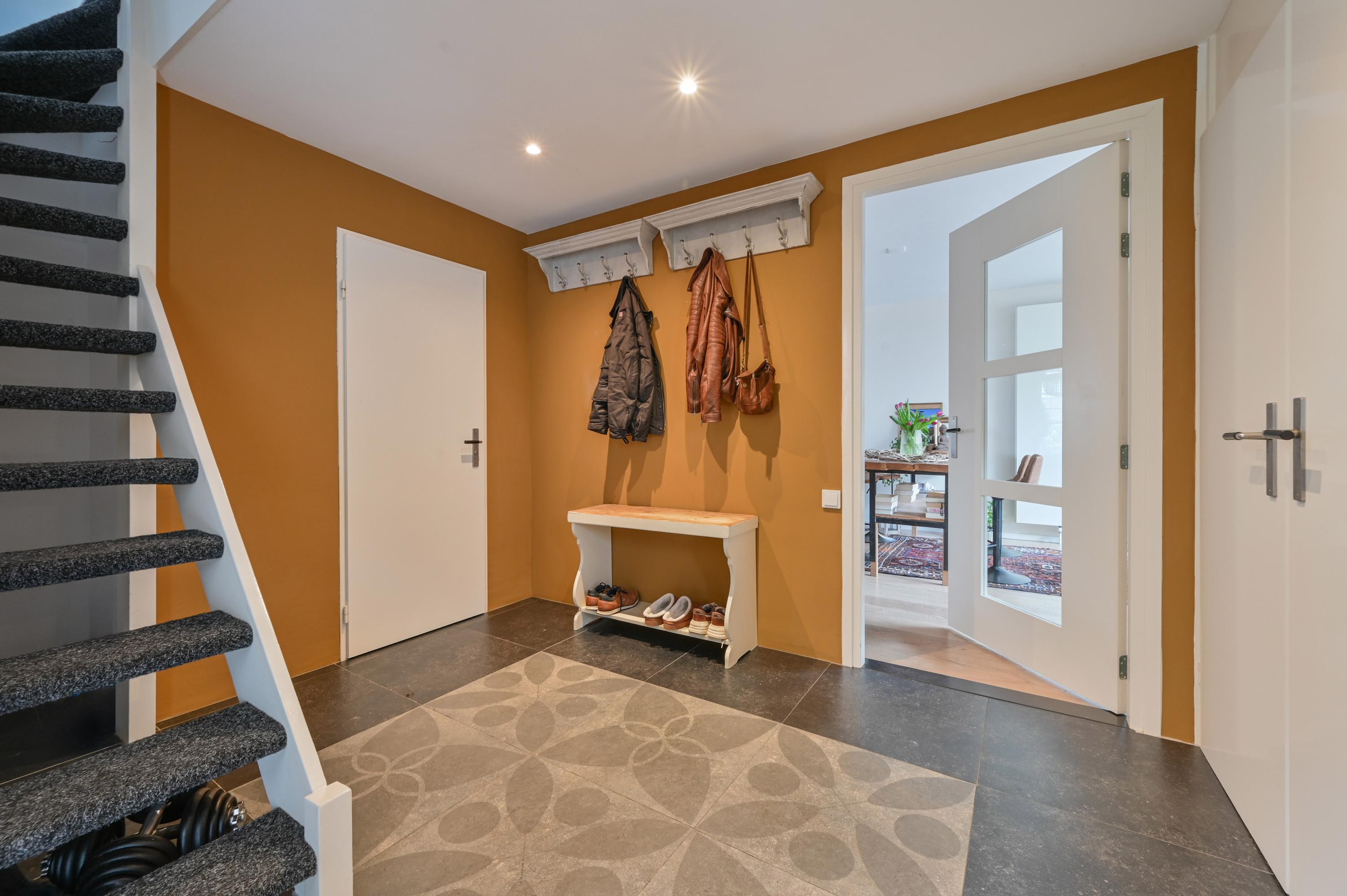 Upon entering the property, the generous setup immediately stands out: a wide driveway with space for no fewer than three cars — always a parking spot when you return home. Through the entrance, you step into the welcoming hallway, which features the staircase, meter cupboard, a practical storage closet, a toilet with washbasin, and additional storage under the stairs — ideal for shoes or everyday items you prefer to keep out of sight.