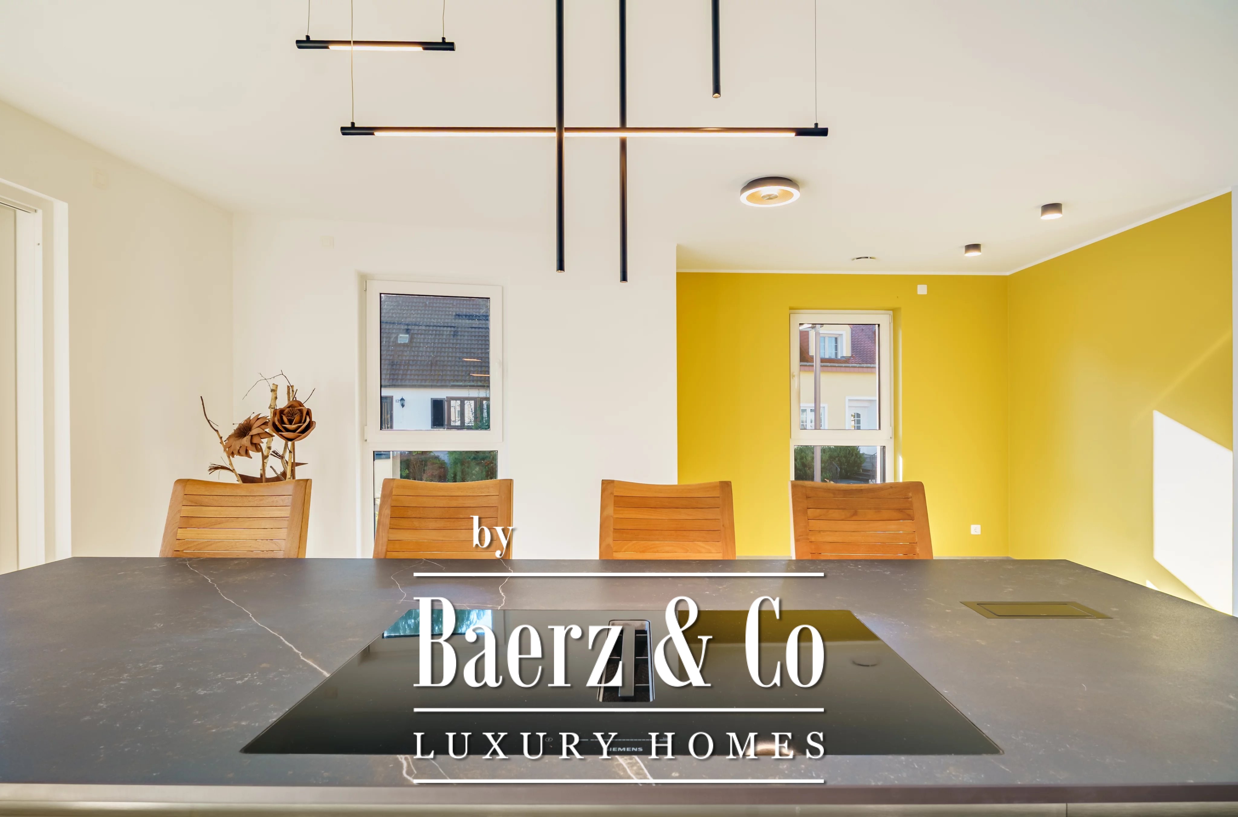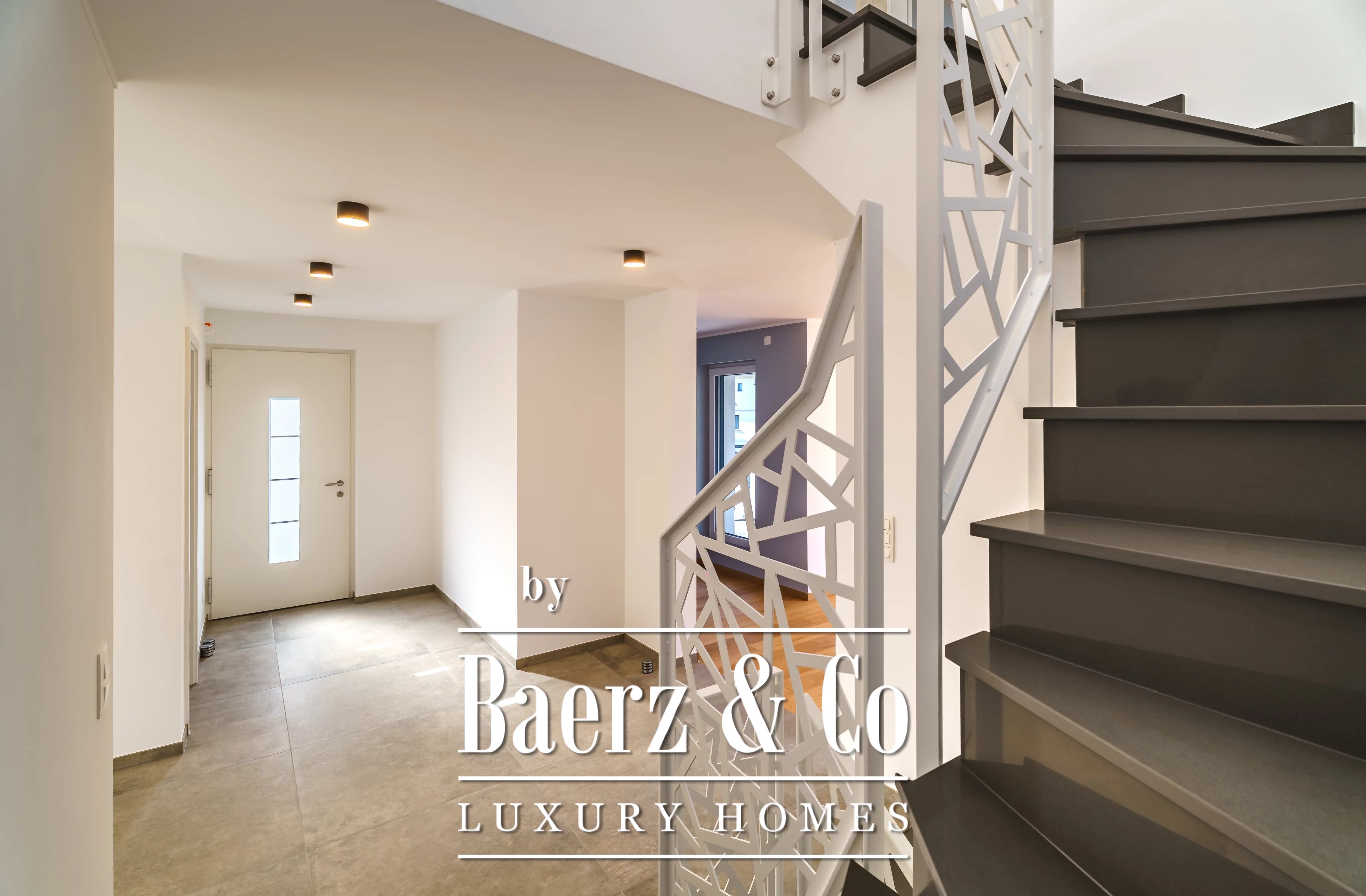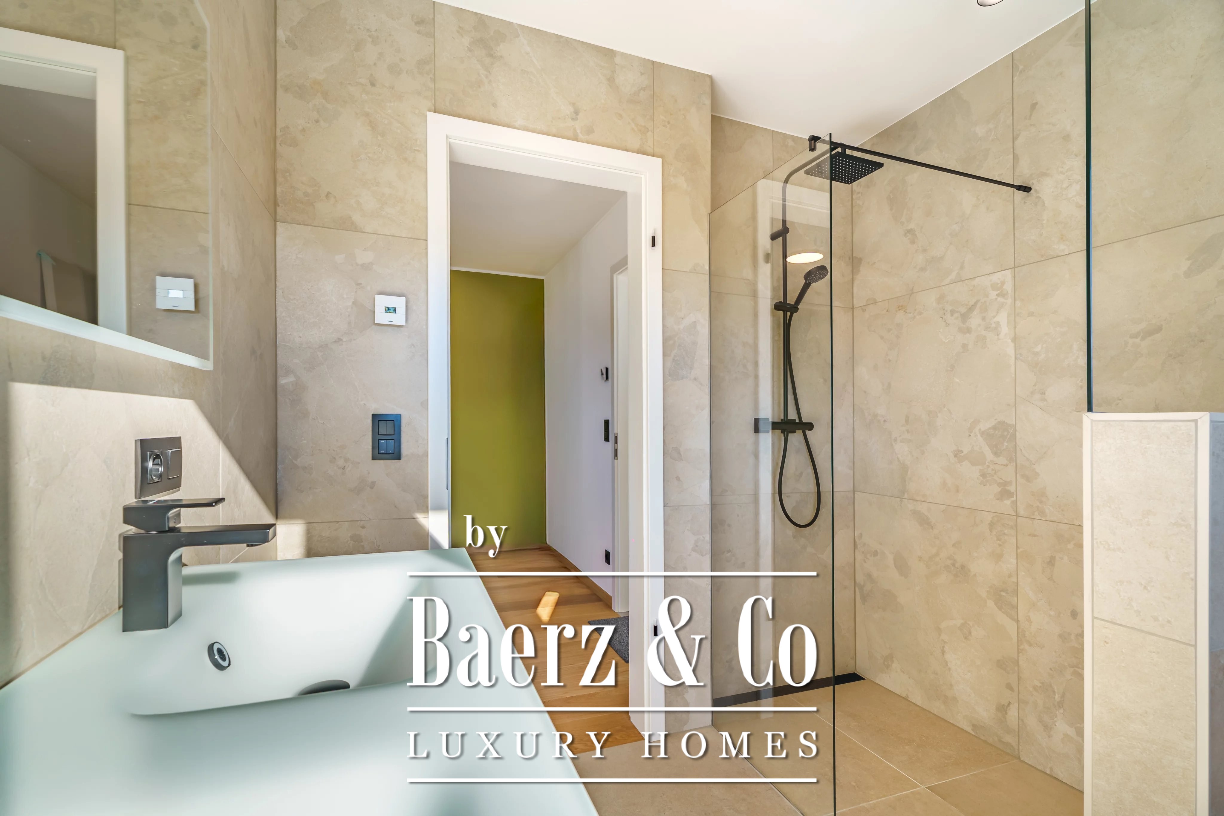 Triple glazing, sliding windows, electric awnings, and an advanced alarm system underscore a commitment to comfort and security throughout this A+ energy class home. The 40.45 m² double garage and videophone entry add further assurance. For those seeking a luxury single-family house for sale in Niederanven, this address articulates contemporary architecture with enduring discretion.