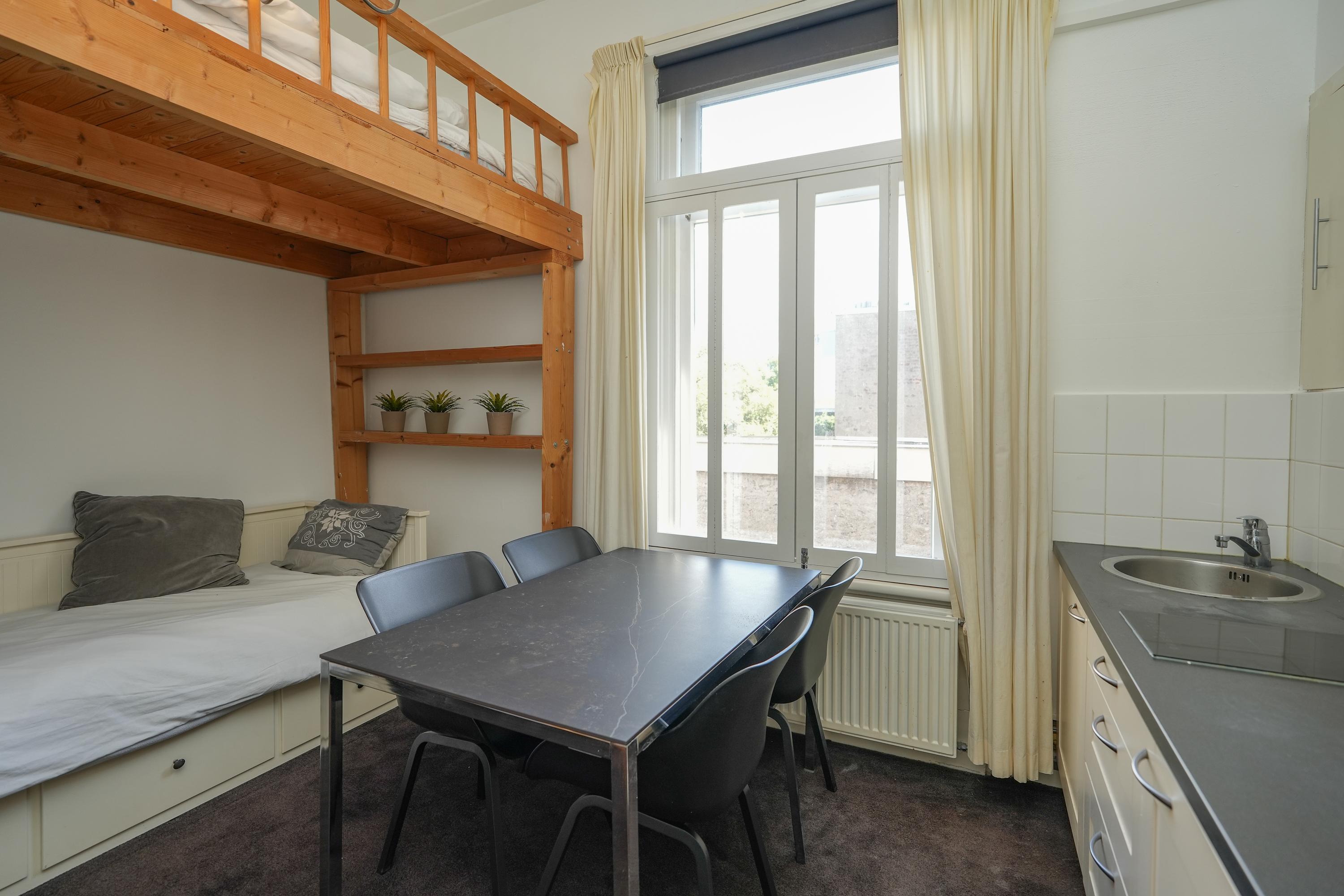 Middels een vaste trap is de bovenste verdieping bereikbaar, hier bevindt zich een ruime woonkamer met een bedstee. Tevens is er een moderne dichte keuken met witgoedaansluiting en er is een functionele badkamer met toilet en douche. Deze verdieping is sfeervol doordat de originele constructiebalken zichtbaar zijn gebleven en de ruimte is lekker licht door de dakramen. Bovendien is er veel bergruimte in vaste kasten.