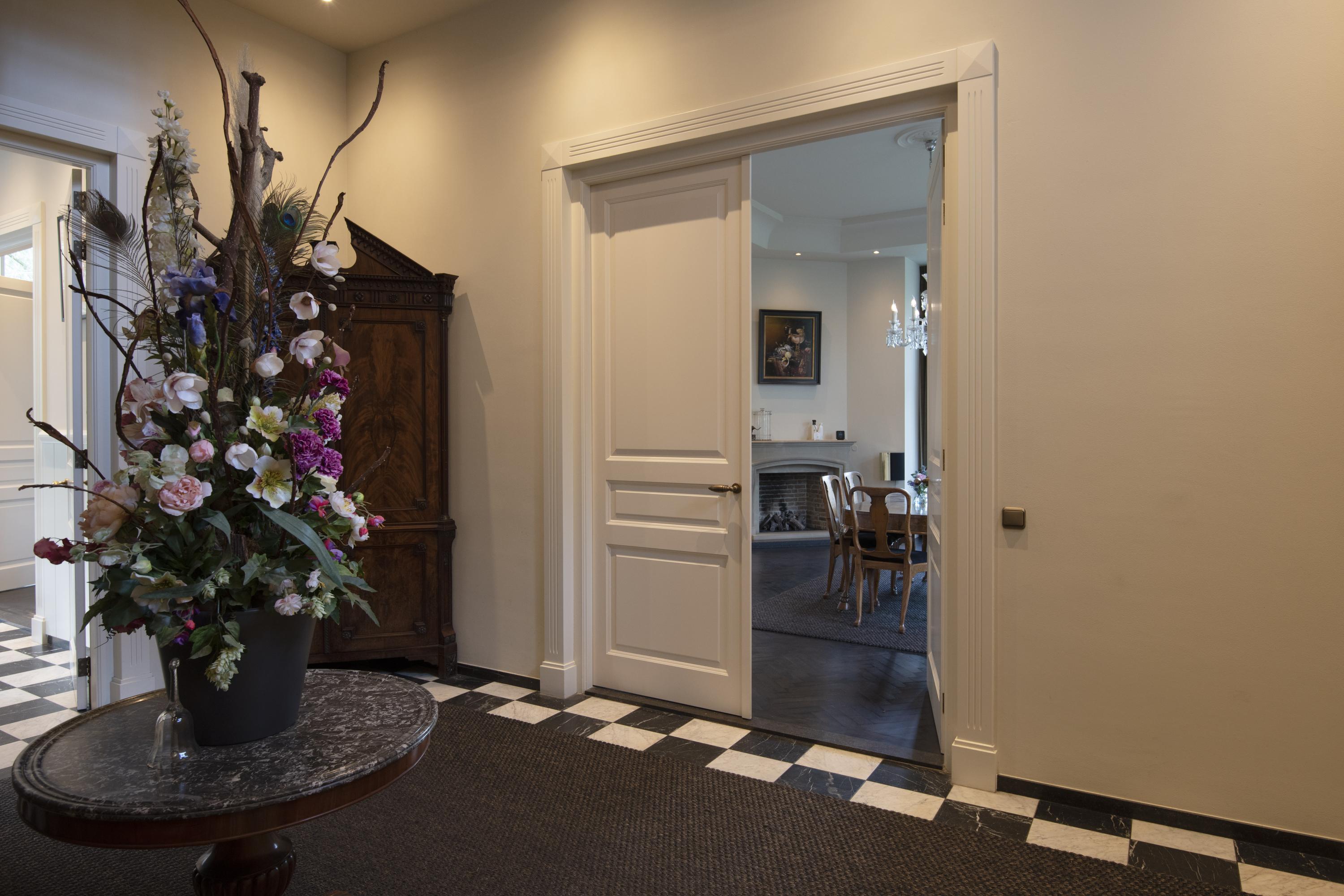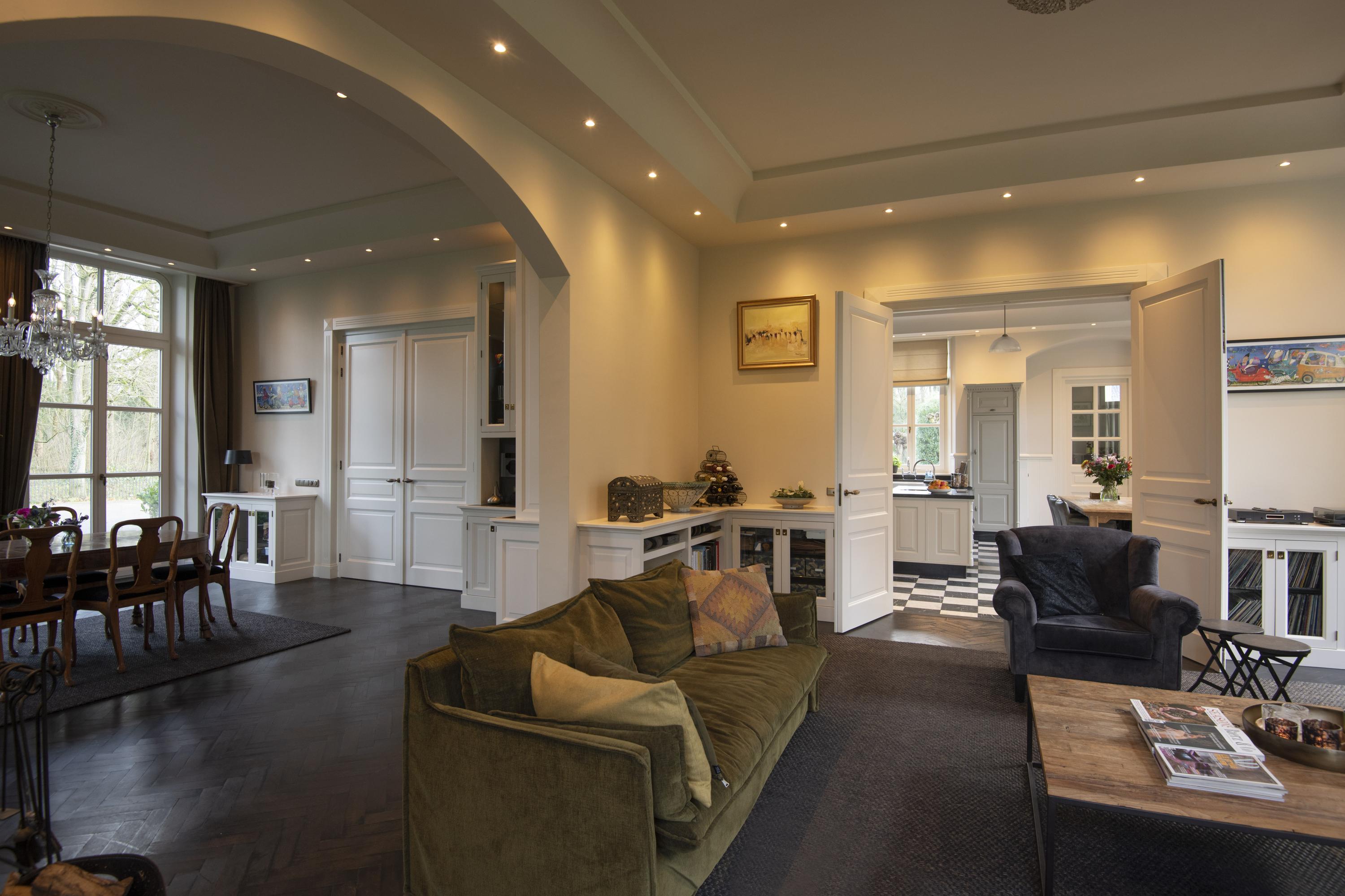 The completely nature-oriented living room consists of a sitting room and a dining room. There are two fireplaces and four pairs of French doors to the garden. The 3.60m high stucco ceilings combined with the amount of light through the high windows create a magnificent spatial experience. Double doors lead into the cozy eat-in kitchen. This fully equipped kitchen is furnished with a classic Tinello kitchen unit with a natural stone worktop, sink island and high-quality appliances. In the tower adjacent to the kitchen diner is a pantry. In the living kitchen are two pairs of double doors to the garden. The entire first floor has underfloor heating.
