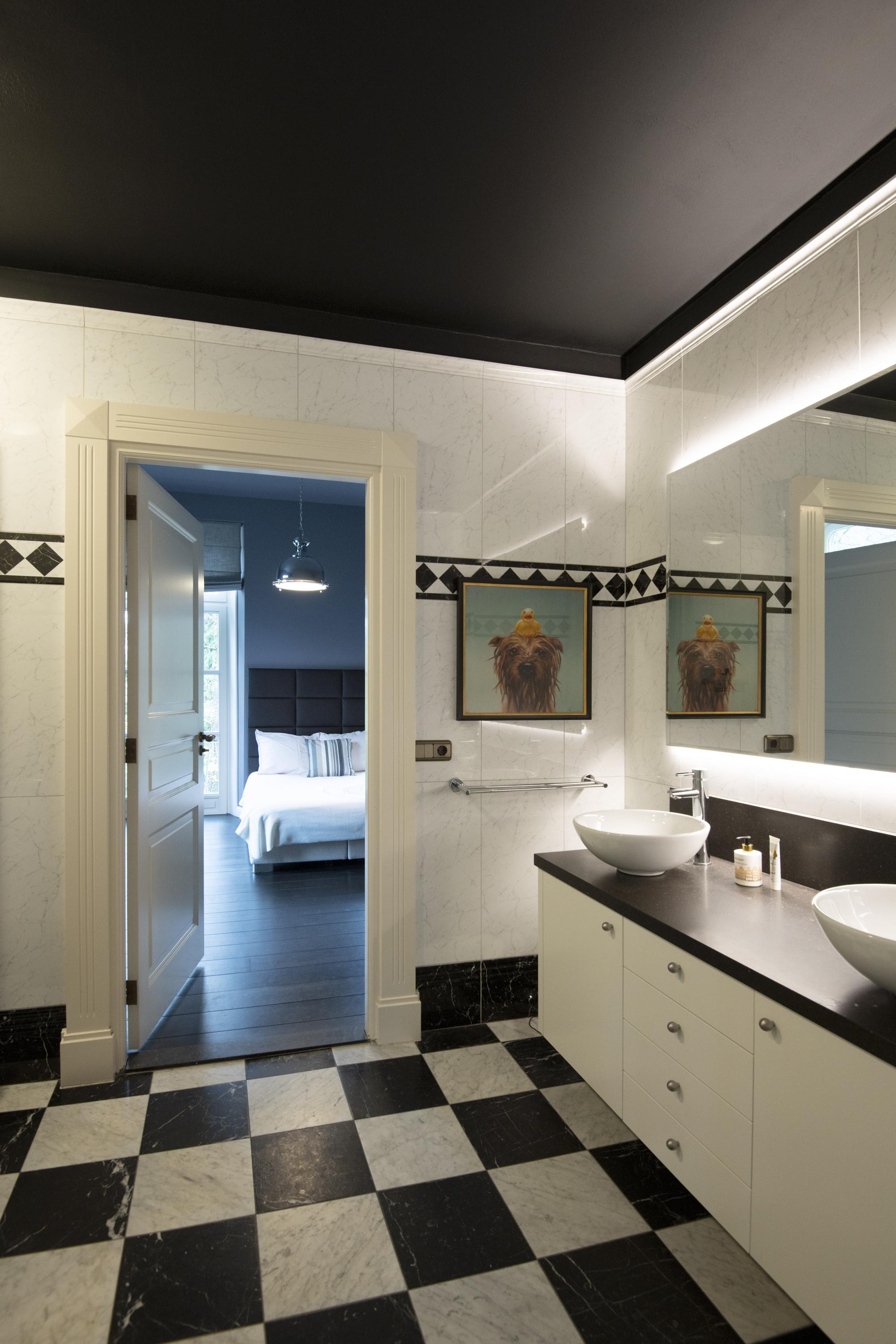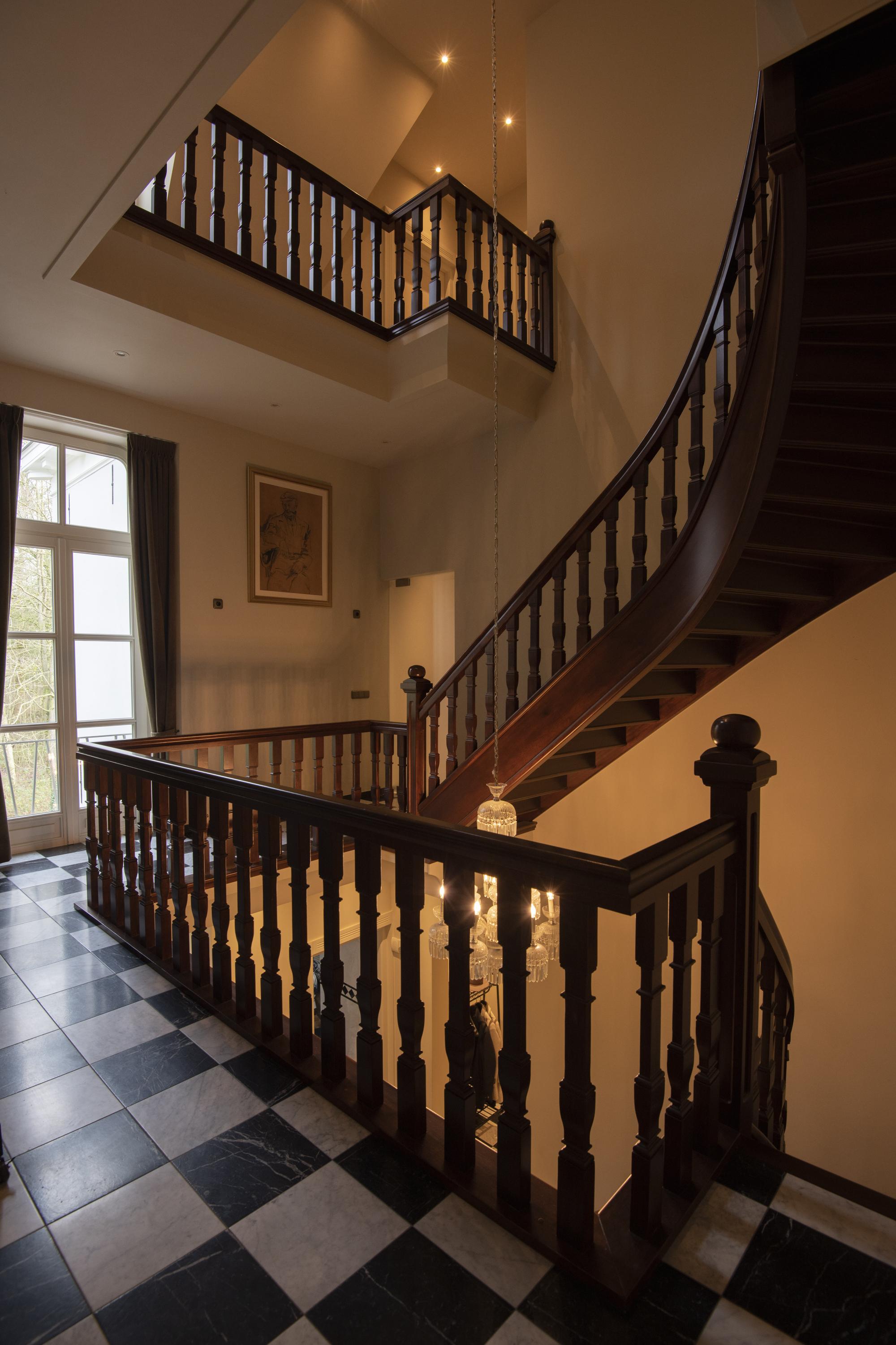 The imposing staircase leads to the second floor. The eye-catcher on this floor is the suite; a nature-oriented bedroom of 45 m2 with high stucco ceiling, three pairs of double doors to the French balconies, an adjoining dressing room and private bathroom. From this suite is also access to the tower where there is space for a shoe collection if desired. On this floor are two more bedrooms, also with French balconies. Between these bedrooms is the 2nd bathroom with double sink vanity, walk-in shower and toilet. On the landing is another separate 2nd toilet. The floor in the suite is covered with luxury carpet and the floors of the other two bedrooms are covered with parquet. This floor is also fully equipped with underfloor heating.