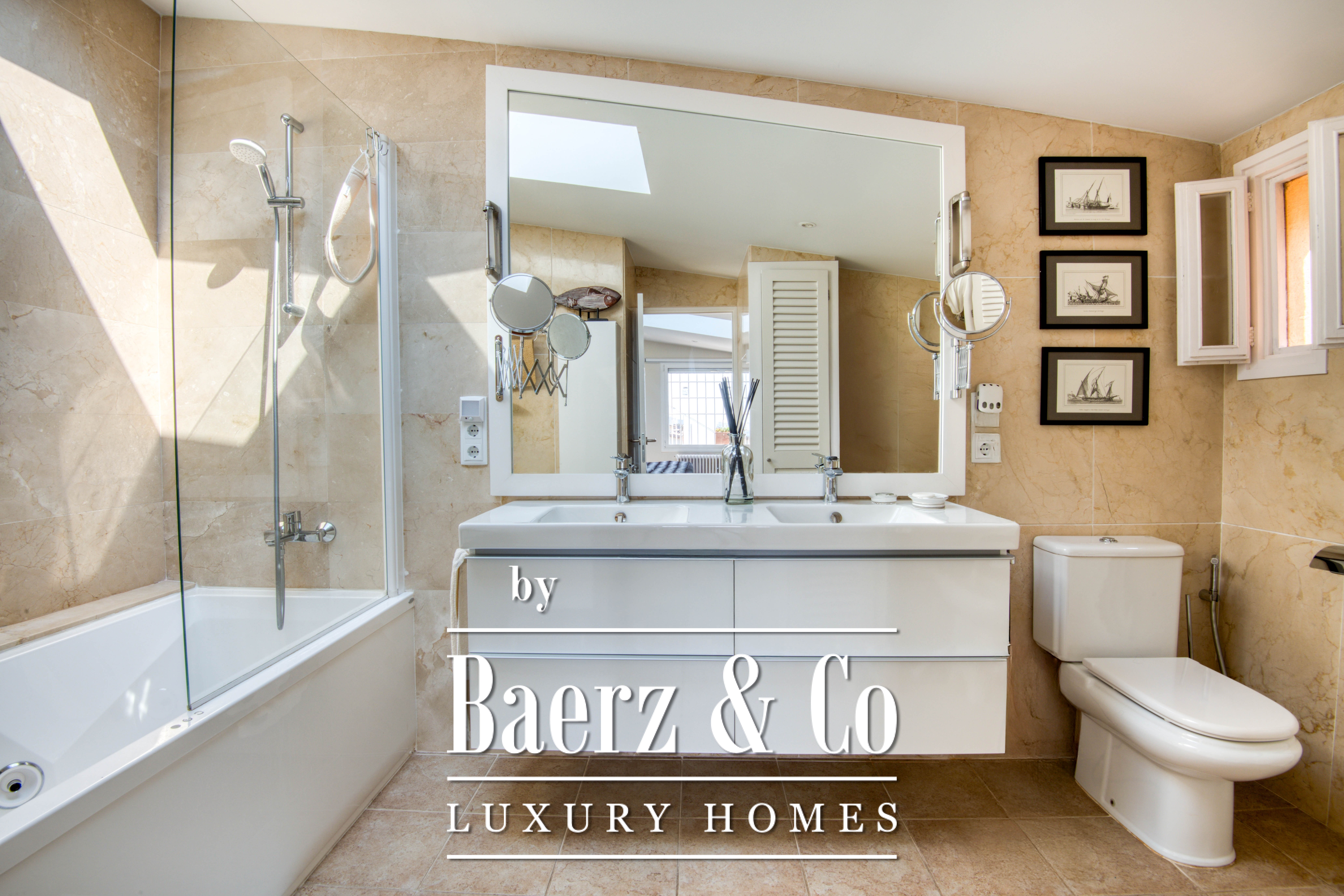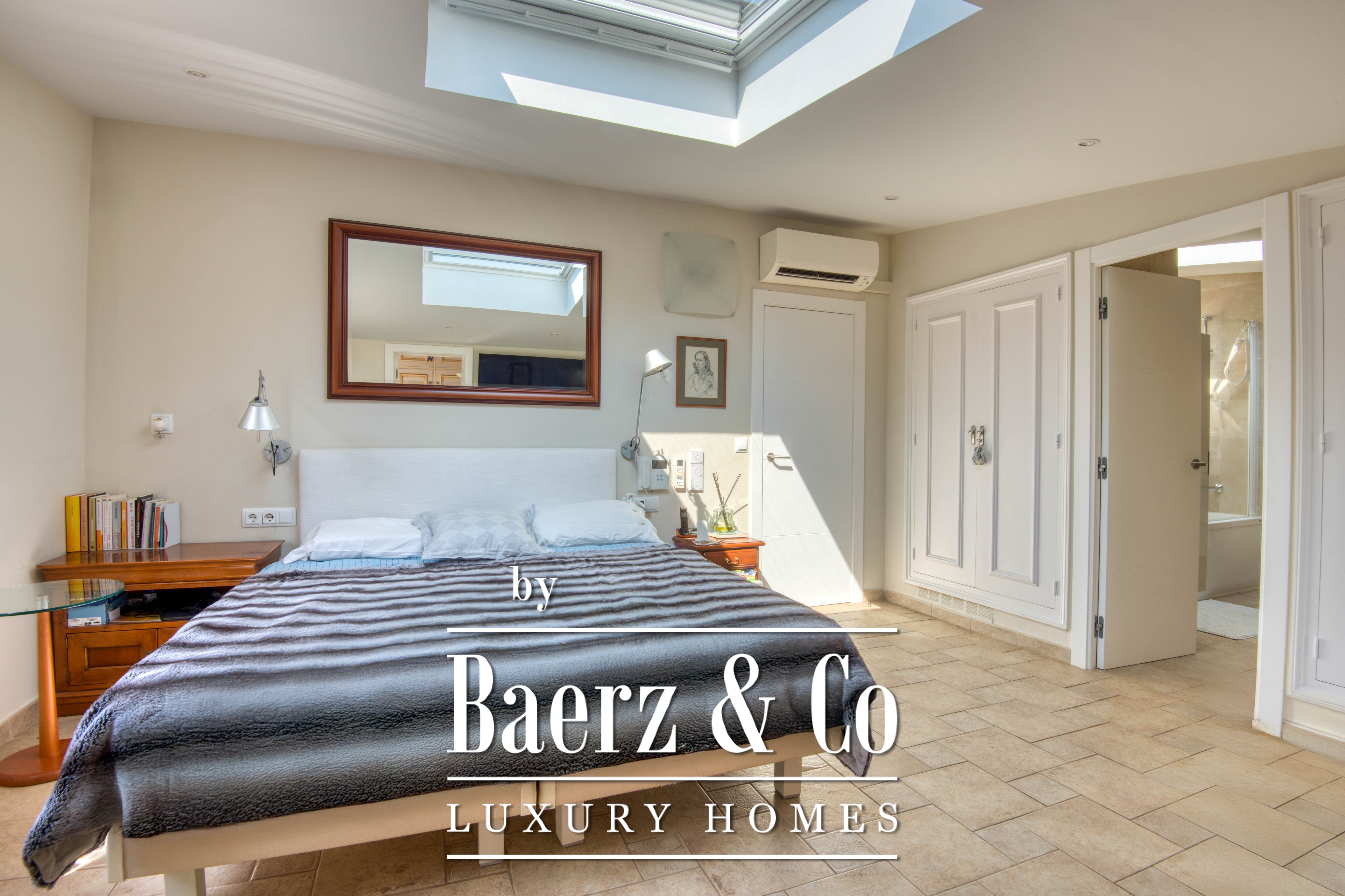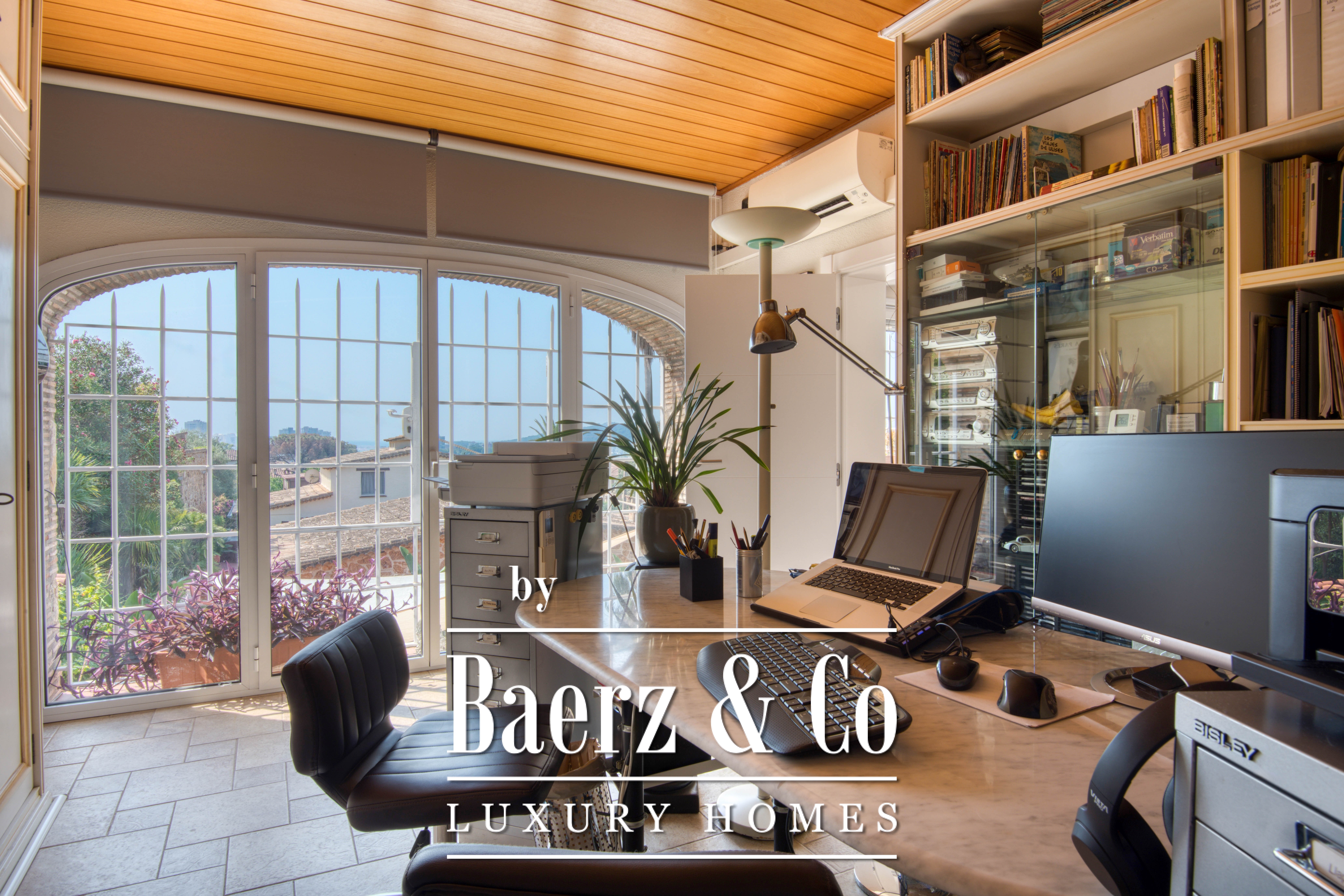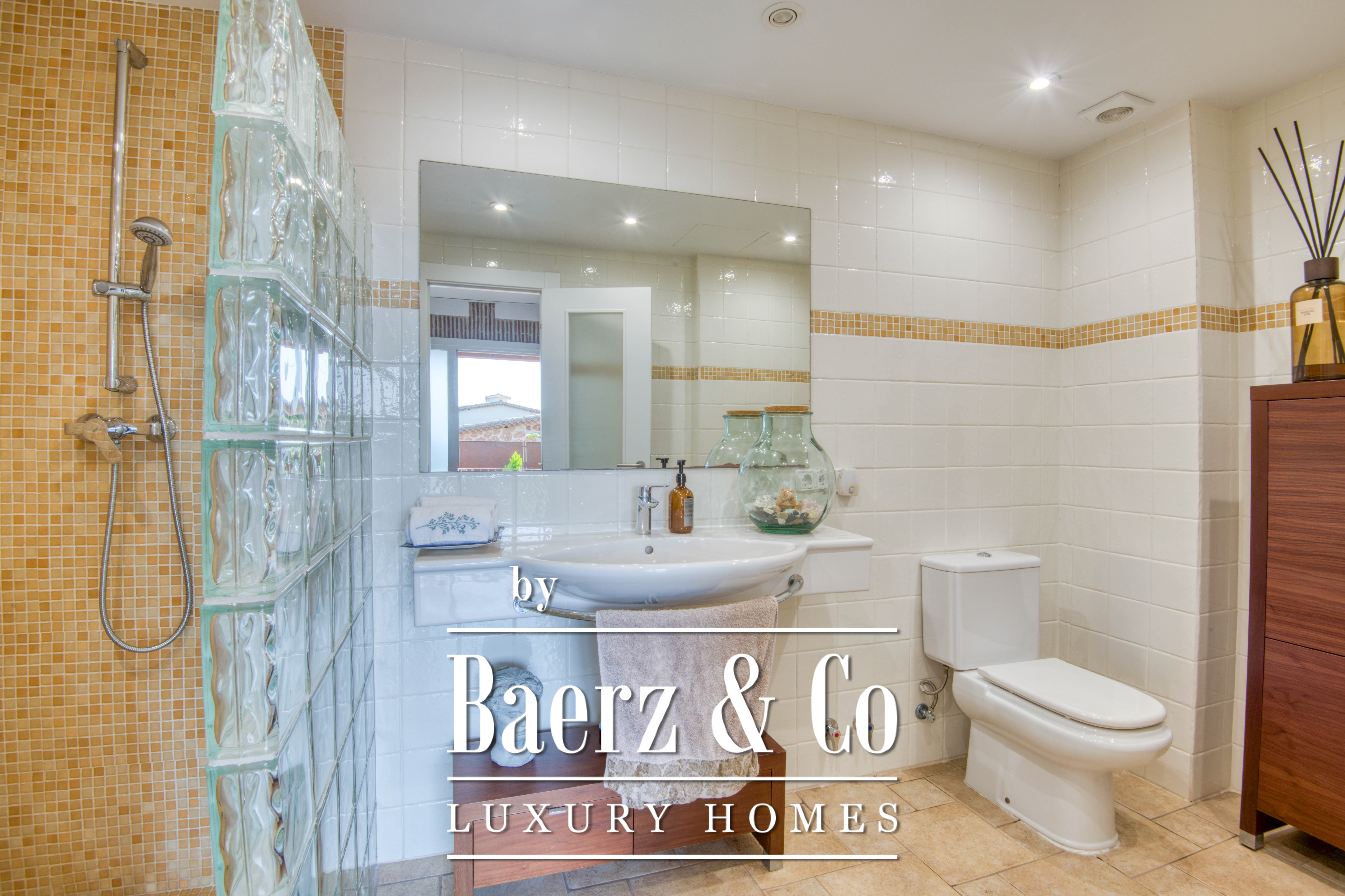 Upstairs, two double bedrooms with custom wardrobes and a full bathroom share the floor with a main suite. The suite offers a walk-in closet, private bathroom, office space, and exclusive access to a terrace, framing sweeping views across Platja d’Aro and the surrounding landscape.