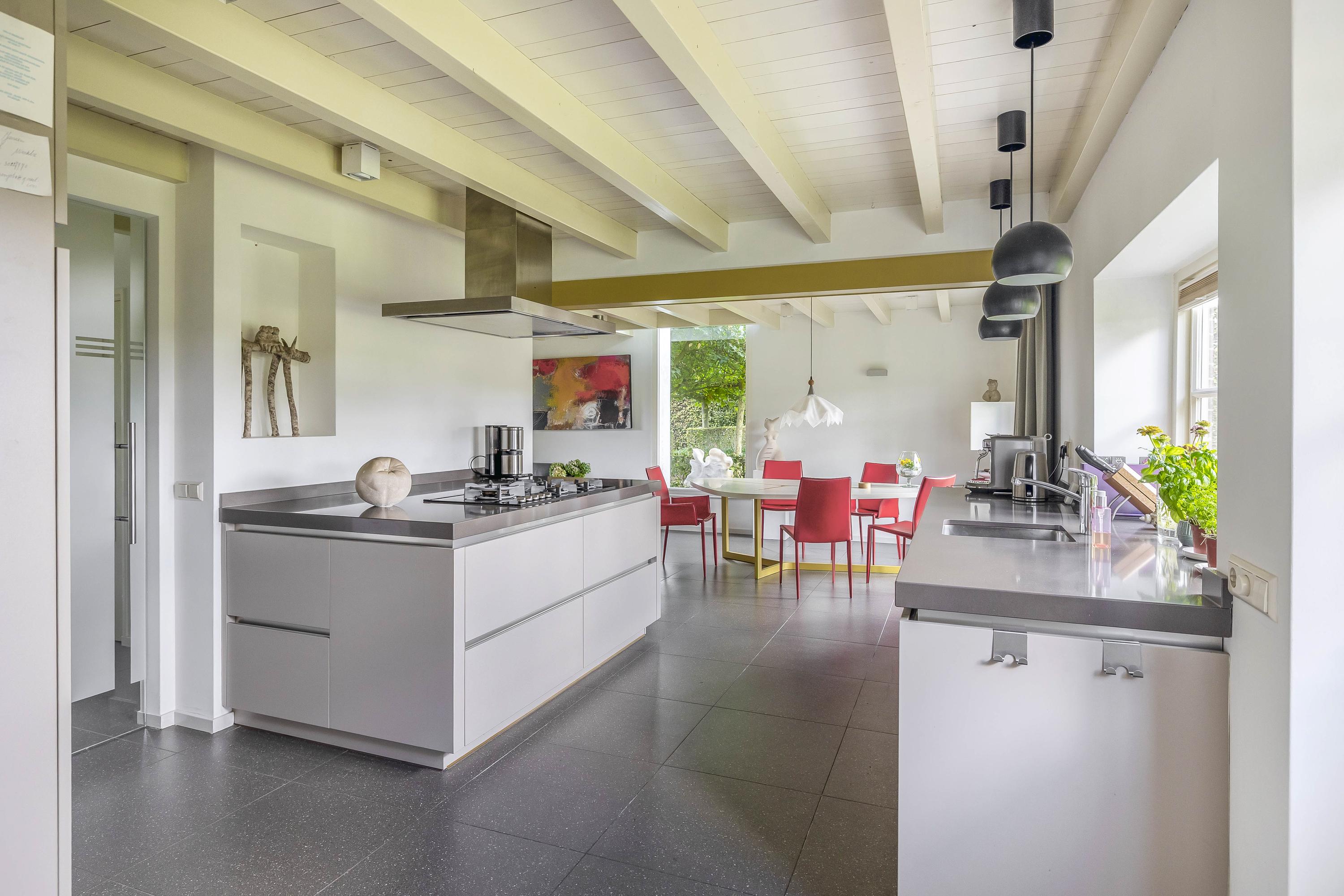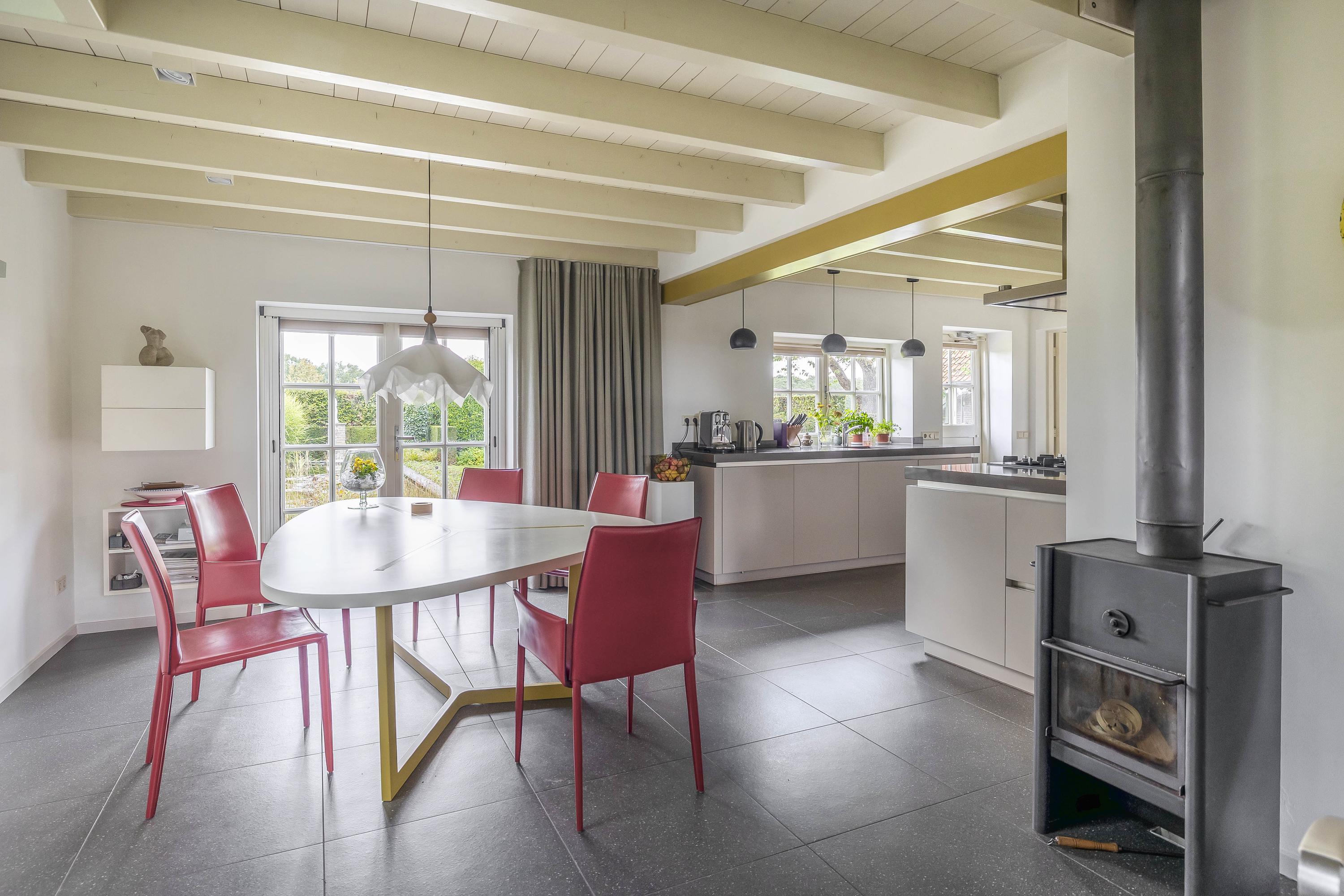 From the hall, you enter the spacious kitchen on the left side of the house. The kitchen also has a tiled floor with underfloor heating, stucco walls, and a beautiful wooden beam ceiling. In 2011, the kitchen was completely renovated. It features a cooking/island with a composite countertop, a 5-burner gas hob including a wok burner, extractor hood, and ample storage space. A wall unit with a composite countertop is equipped with a large sink, dishwasher, and a close-in boiler. Another wall unit contains a freezer, refrigerator, oven, and steam oven. From the kitchen, you have access to the backyard through a door and double French doors. The atmosphere is enhanced by the wood-burning stove and a beautiful high window on the side wall with a view through a glass panel in the bedroom on the first floor. There is also a built-in cupboard with the underfloor heating distributor.