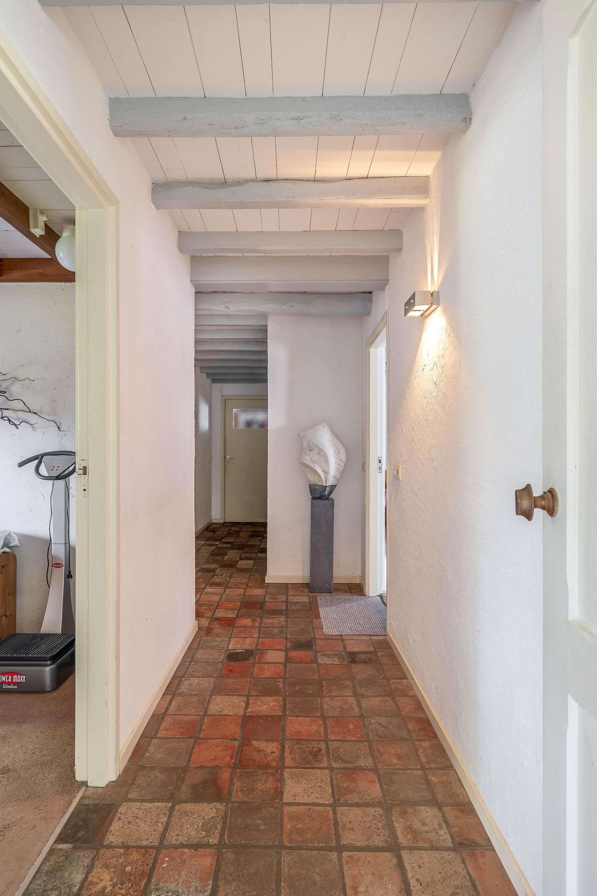 From the fixed staircase in the entrance hall, you reach the first floor of the main house. Here you will find a spacious landing with carpeted floors, stucco walls, and a beamed ceiling, with a view into the hall on the ground floor. From here, you have access to two bedrooms and the second bathroom.