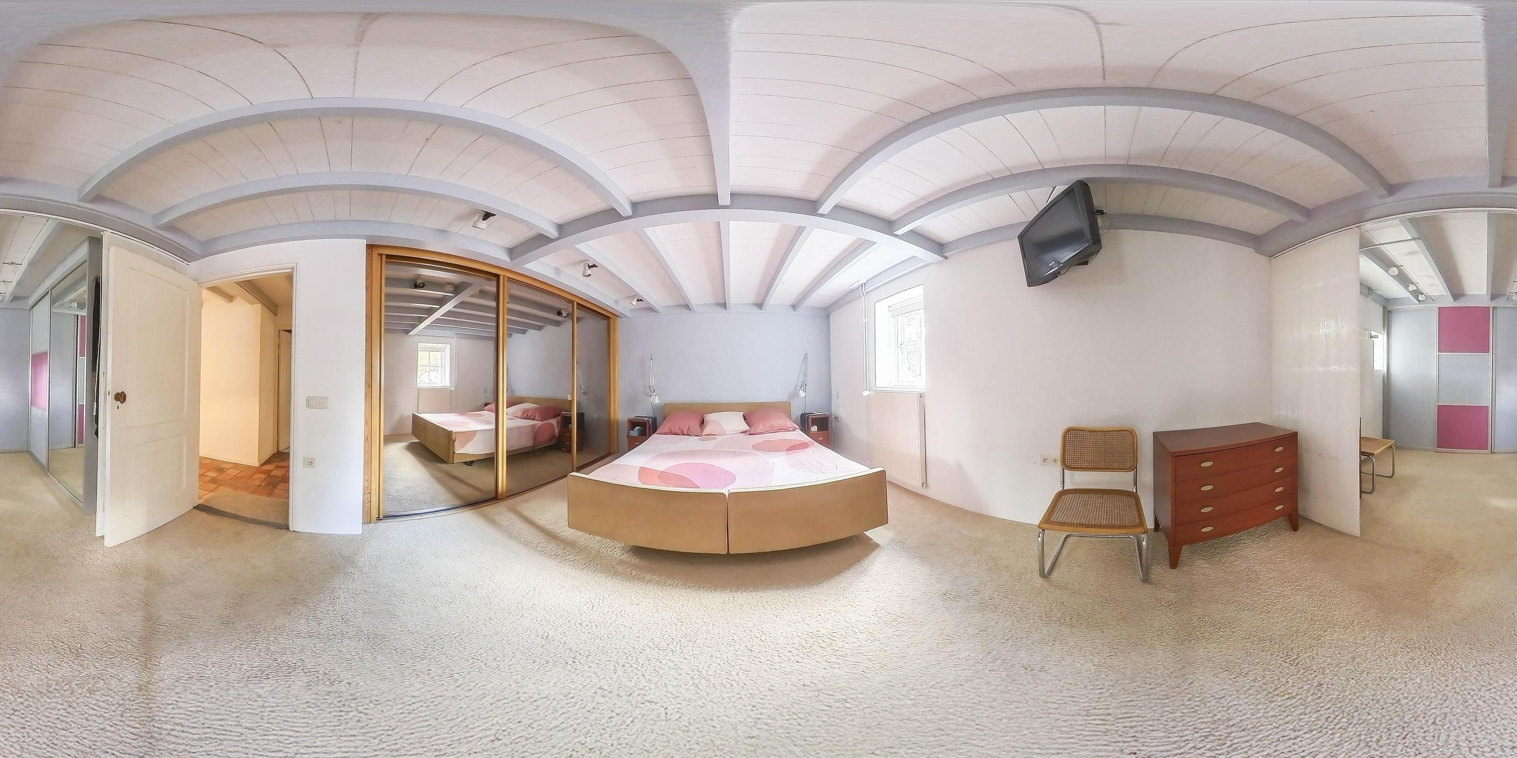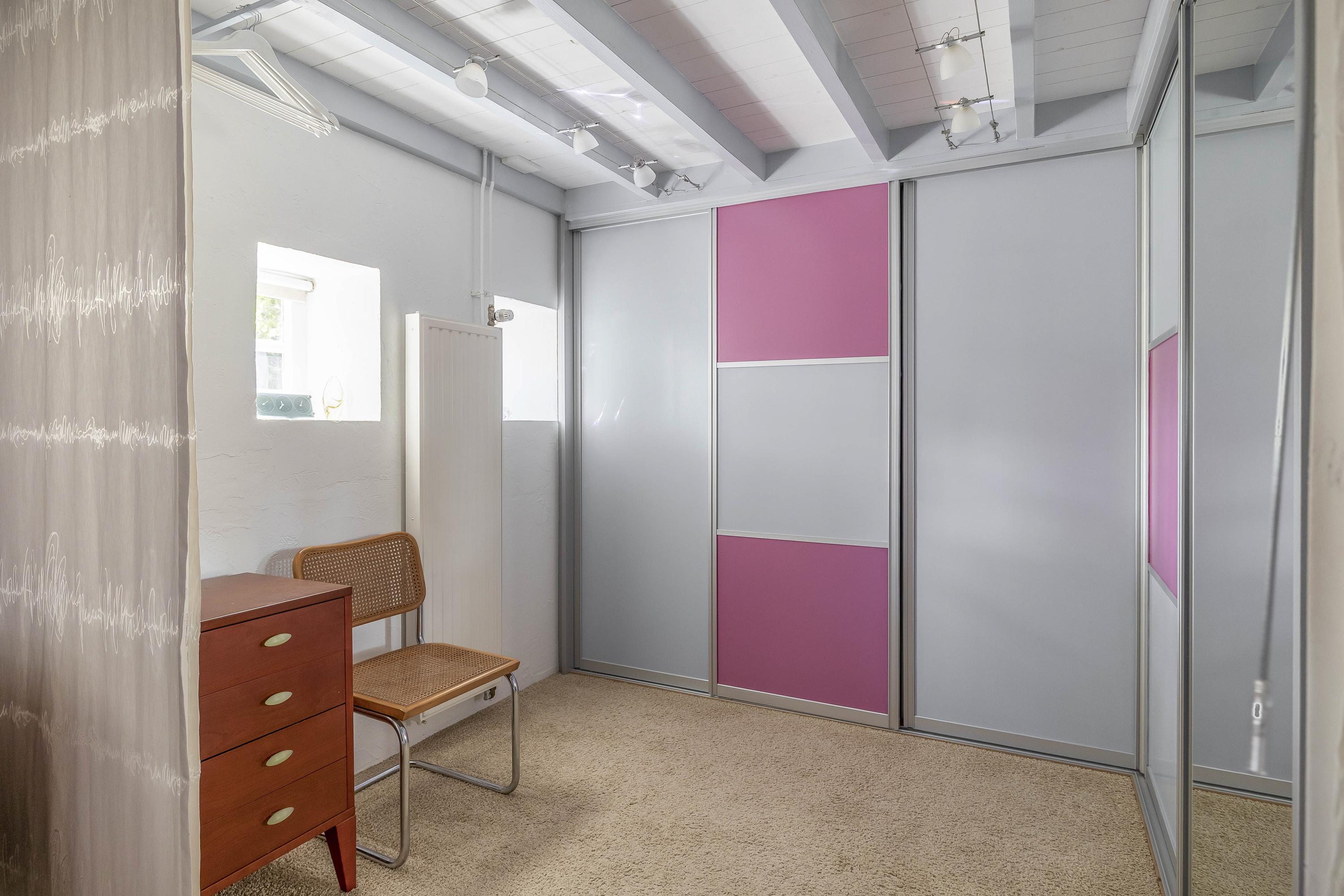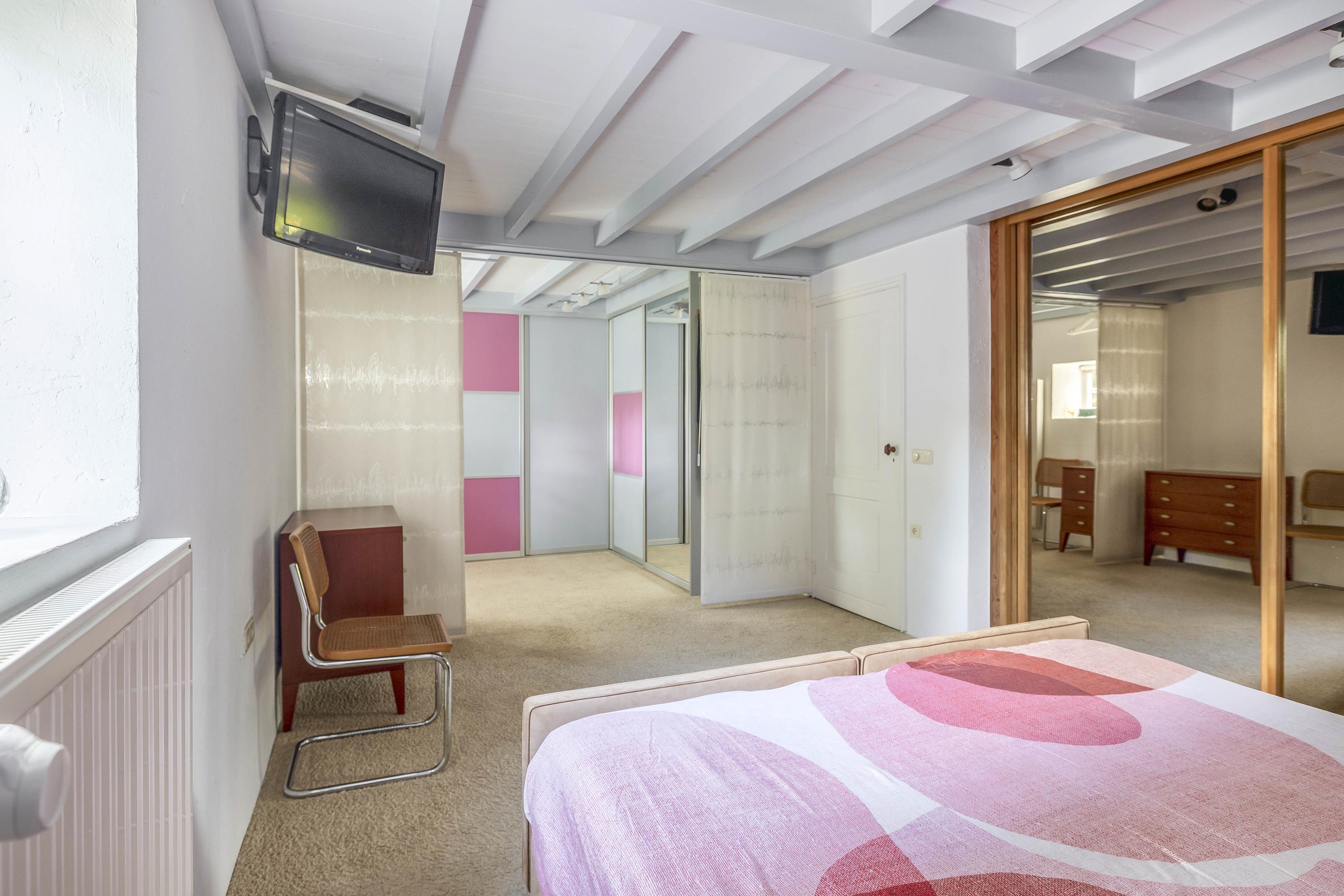 The first bedroom on this floor, located entirely on the left side of the farmhouse, is finished with carpet, stucco walls, and a beamed ceiling. This room has a large Velux skylight at the rear and a beautiful high window that extends into the kitchen on the ground floor. This spacious bedroom also has a built-in bookcase in the wall. Bedroom two, located in the middle of the house, has a similar finish and three large skylights that provide plenty of light.