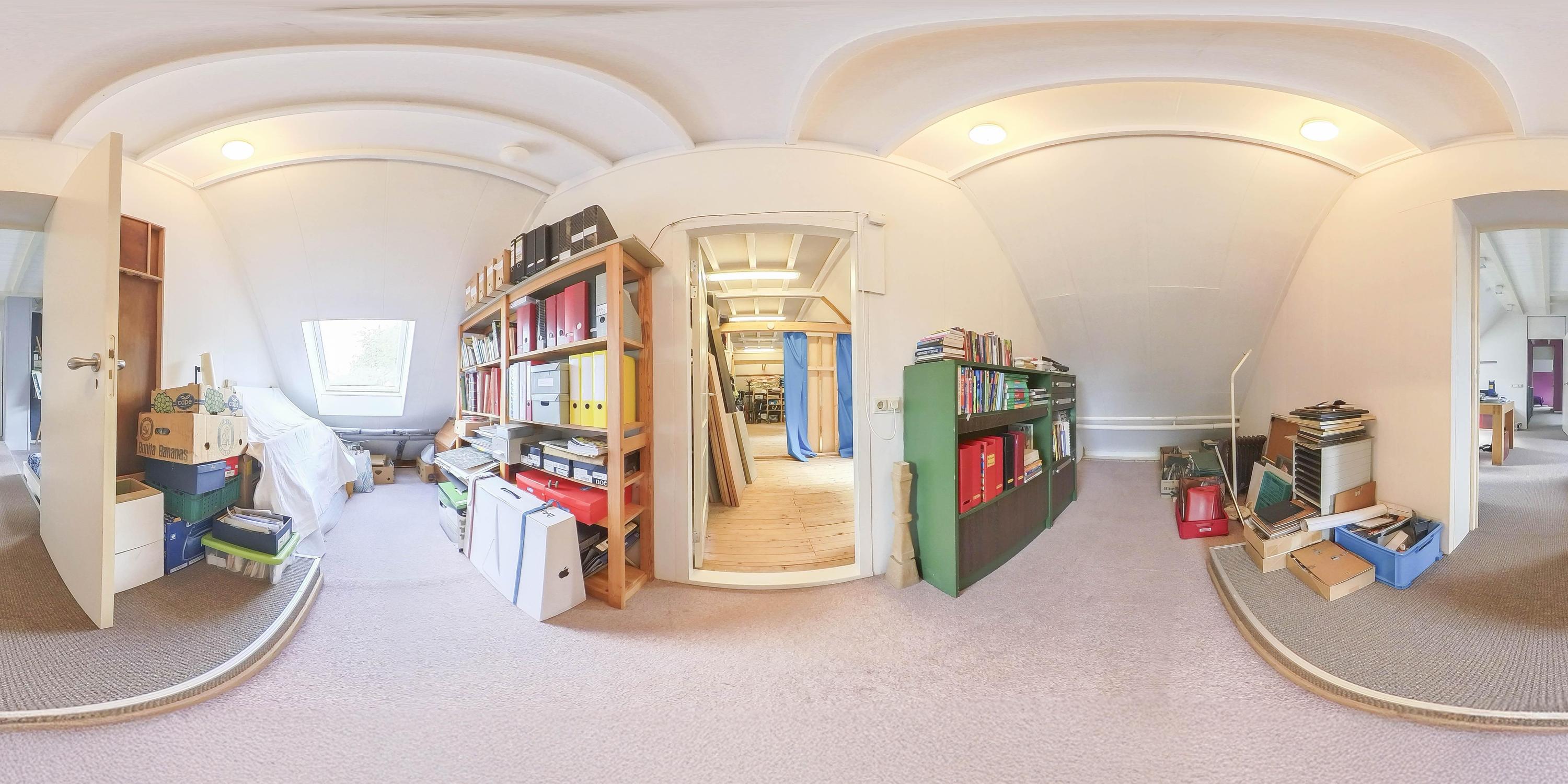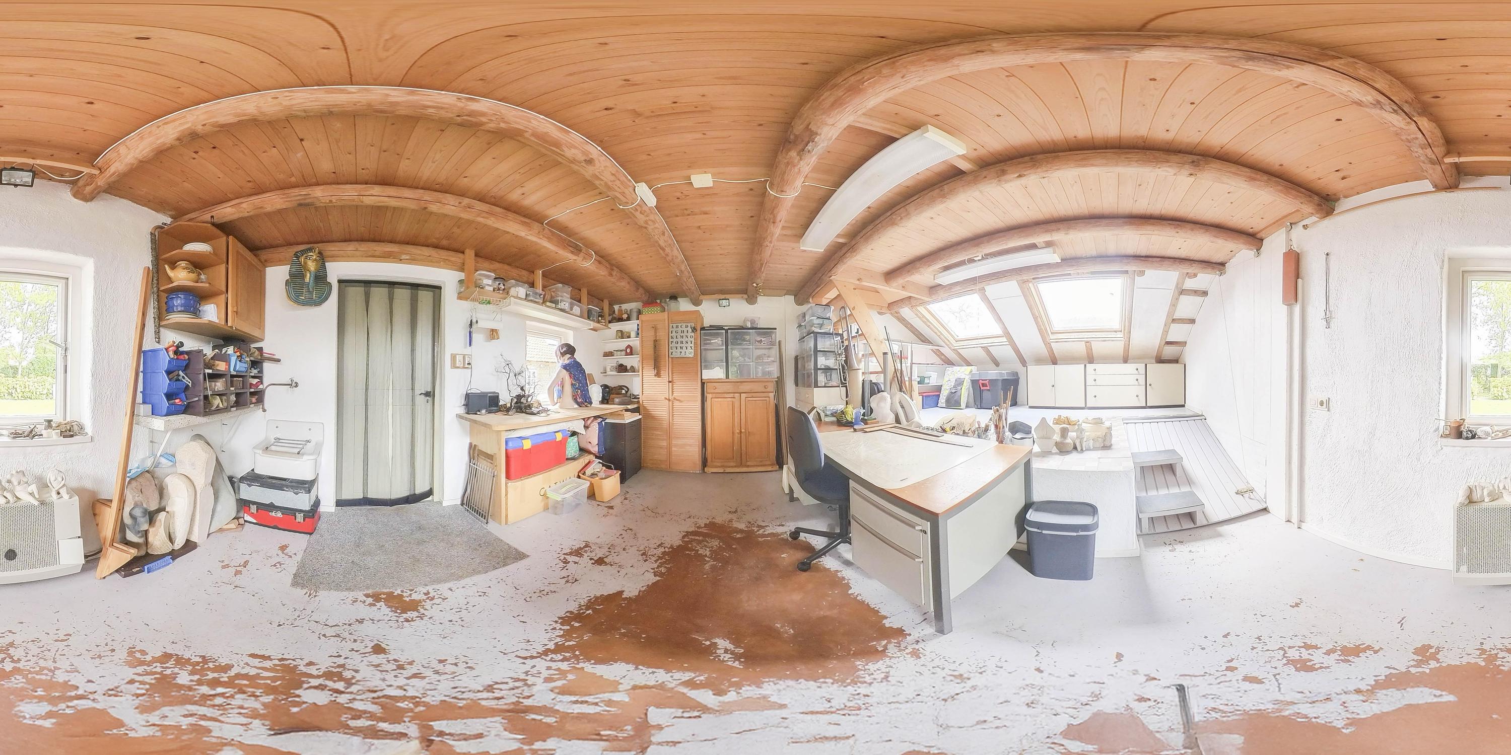 The part of this annex that is used as a studio has a concrete floor, two skylights at the rear, windows on three sides, and a sink with cold water connection. From here, a fixed staircase provides access to an attic space with a large Velux skylight and ample storage space. The studio space also has a man-sized wine cellar, accessible via a hatch with a fixed staircase. The studio space is also equipped with a gas wall heater.