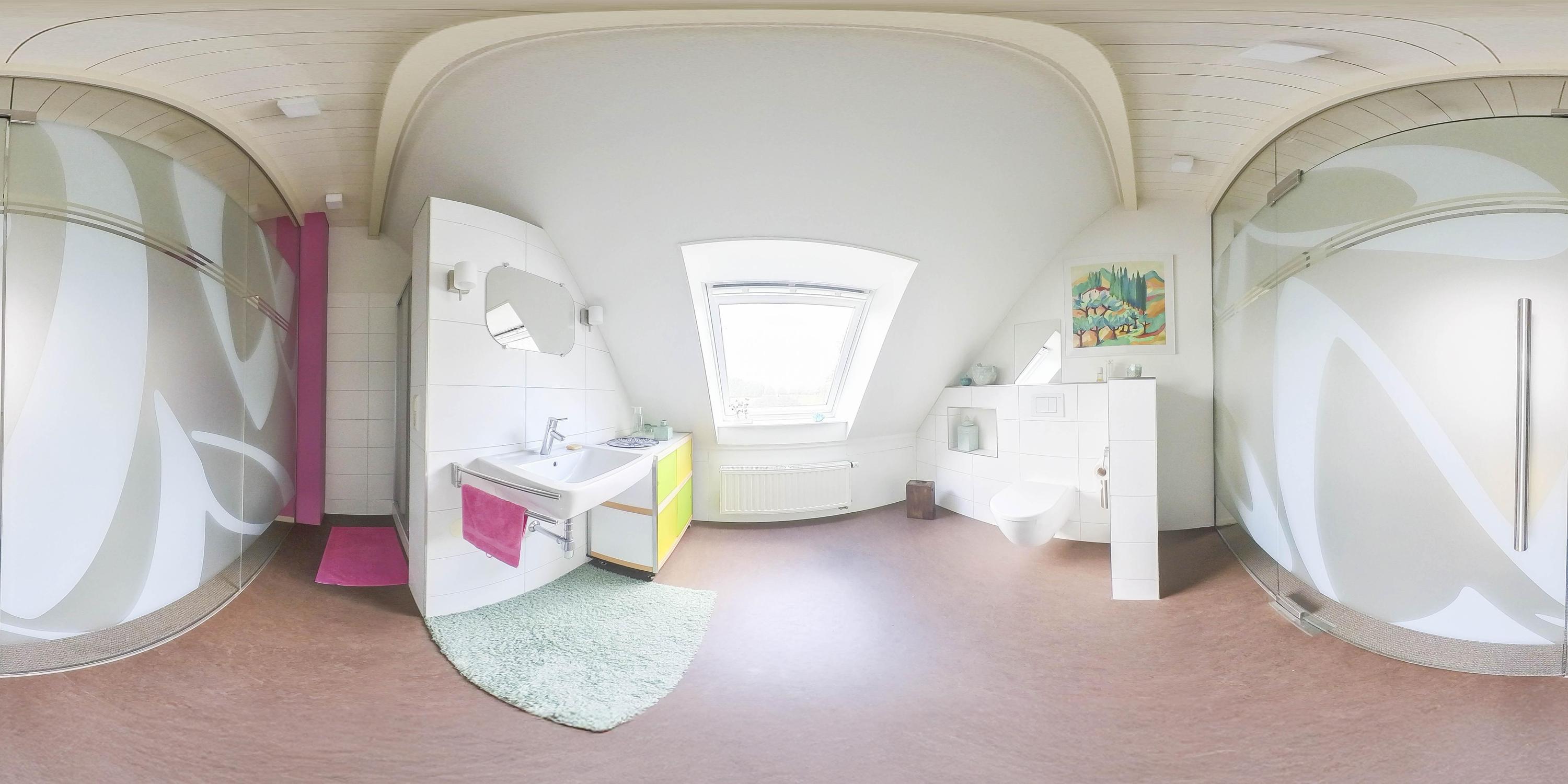 The bathroom on this floor is separated from the landing by a glass wall with a glass door. It has vinyl flooring and the walls are partially tiled. A large Velux skylight provides the necessary light. The bathroom is equipped with a wall-mounted toilet, a washbasin with mixer tap, and a shower cubicle with thermostatic tap, which can be closed off with a sliding door.