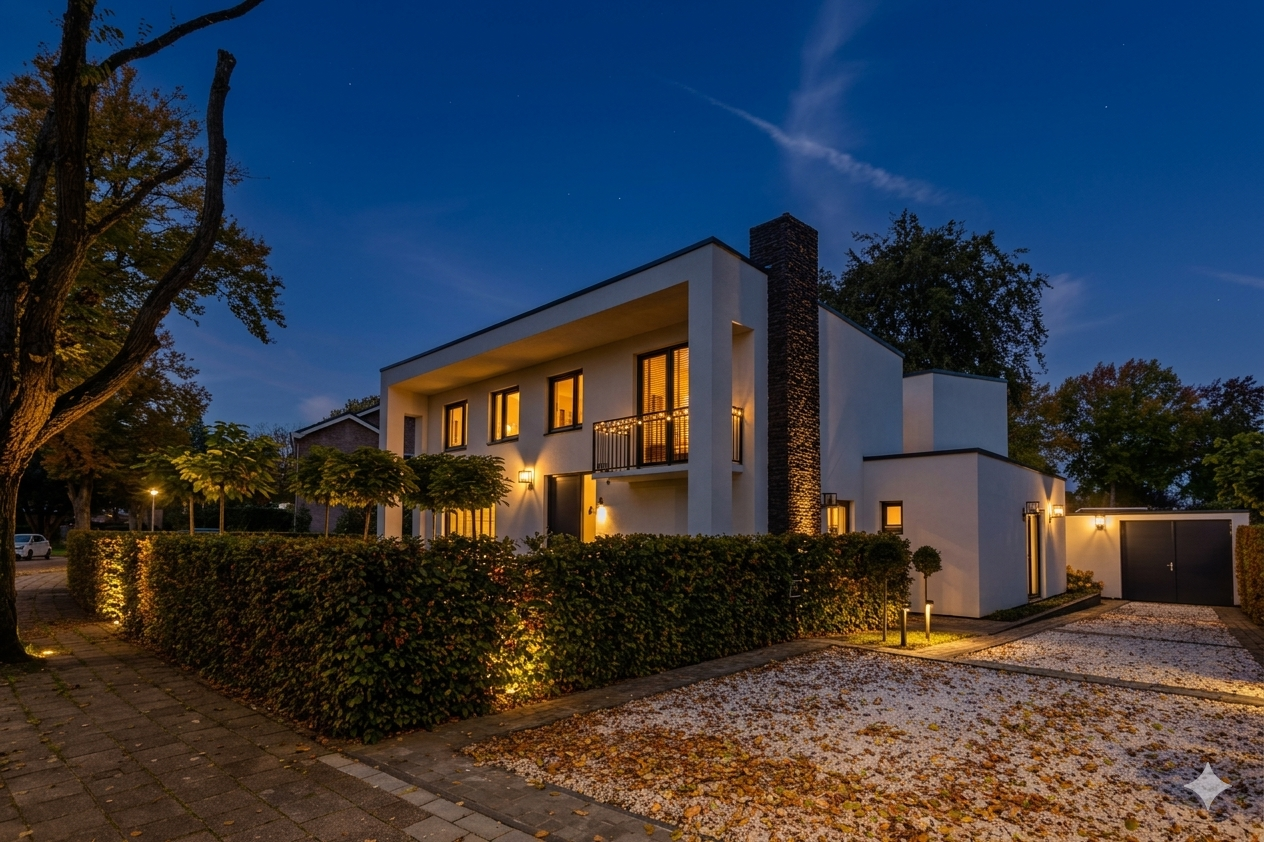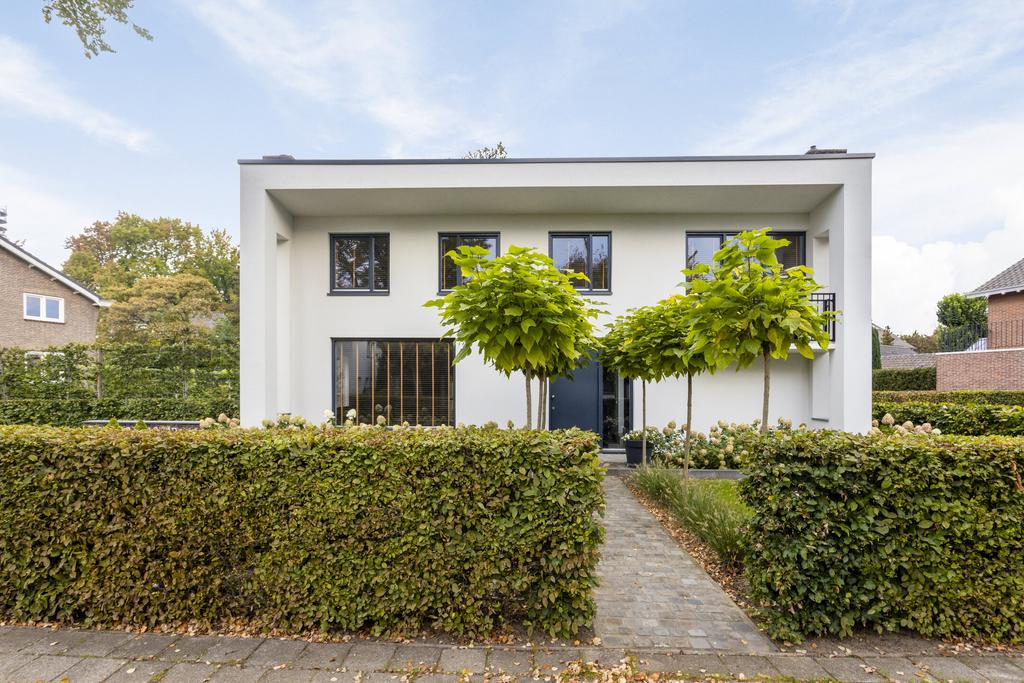 This unique, architecturally designed villa (Delft School style, 1957) offers a generous living space of approx. 235 m², featuring an outdoor swimming pool (2024), a separate guest house, and a garage. The entire property was completely renovated, modernized, and made sustainable between 2018 and 2021. This stunning home boasts three main living areas on the ground floor (living room, dining room, and kitchen-diner), three full-sized bedrooms, and a luxurious bathroom upstairs—all situated on a beautifully enclosed plot of 945 m² in the prime Roer-Zuid location.