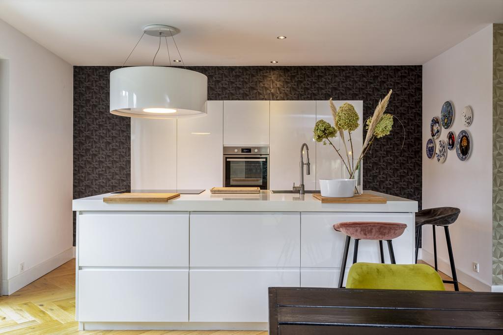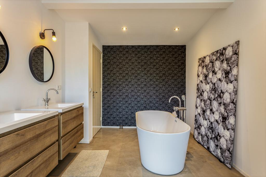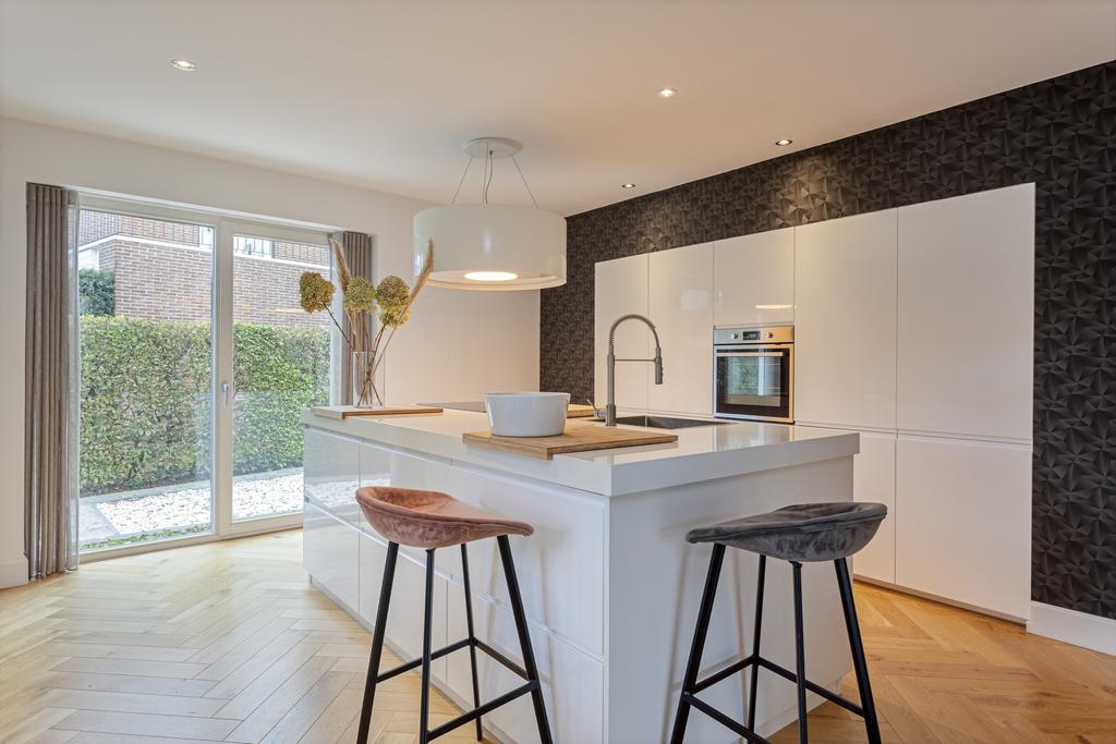 The side and rear gardens are accessible via four large sliding doors. All rooms are finished with either a modern concrete-look floor or a classic wooden herringbone floor. The kitchen is designed around a central island and is fully equipped with all necessary built-in appliances.