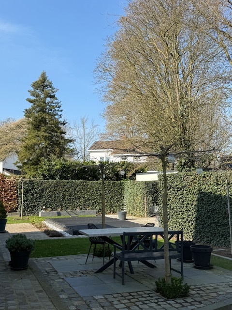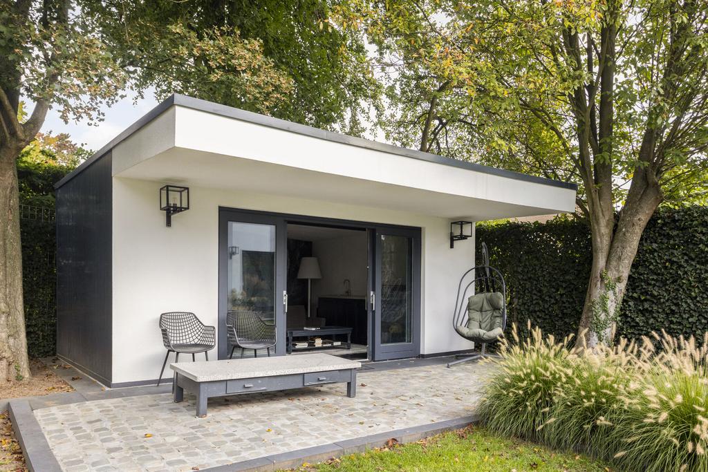 In addition to the detached garage at the back right of the garden, a dedicated guest house is located at the back left—ideal for guests, teenagers, or a home office. This space (approx. 20 m²) consists of a living/work area, a shower room, a toilet, a kitchenette, and its own covered terrace.