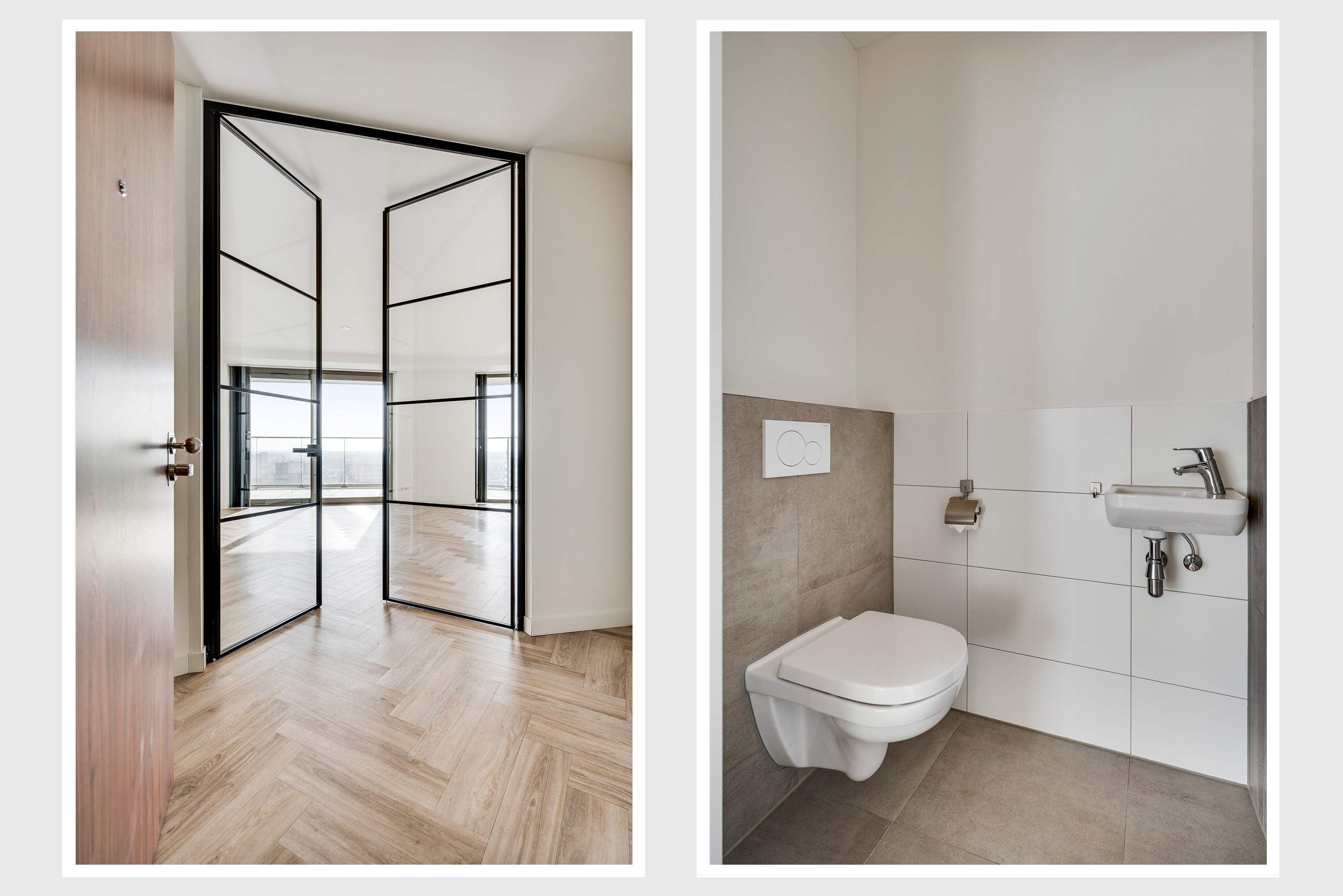 14th floor: Entrance/hallway with access to the various rooms including a separate toilet, the technology room, three bedrooms, two bathrooms and the living and dining room. The spacious living room with luxury kitchen provides space for a large party, with both a spacious seating and dining area. The kitchen is equipped with various Siemens appliances such as: combi oven/microwave, steam oven, induction hob with extractor fan, dishwasher, freezer, quooker and fridge. The floor-to-ceiling windows mean you always enjoy beautiful views.