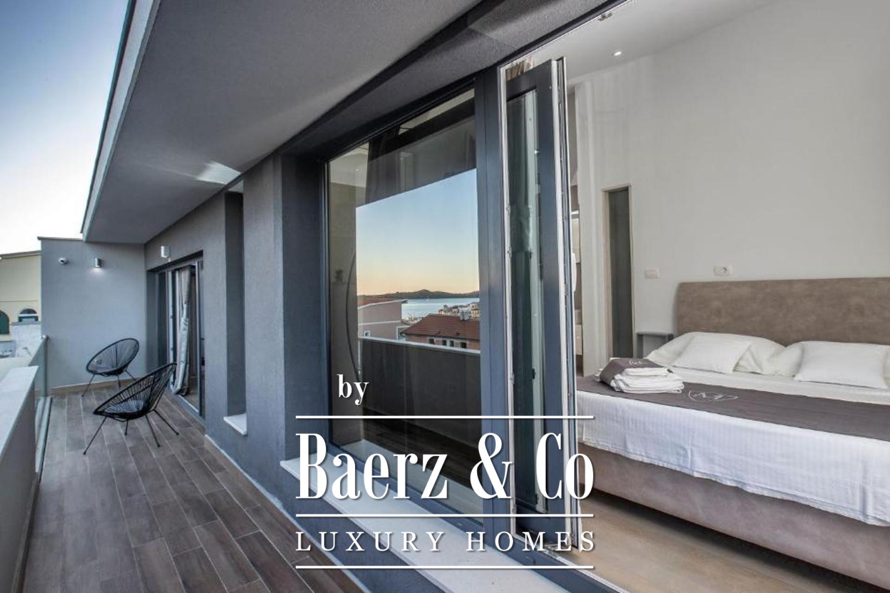 The upper level presents a luminous living space with a kitchen and dining area, two bedrooms, and two bathrooms, with each main room connecting to balconies oriented towards sea and pool views. Flexibility is integral, as the first floor can be separated into independent apartments to suit a range of lifestyles or hospitality needs. Refined finishes and premium furnishings underscore every detail, while thoughtful amenities include a tavern with barbecue, an inviting space for dining and gathering, and a sunlit yard. Three parking spaces complete the picture of relaxation and opportunity in Croatia’s coastal landscape.