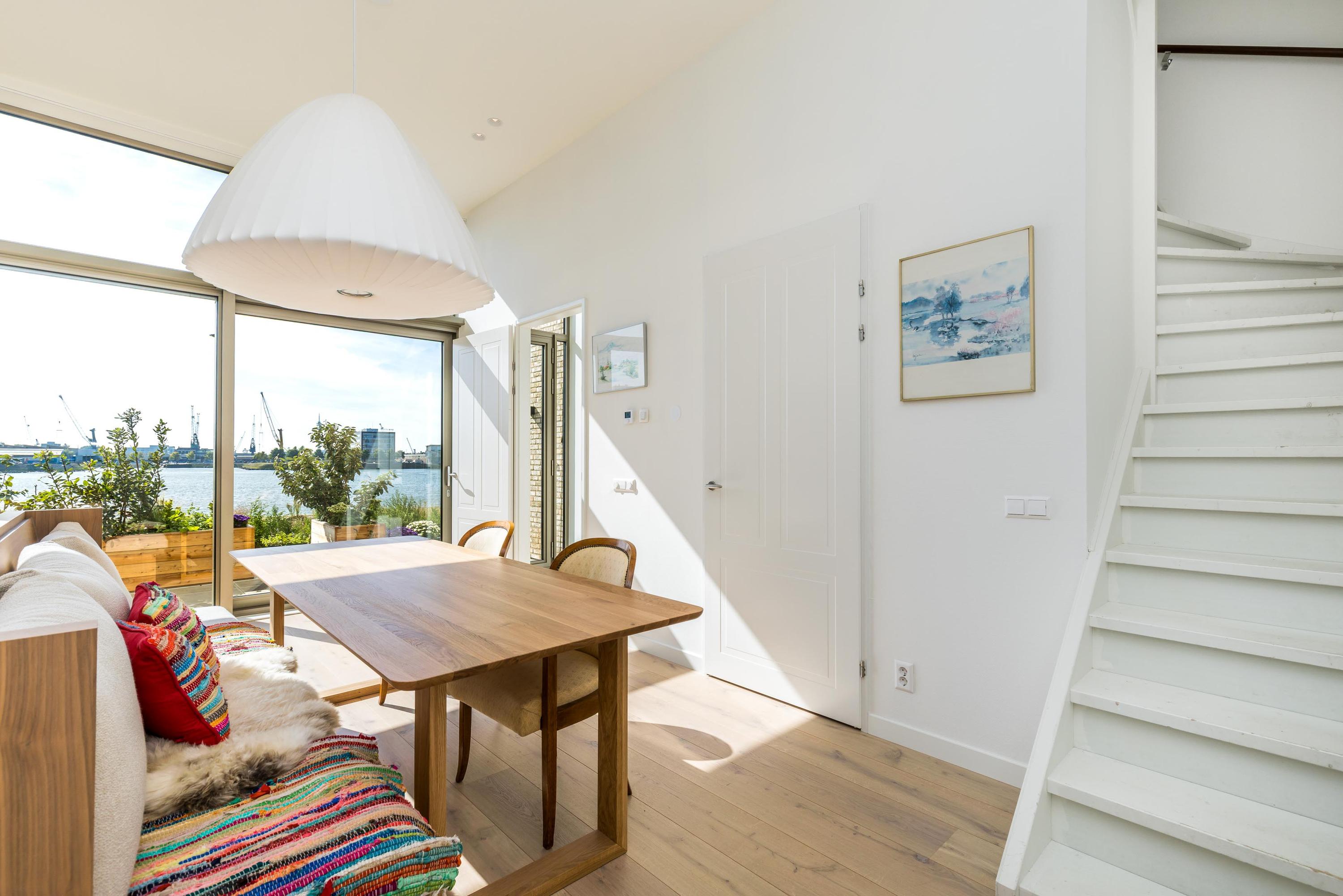 The first floor is designed as a living area and offers a generous living room with floor-to-ceiling windows, seamlessly integrating the waterfront view into your interior. All bedrooms and the living room overlook the Maas River. There are currently two bedrooms, but a third is easily possible.