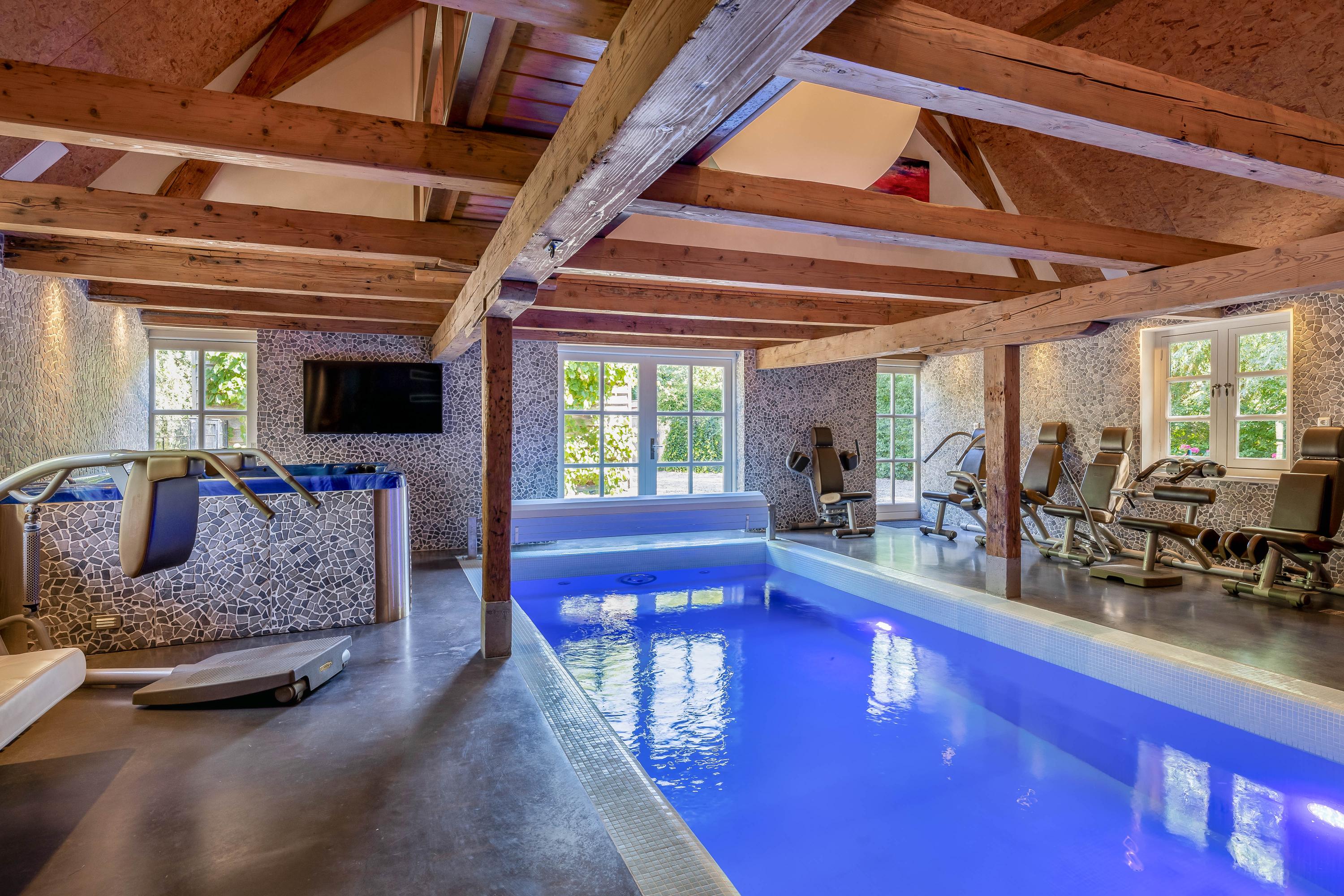 The absolute showpiece is the wellness area in the former stable. Here, a luxurious indoor pool has been installed with automatic cover, large jacuzzi, gym area, and preparations for a sauna – all surrounded by original stable windows and sturdy wooden beams.