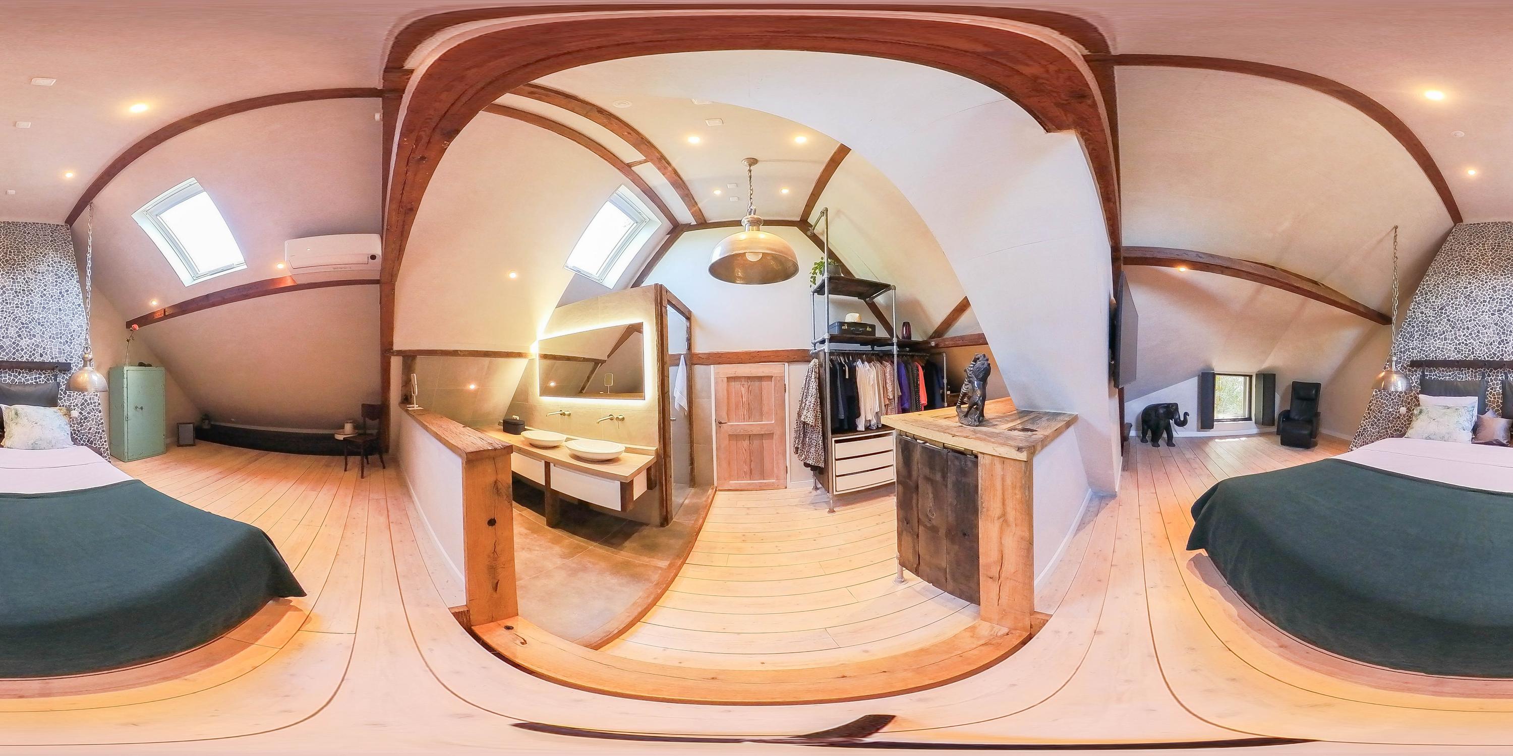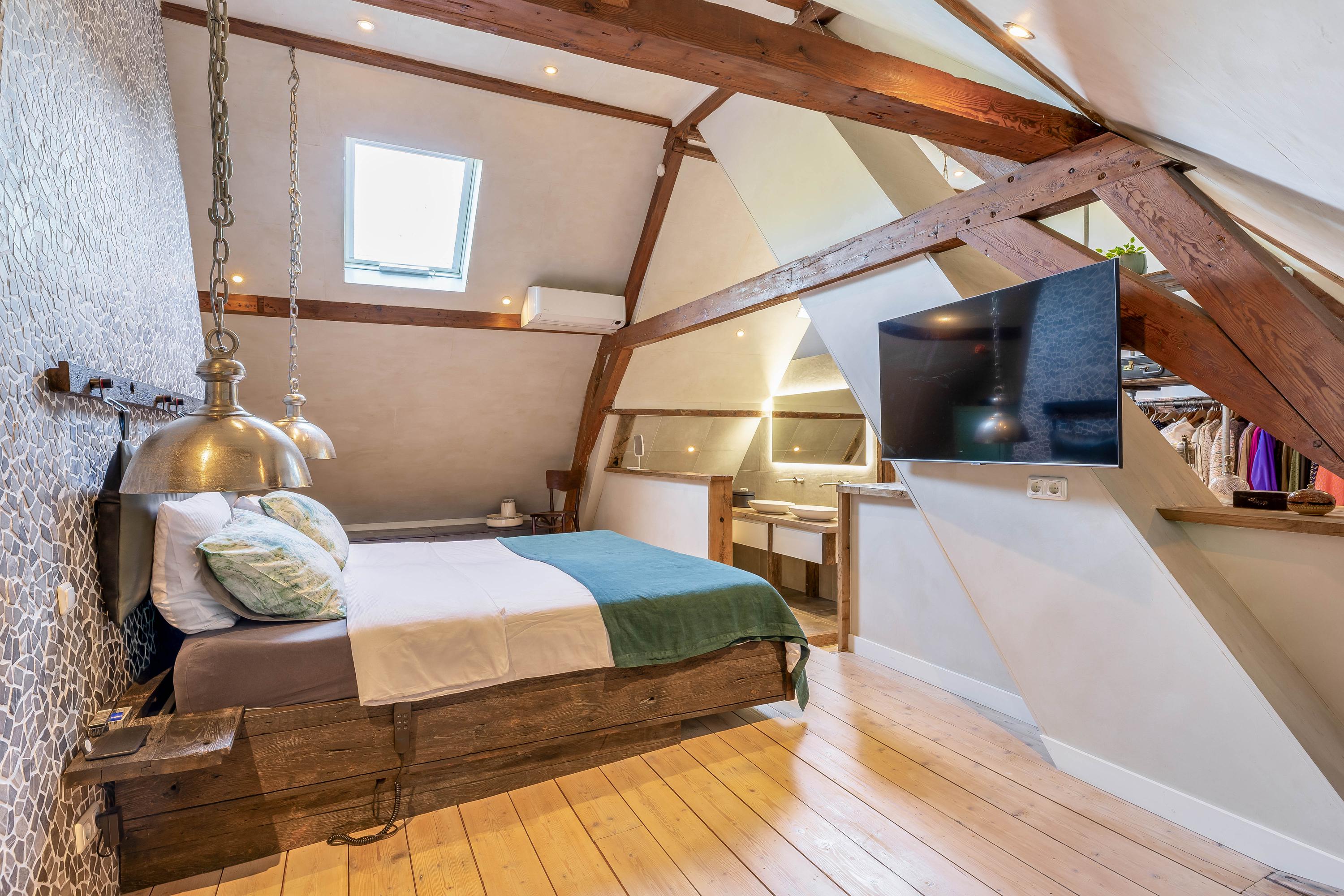 Beautiful staircase, spacious landing with dormer window, separate toilet and walk-in closet, expansive bedroom with 2 new skylights, en-suite bathroom (2020) with walk-in shower, 2 sinks and underfloor heating, entertainment room with billiards and cinema setup, which could also be used as a bedroom, and passage via footbridge over the pool to the rear bedroom with wooden floors.