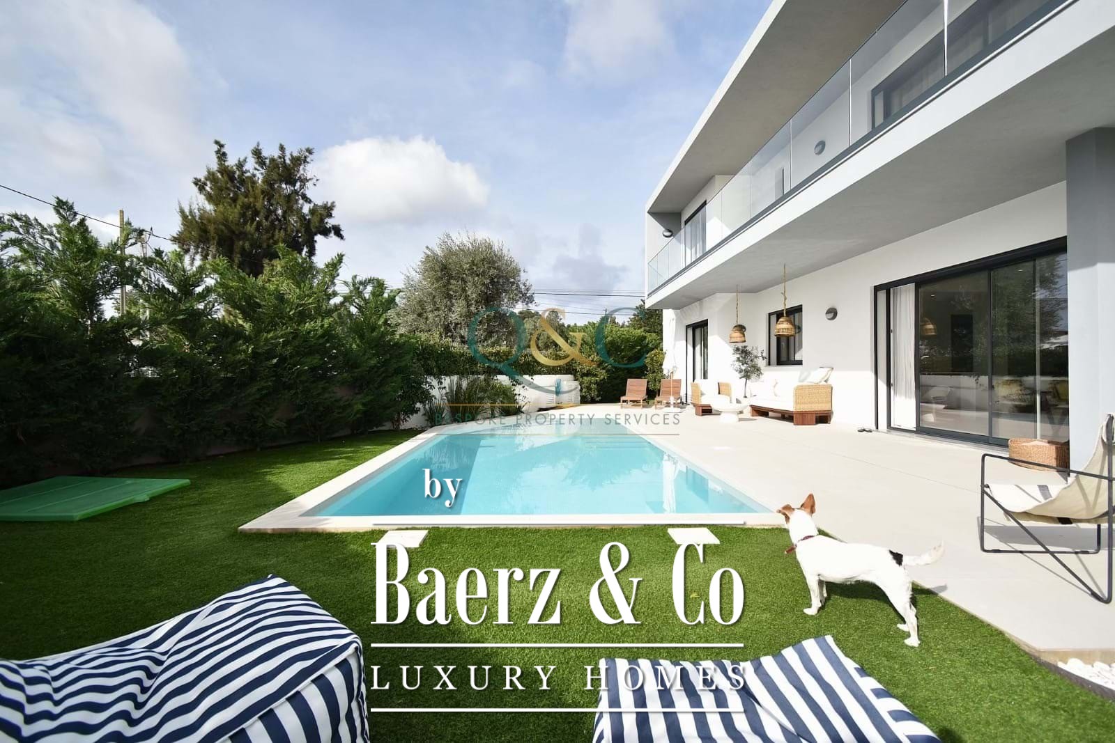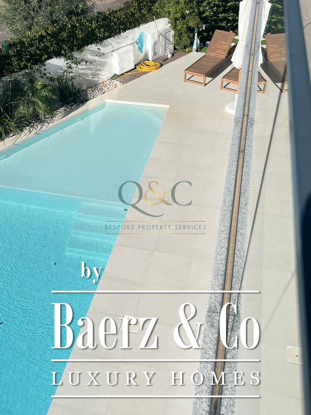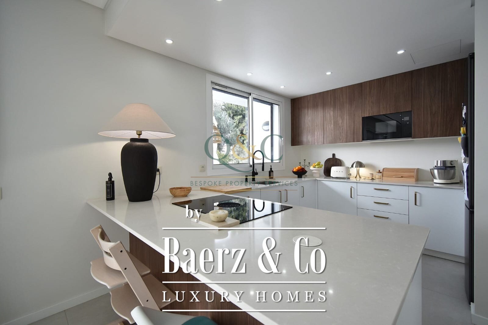 On the ground floor, an open living and dining room with an ethanol marble fireplace creates a soft rhythm between interior space and sunlight, complemented by central air conditioning. The open-plan kitchen, laundry, and pantry support daily living, while the patio invites relaxation beside the chlorine pool and a garden shaped for quiet enjoyment. Almost every room is oriented south and benefits from abundant natural light.