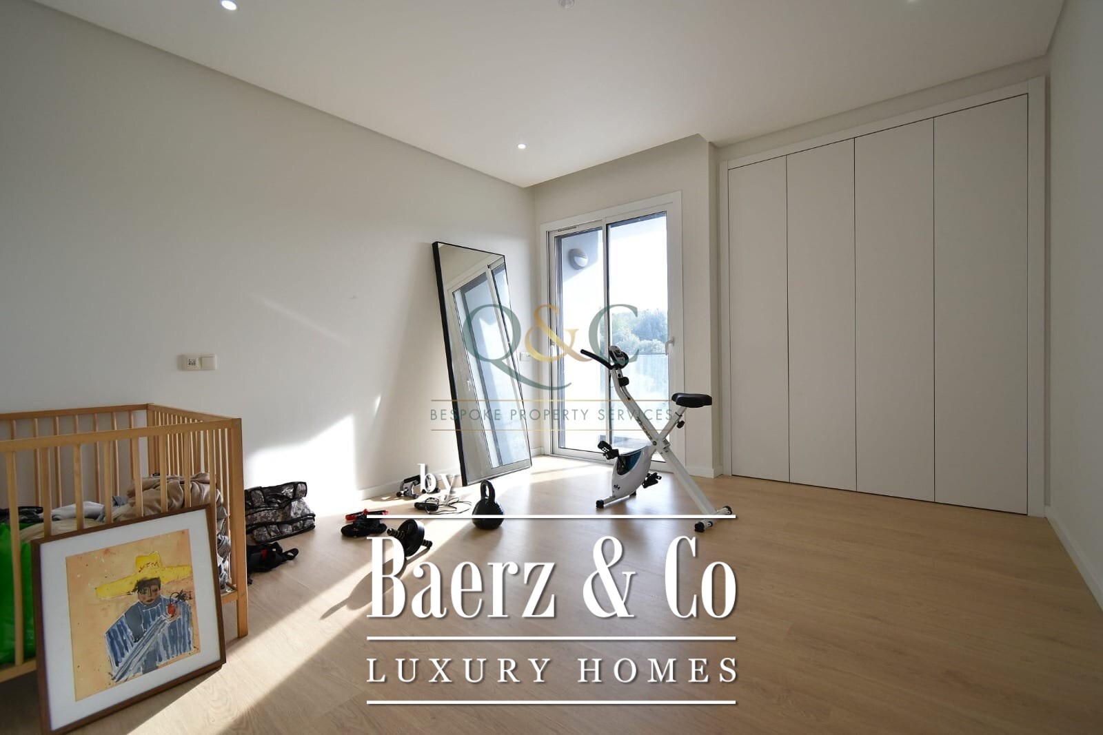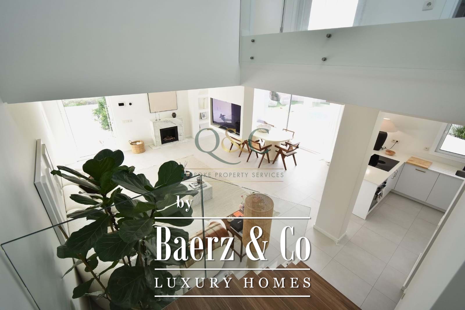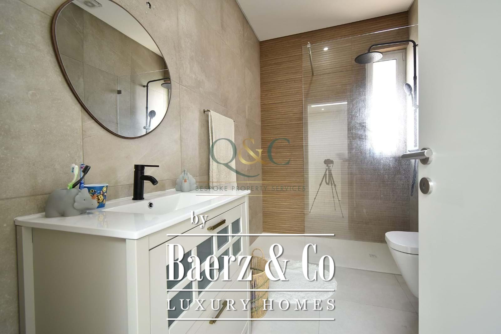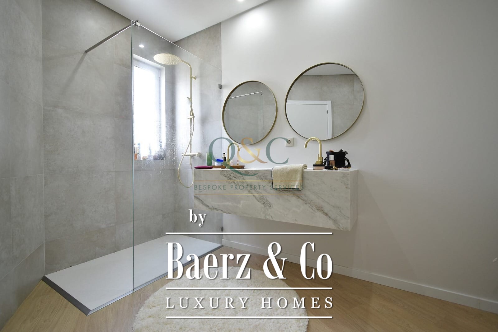 On the ground floor, an open living and dining room with an ethanol marble fireplace creates a soft rhythm between interior space and sunlight, complemented by central air conditioning. The open-plan kitchen, laundry, and pantry support daily living, while the patio invites relaxation beside the chlorine pool and a garden shaped for quiet enjoyment. Almost every room is oriented south and benefits from abundant natural light.