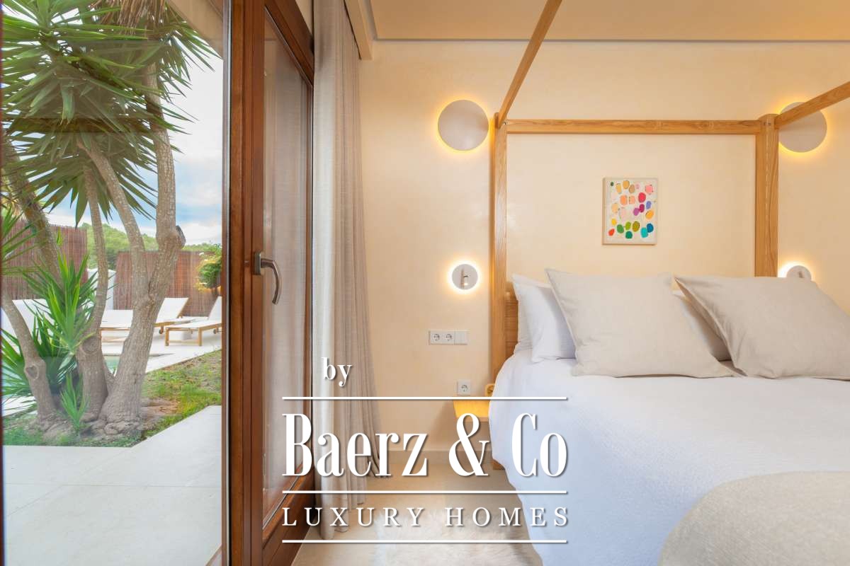 The SurroundingsA rare find in the heart of Ibiza - welcome to Santa Gertrudis, the most beloved and charming village in Ibiza. This delightful place is a favourite meeting point for locals, families, entrepreneurs, and lifestyle lovers from around the world. The lively village square with its cafés, art galleries, and excellent restaurants is just a short walk away. Everything here feels warm and welcoming, with an atmosphere that is both stylish and relaxed. Thanks to its central location, you can reach the most beautiful beaches, Ibiza Town, and the airport in no time. Santa Gertrudis offers the best of Ibiza: tranquillity, beauty, gastronomy, and authenticity.The ApartmentThis beautiful ground-floor apartment with a total of 129 m² exudes a warm and exclusive atmosphere. The 57 m² interior is designed with great attention to detail, combining comfort with a unique and stylish appearance. The living room forms the heart of the home and connects to the outdoor space through large doors, seamlessly blending indoor and outdoor living.