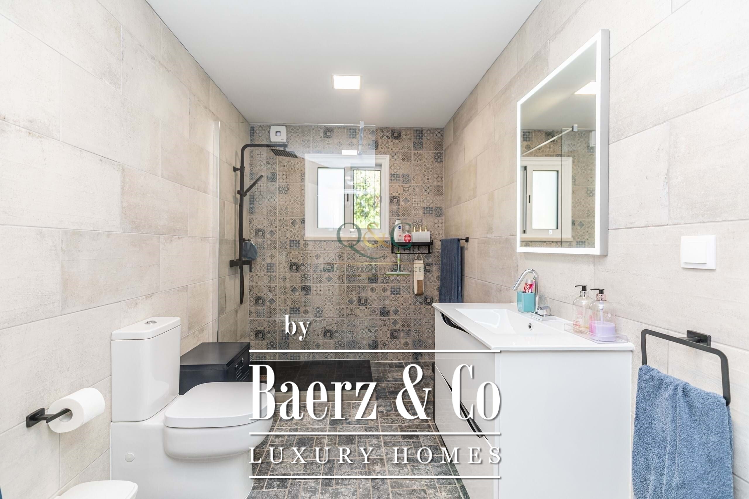 The villa internally is light & spacious with the benefit of a lovely open sitting/dining room with a wood burner, sliding doors to the terrace, 4 wired ethernet point for a TV system or if you work from home. The modern kitchen with extensive cabinets benefits from an induction hob & under-counter lighting as well as a good range of appliances & has the benefit of a door to outside. To the ground floor there are two double bedrooms & two bathrooms each with underfloor heating, Bluetooth music mirror, AIRsteril air purifying unit & under cabinet lights. Ascend the stairs to the first floor to a further double bedroom with its own private outside terrace & external stairs.