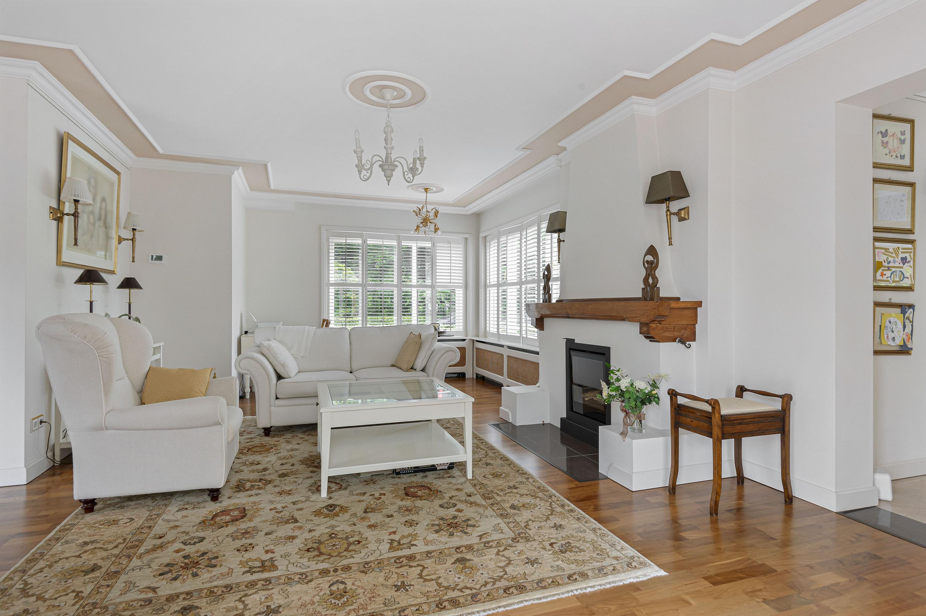 Entrance into very spacious hall, attractive stained glass windows, toilet and sunken wardrobe. The living room is arranged in L-shape, has lots of light, attractive gas fireplace and has a beautiful wooden parquet floor. The conservatory and second living room were later built so there is a lot of extra space created which gives multiple possibilities. The conservatory and second living room have a neat tiled floor with underfloor heating. The kitchen is located at the front of the house which also provides access to the spacious utility room.