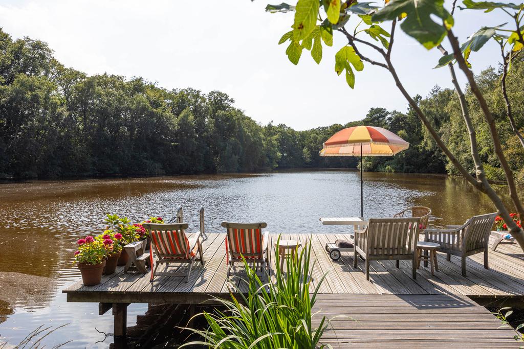 The landscaped estate extends to 5 hectares and borders the private Vegelin woodland, including a large pond. The grounds feature a terrace, a historic tea pavilion dating from circa 1900, a waterside gazebo and a carriage house with plans for conversion into additional guest accommodation or residential space with a separate driveway.