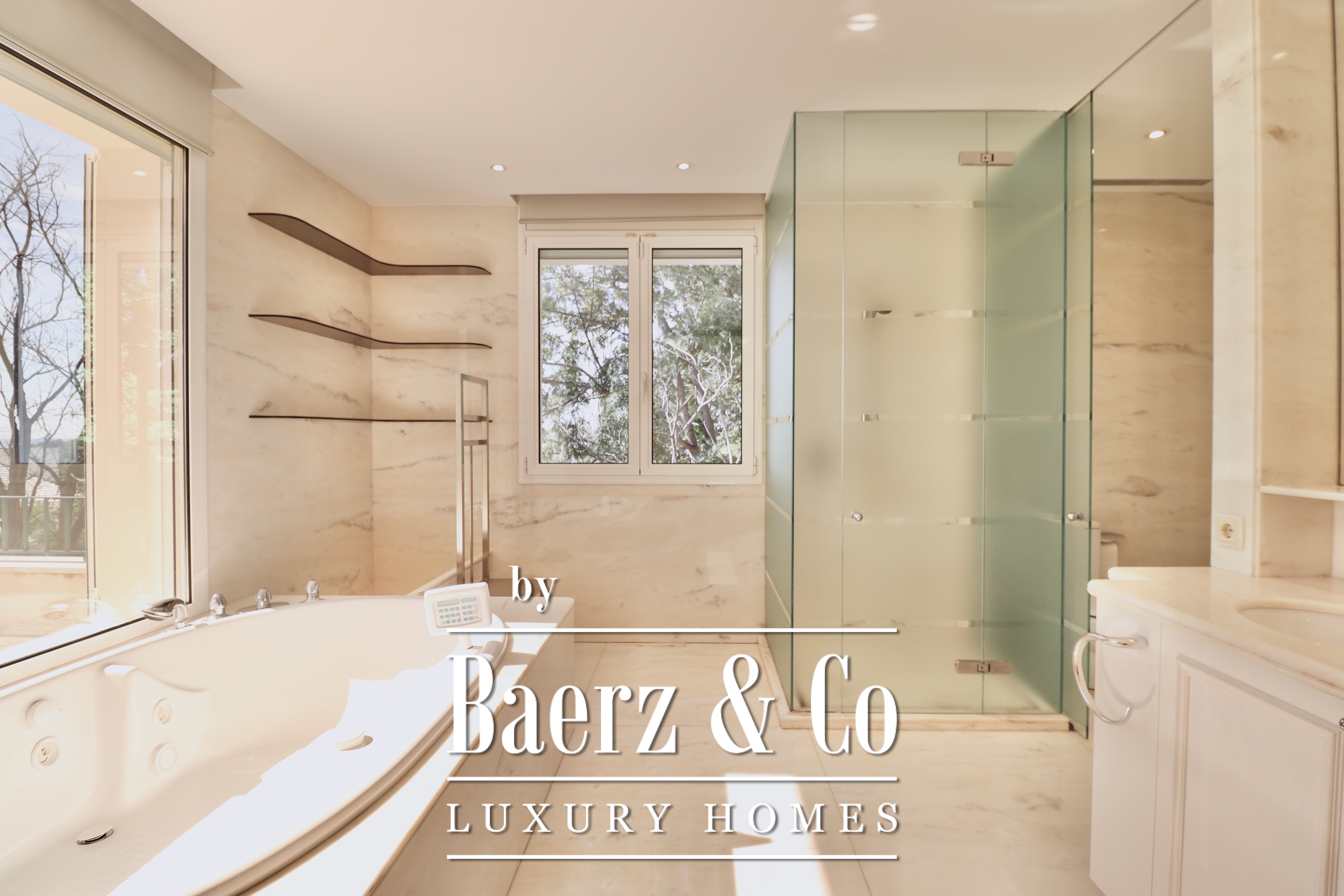 Designed for discretion and comfort, the villa unfolds across three levels, connected by a private lift. The main level opens with a refined entrance hall leading to a fluid living space, including living and dining rooms, a media zone, and a fully equipped kitchen with an adjoining service area and dedicated office. Five bedrooms and eight bathrooms allow for both family intimacy and entertaining on a generous scale.