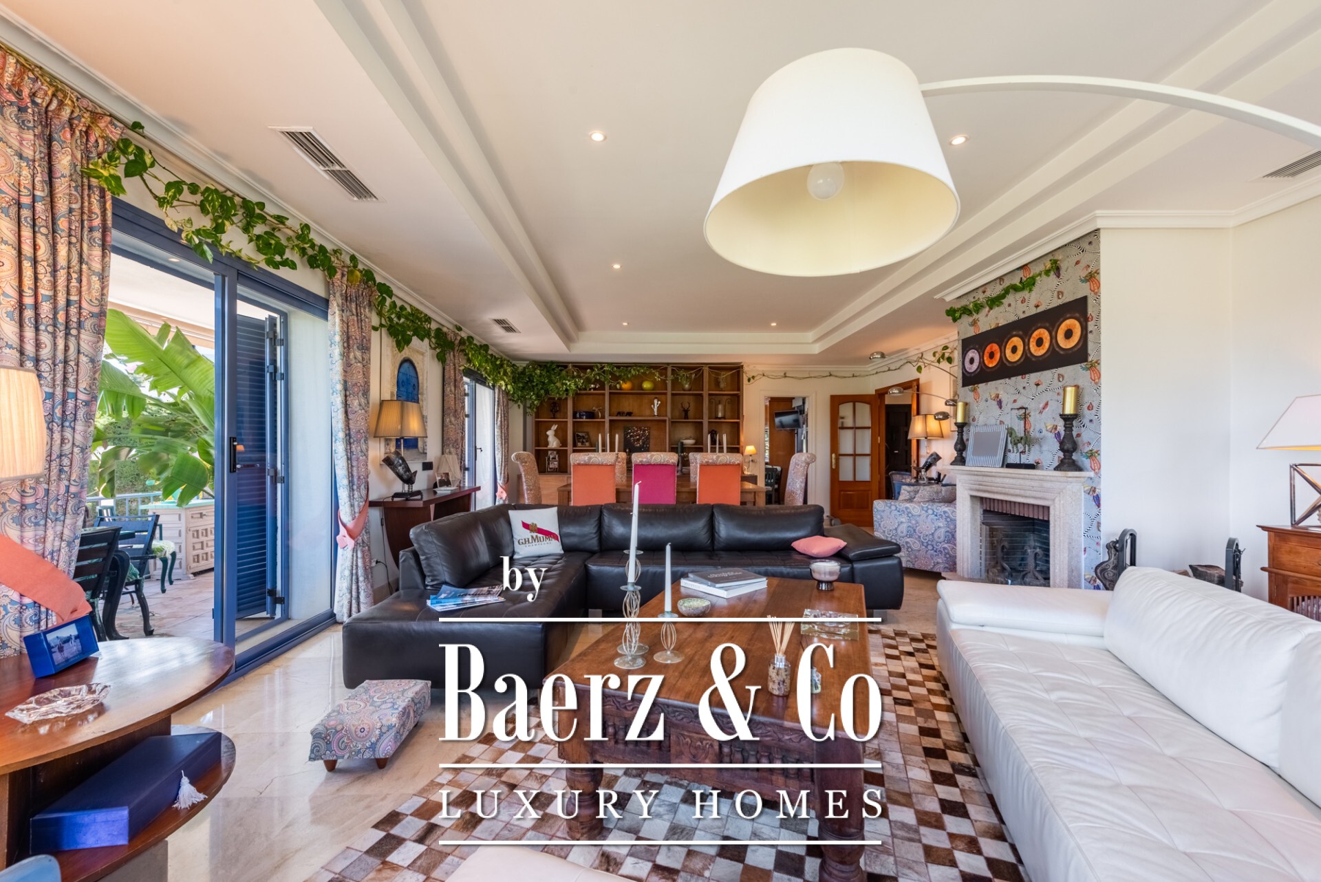 This villa features six bedrooms and five bathrooms across three floors, including a distinct master suite with a walk-in dressing room and en-suite bath, as well as a separate guest area. The ground floor connects a fully fitted kitchen, a dining room designed for gathering, and a living room with fireplace, each opening to covered and sun-drenched terraces for seamless indoor-outdoor living. Central heating by radiators and air conditioning ensure year-round comfort.