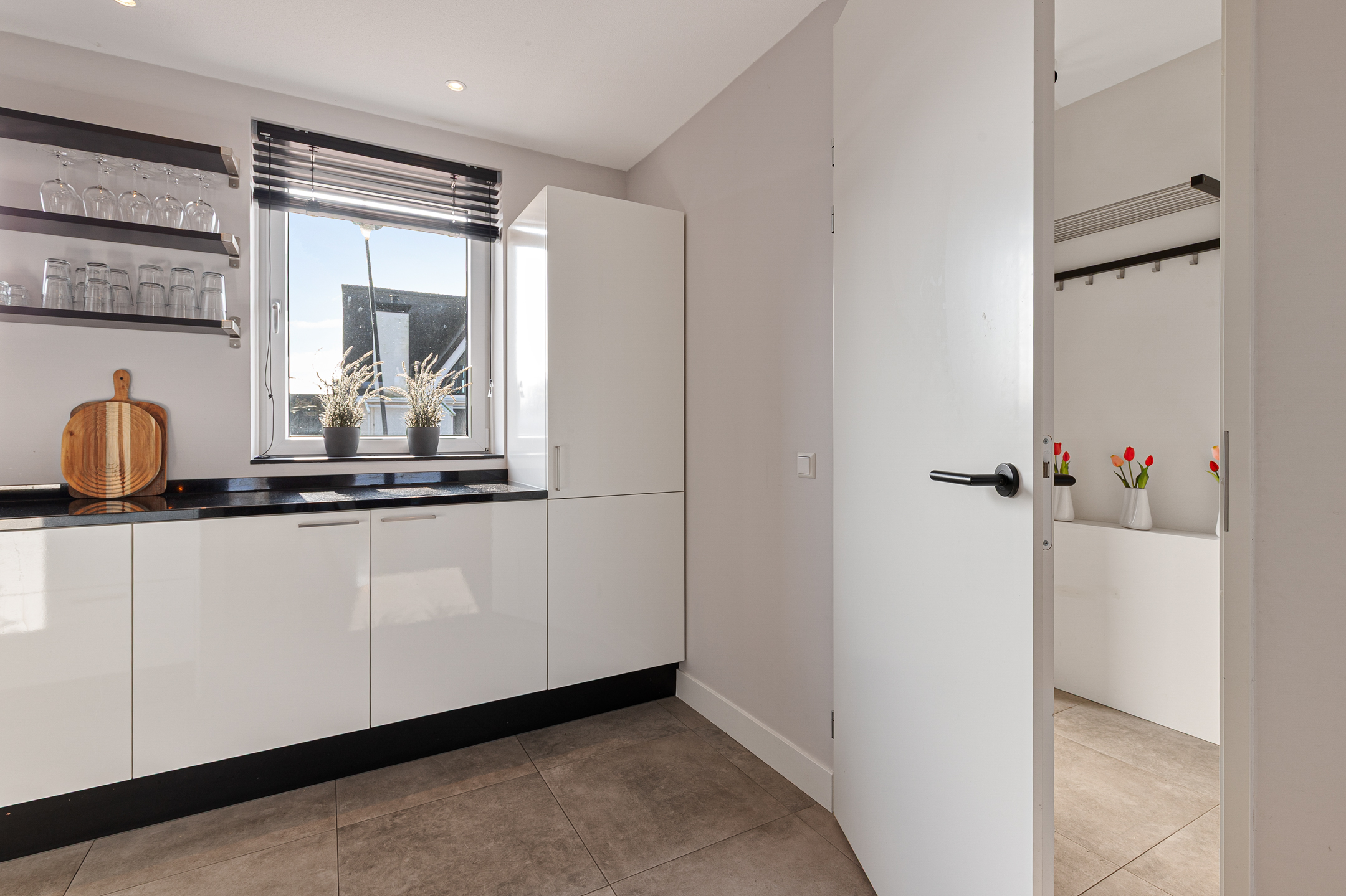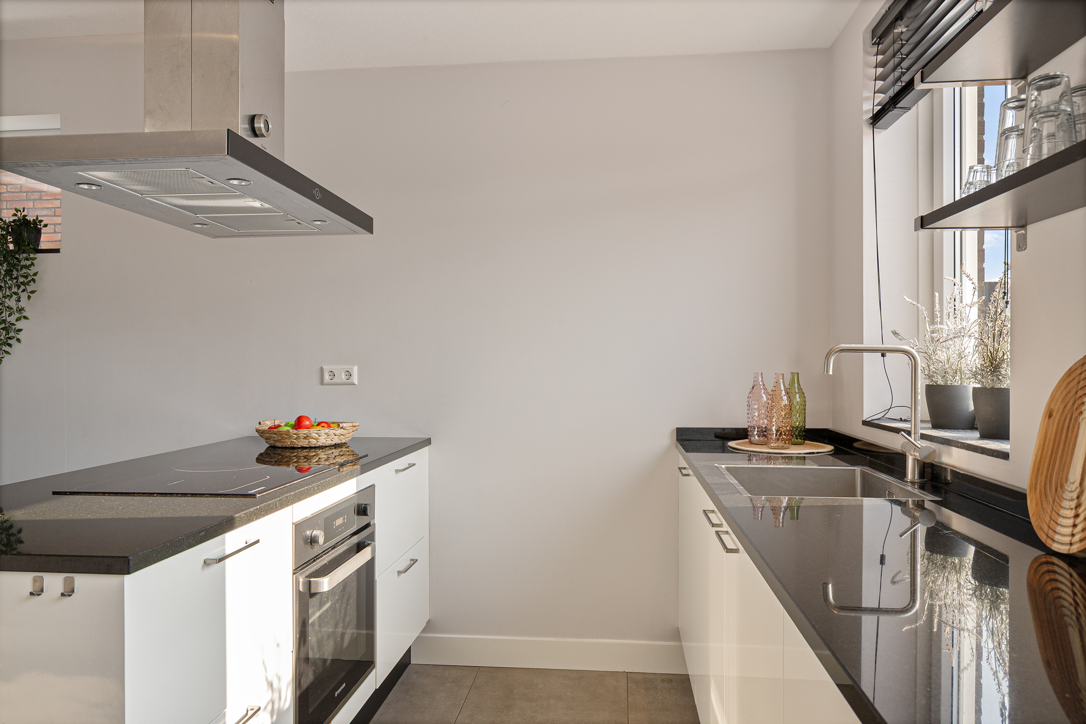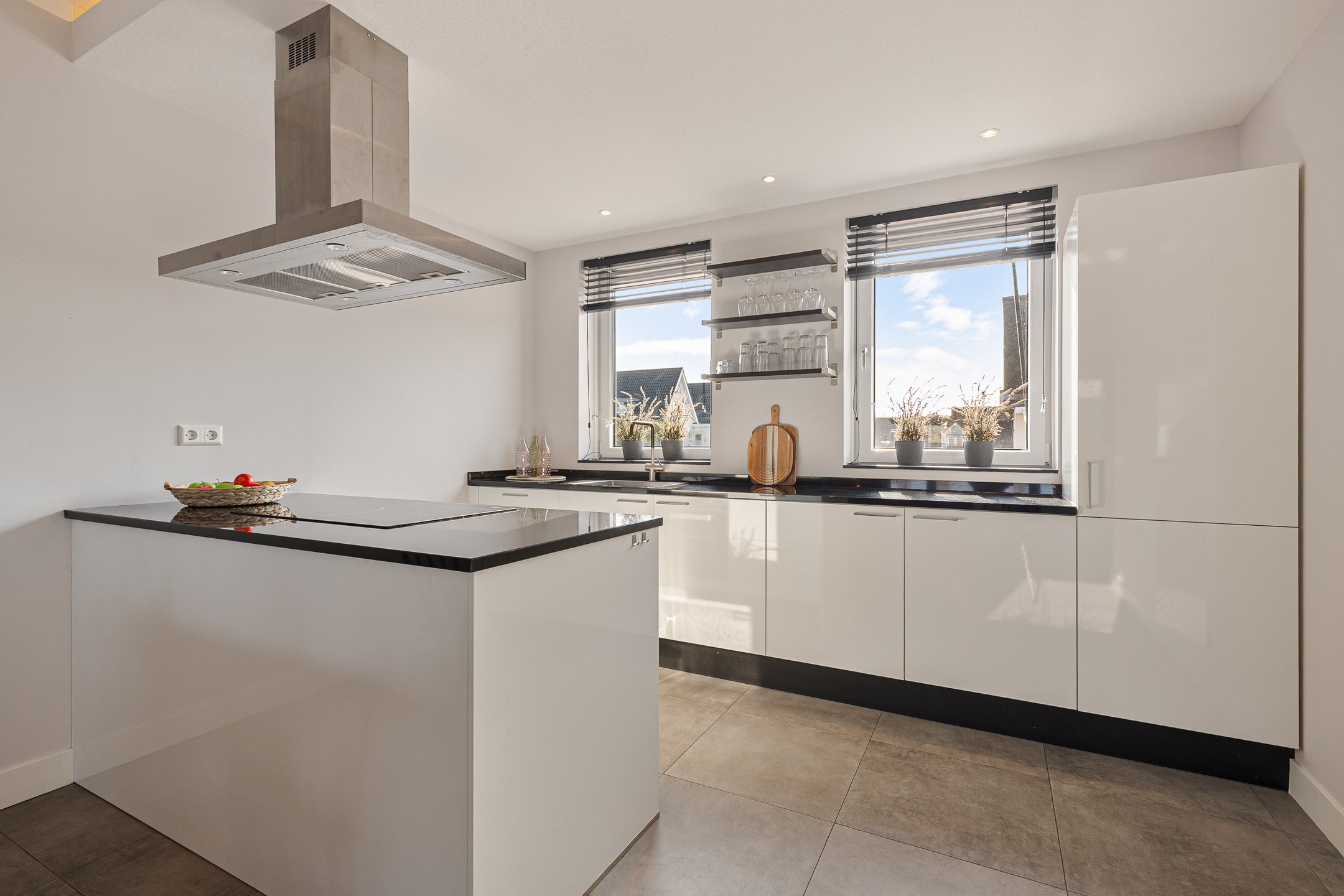 De luxe open keuken vormt een centraal onderdeel van de living en is uitgevoerd met moderne inbouwapparatuur en ruime werkbladen. Vanuit de keuken heeft u speels zicht op de waterpartij aan de straatzijde.