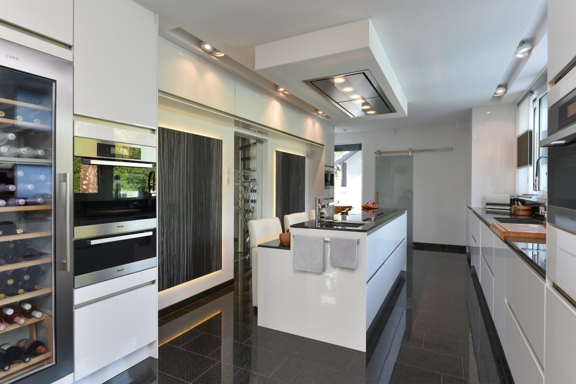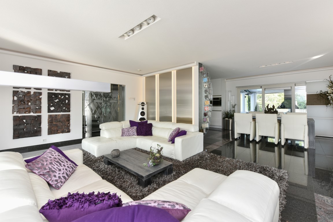 De living is comfortabel ruim en licht van opzet, beschikt over een Cinewall en een 3-tal schuifpuien richting de tuin rondom. Vanuit de eethoek loopt de sfeer vloeiend over richting de open woonkeuken met alle luxe van dien. Denk aan een royaal granieten werkblad, hoogwaardige inbouwapparatuur, granieten vloeren, inbouwverlichting en bovenal een zeer neutrale kleurstelling.