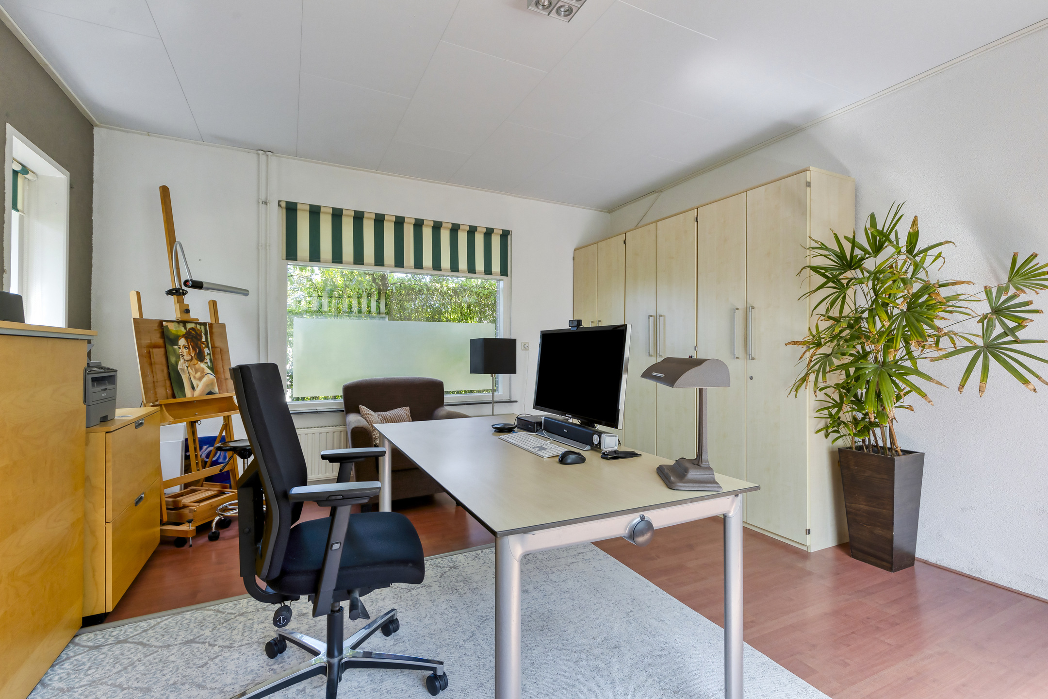 vanuit de tussenhal een trap naar de 1e verdieping, deur naar tuin/terras en schuifdeur naar bijkeuken en vanuit de hal/entree een trap naar de verdieping boven de slaap-/werk-/hobbykamer.