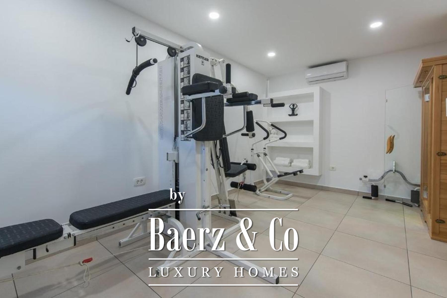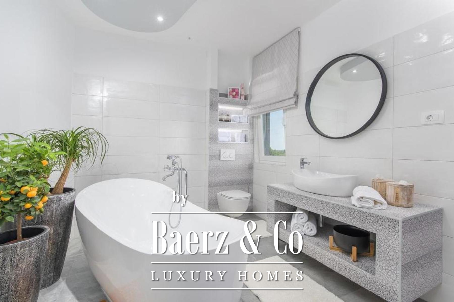 The ground floor flows between expansive interiors and outdoor areas, with a 30 m² swimming pool, jacuzzi, two covered terraces, and a living room seamlessly connected to the garden. The kitchen and dining area open to their own terrace, inviting gatherings in both sun and shade. The basement houses a gym and sauna, fostering relaxation and well-being. On the first floor, three bedrooms and three bathrooms enjoy terrace access, revealing soothing views of the surrounding nature and distant sea. The attic provides two further bedrooms and two bathrooms, ensuring privacy for guests or family members; a mezzanine features an en-suite bedroom for added comfort.