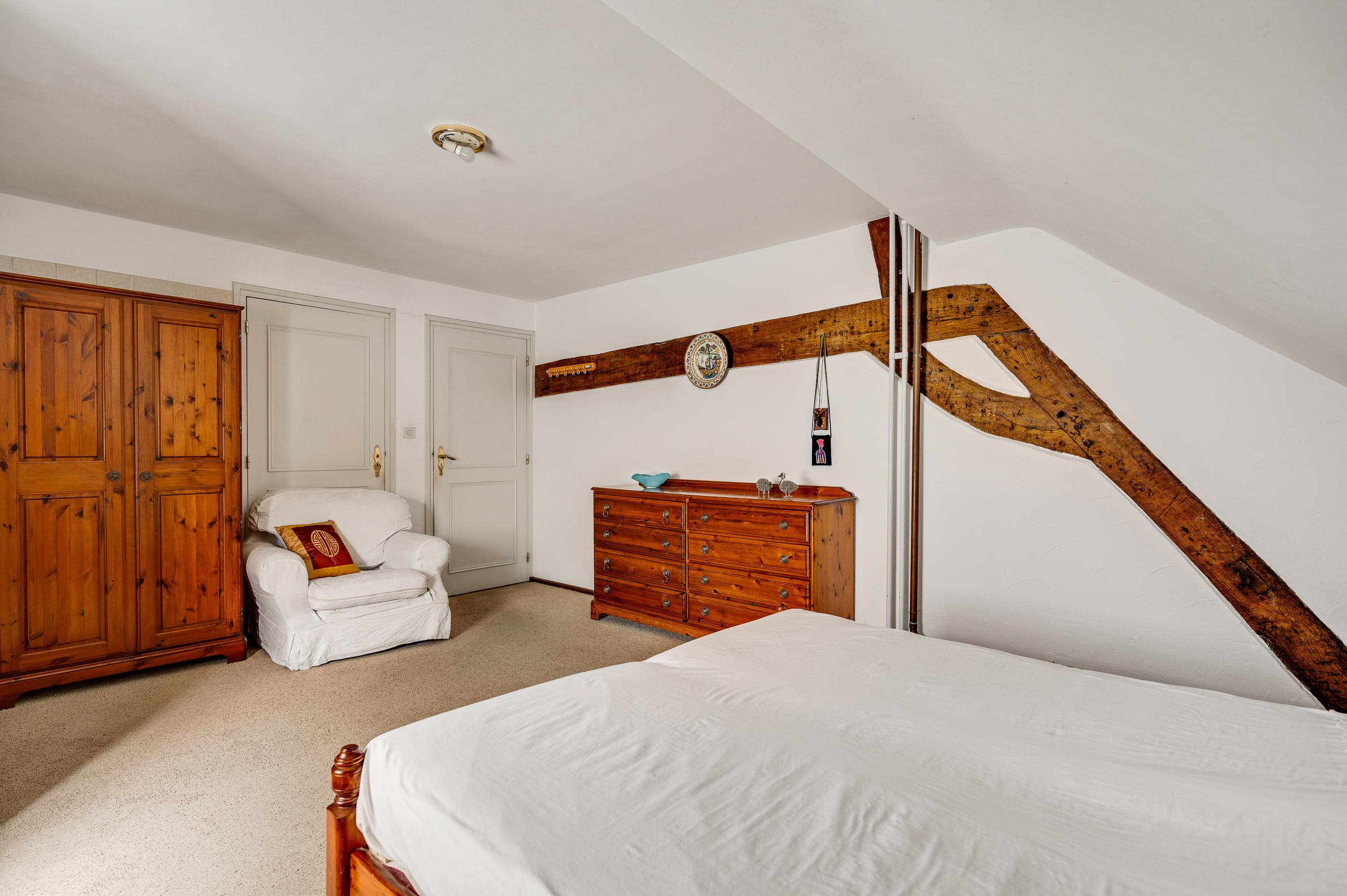 The spacious hall with a fireplace and meter cupboard provides access to the toilet, a bedroom with a separate bathroom, and the kitchen. The stairs to the first floor are also accessible from the hall. The hall also served as the B&B's former living room. This space can be used for various purposes.