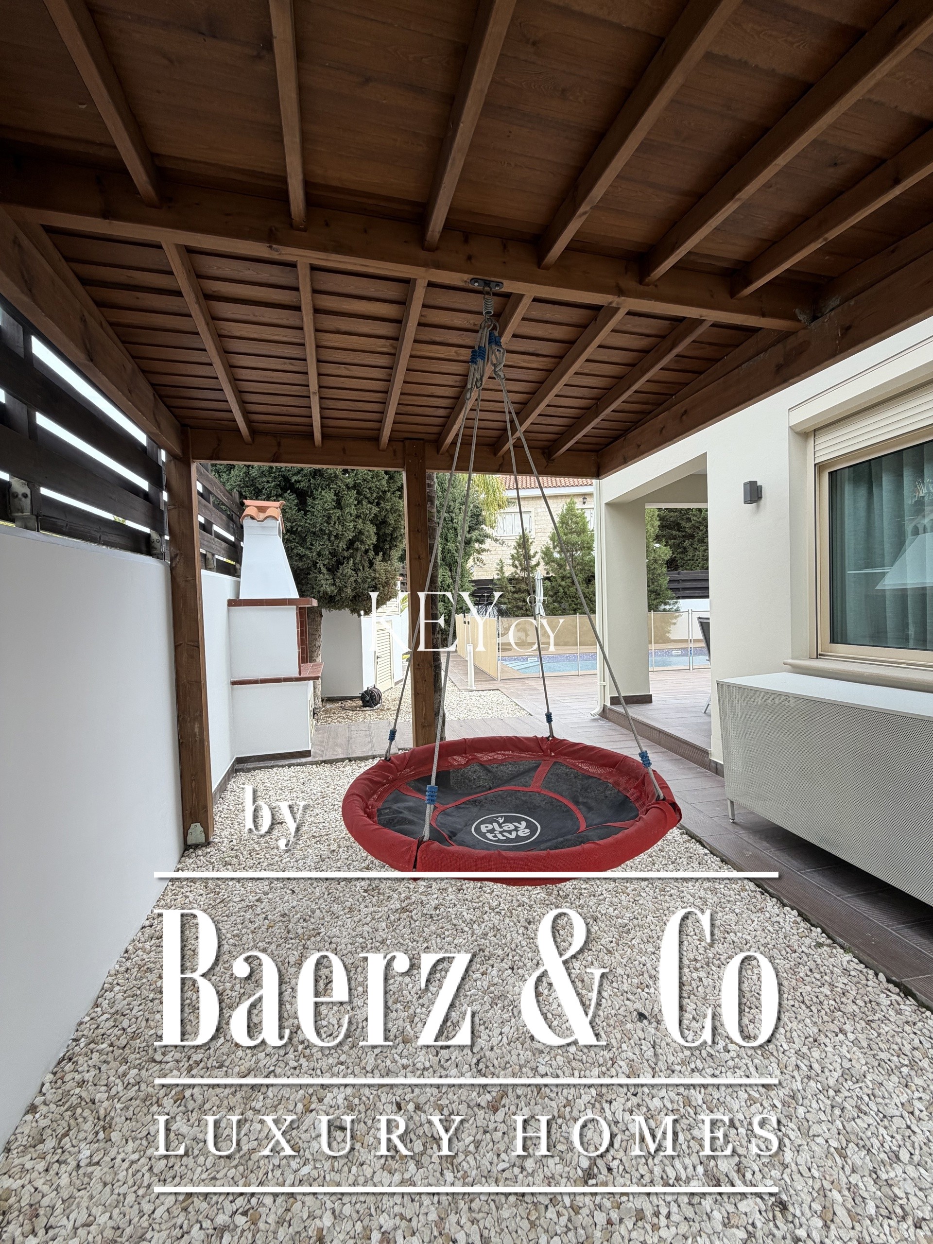 Bright and airy, the home benefits from air conditioning, diesel central heating, and energy-efficient double-glazed windows crafted from aluminium. Additional features include a laundry and storage room, wine fridge, generous security measures with a security door and CCTV, and sound and thermal insulation. Outdoors, a private swimming pool sits within the landscaped garden, harmonizing with the quiet, residential setting. Two covered parking spaces complete the offering.