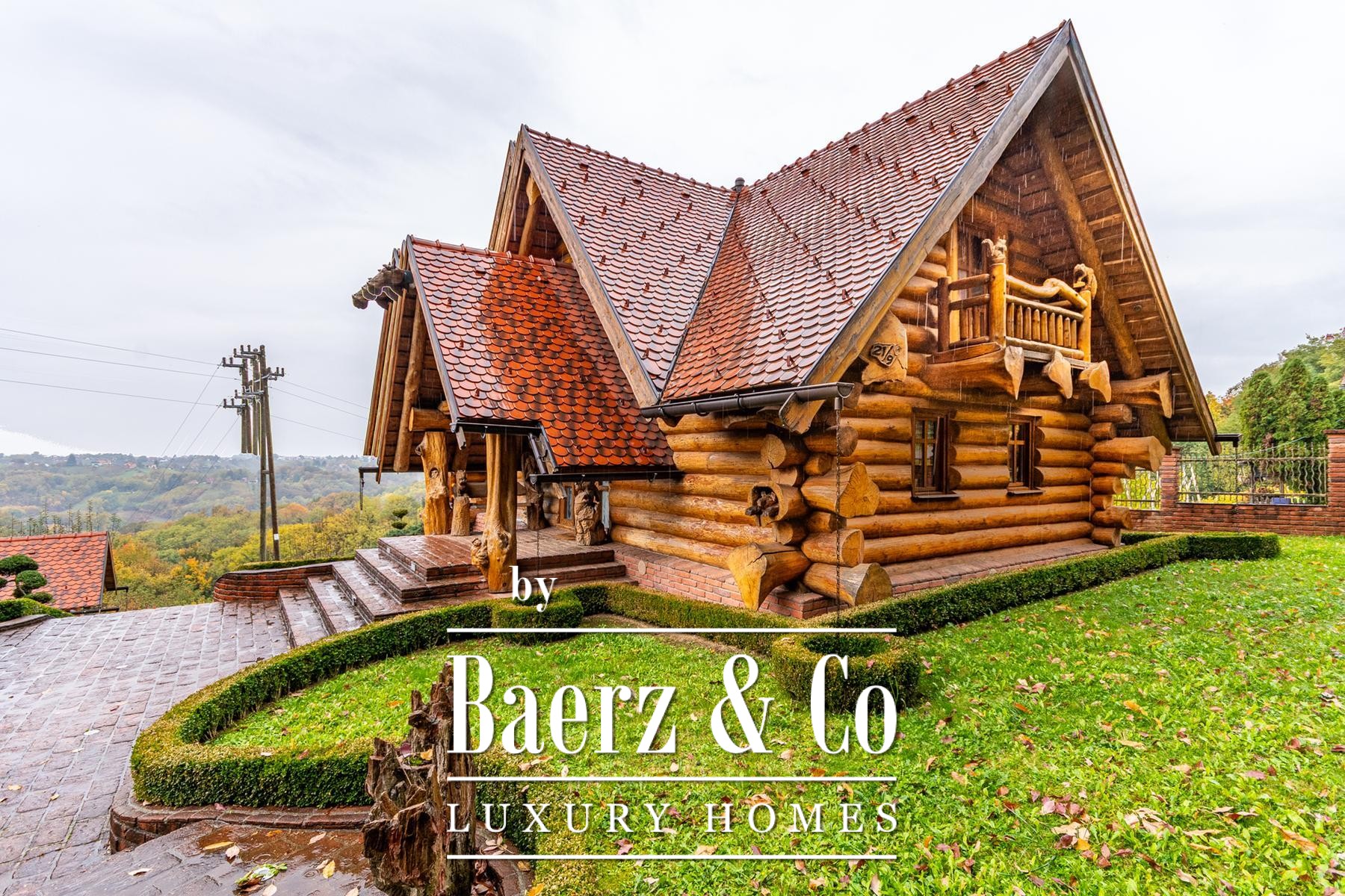 an outdoor toilet. This unique log house, considered by many as one of the most beautiful in Europe, offers more than just a property - it provides an experience.Set on a 3,500 m² plot surrounded by forest and vineyards, the property boasts carefully landscaped grounds. It offers complete privacy, breathtaking panoramic views, and a lush green oasis with a variety of fruit trees - apples, plums, figs, aronia, raspberries, and many more.For more information or to arrange a viewing, please feel free to contact us.