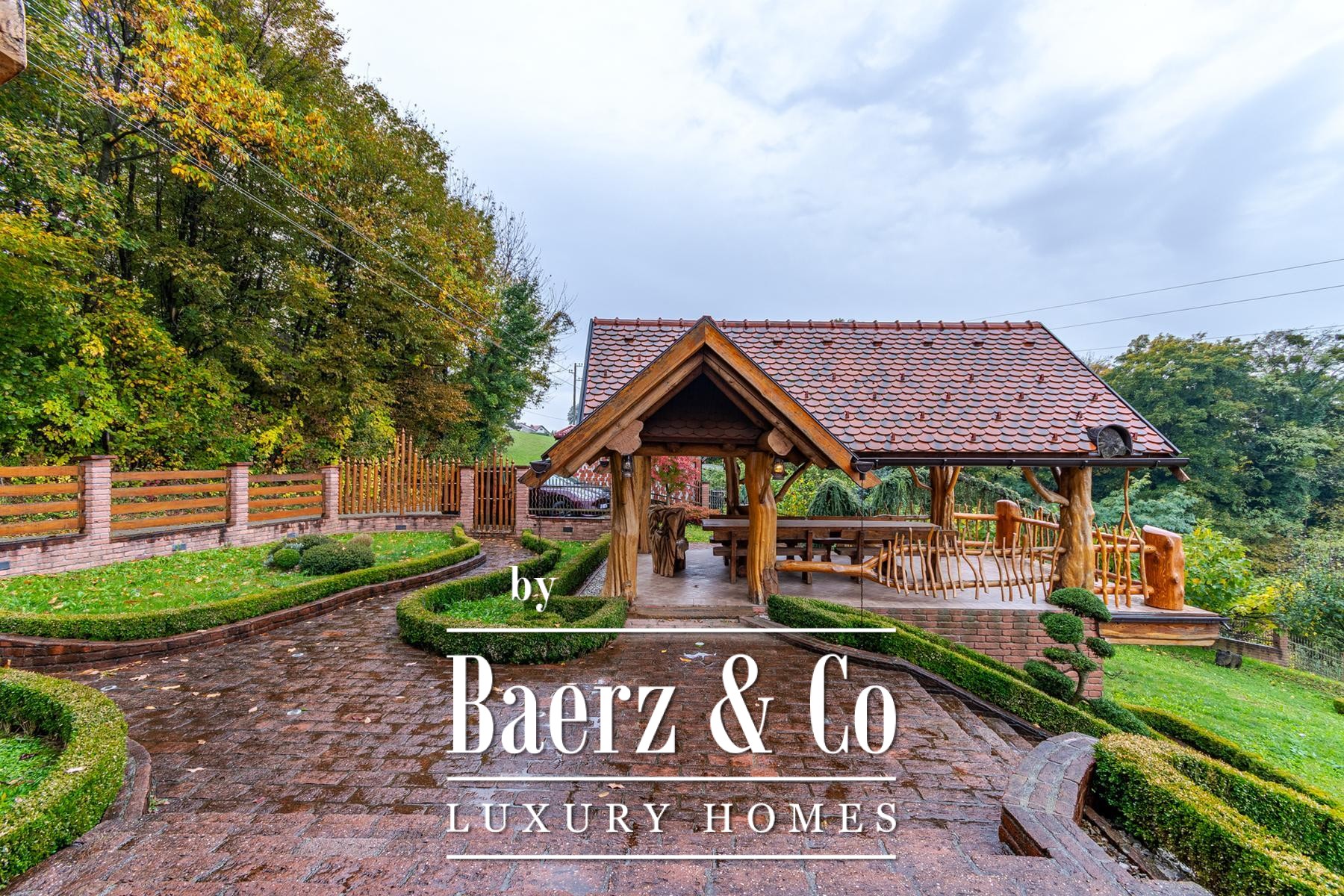 Varaždinske Toplice, Martinkovec, a luxurious estate ready to move in.The wooden house, with a total area of 190 m², consists of a ground floor and a gallery accessible by a lift. The entrance area includes a dining room, kitchen, bathroom, and a living room with access to the terrace. On the gallery, there is a bedroom and a wardrobe. The basement features a fitness area, kitchen, dining space, relaxation corner, wardrobe, and laundry room.The estate also includes three auxiliary buildings - a gazebo, a workshop, and