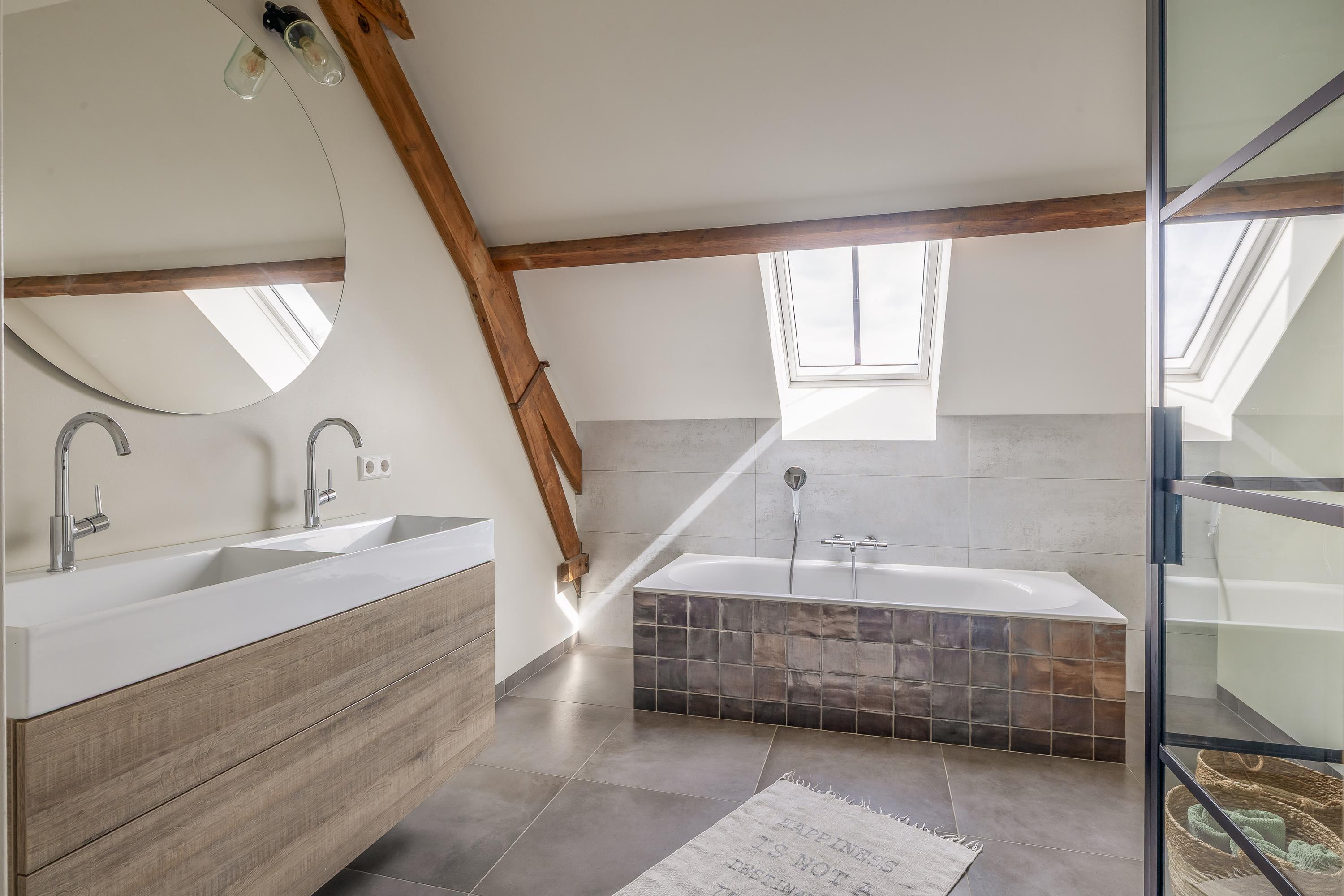 Adjacent to this is the indoor rear annex which, alongside the indoor garage, offers a considerable amount of additional usable space. This forms a solid foundation and was designed with versatility in mind. The rear annex is therefore ideally suited to a variety of uses, such as independent living accommodation (informal care), an office or practice space with meeting facilities, or a comfortable guest house. The space features a refurbished concrete floor with underfloor heating, brick walls and exposed wooden beams that enhance the rustic atmosphere. Part of the space has a mezzanine, and there is plenty of natural light. French doors in the rear façade provide a direct connection to the garden. There is also a separate toilet with a wall-hung toilet and washbasin. The rear annex also provides access to the built-in garage. The garage is accessible from the courtyard via a wide entrance door.
