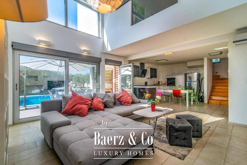 Villa Vodnjan with panoramic sea views stands as a testament to modern design and refined privacy, minutes from the heart of Vodnjan and vital amenities. This property offers 173 m² of thoughtfully arranged living space within a secure and landscaped plot of 1,294 m², ensuring seclusion and an open outlook over nature, the Brijuni archipelago, and the sea stretching towards Pula.