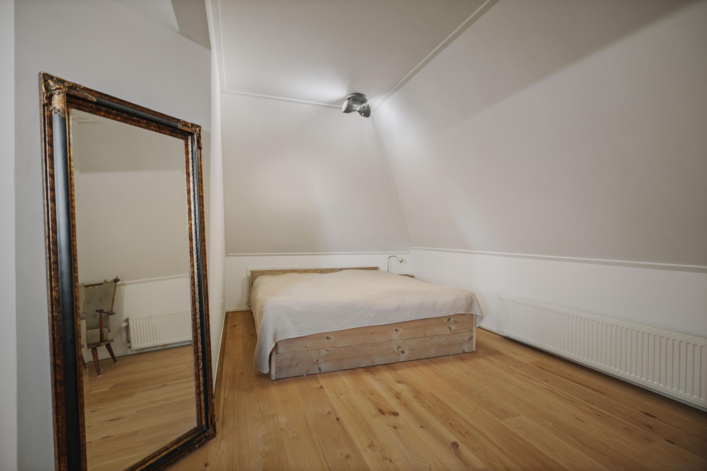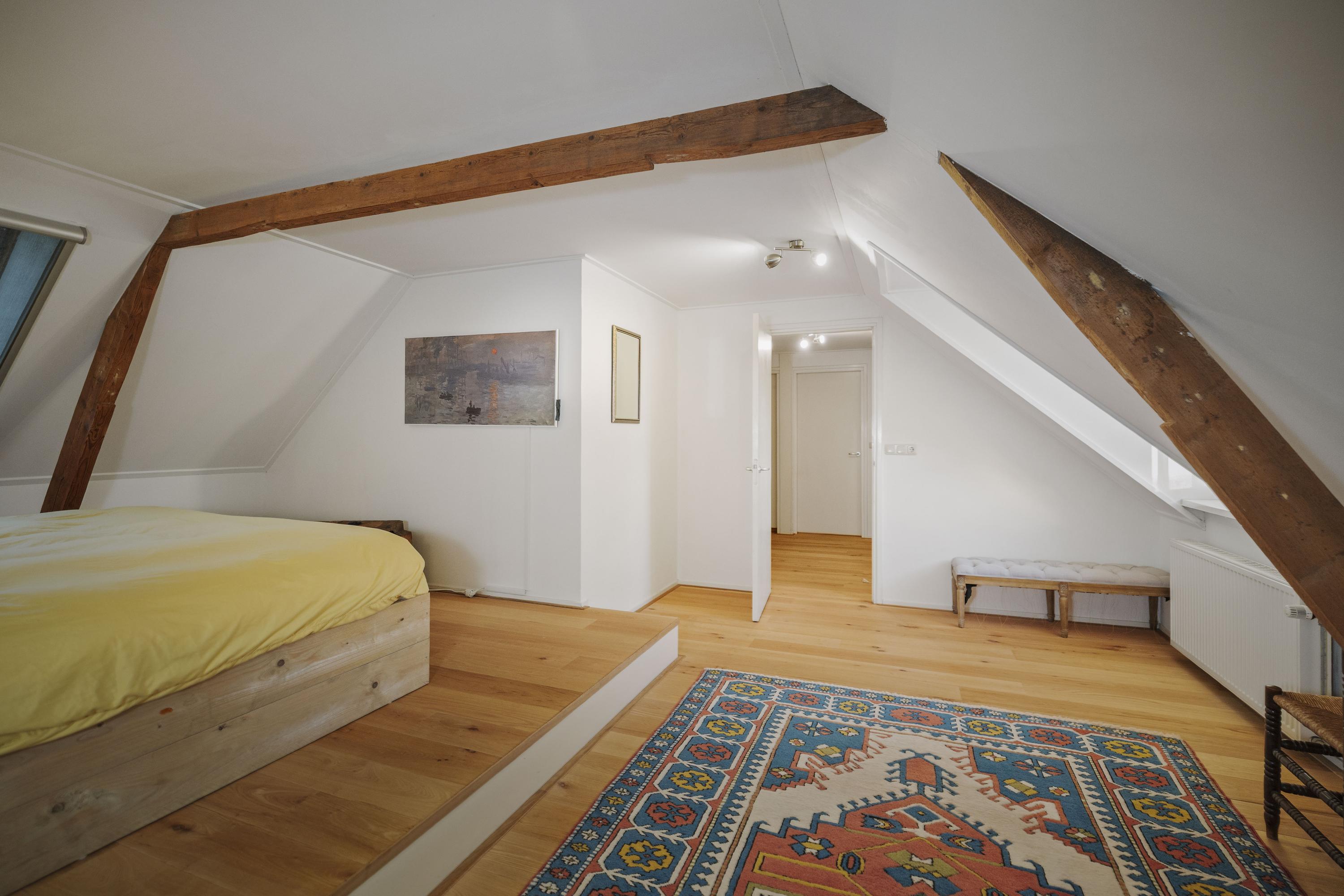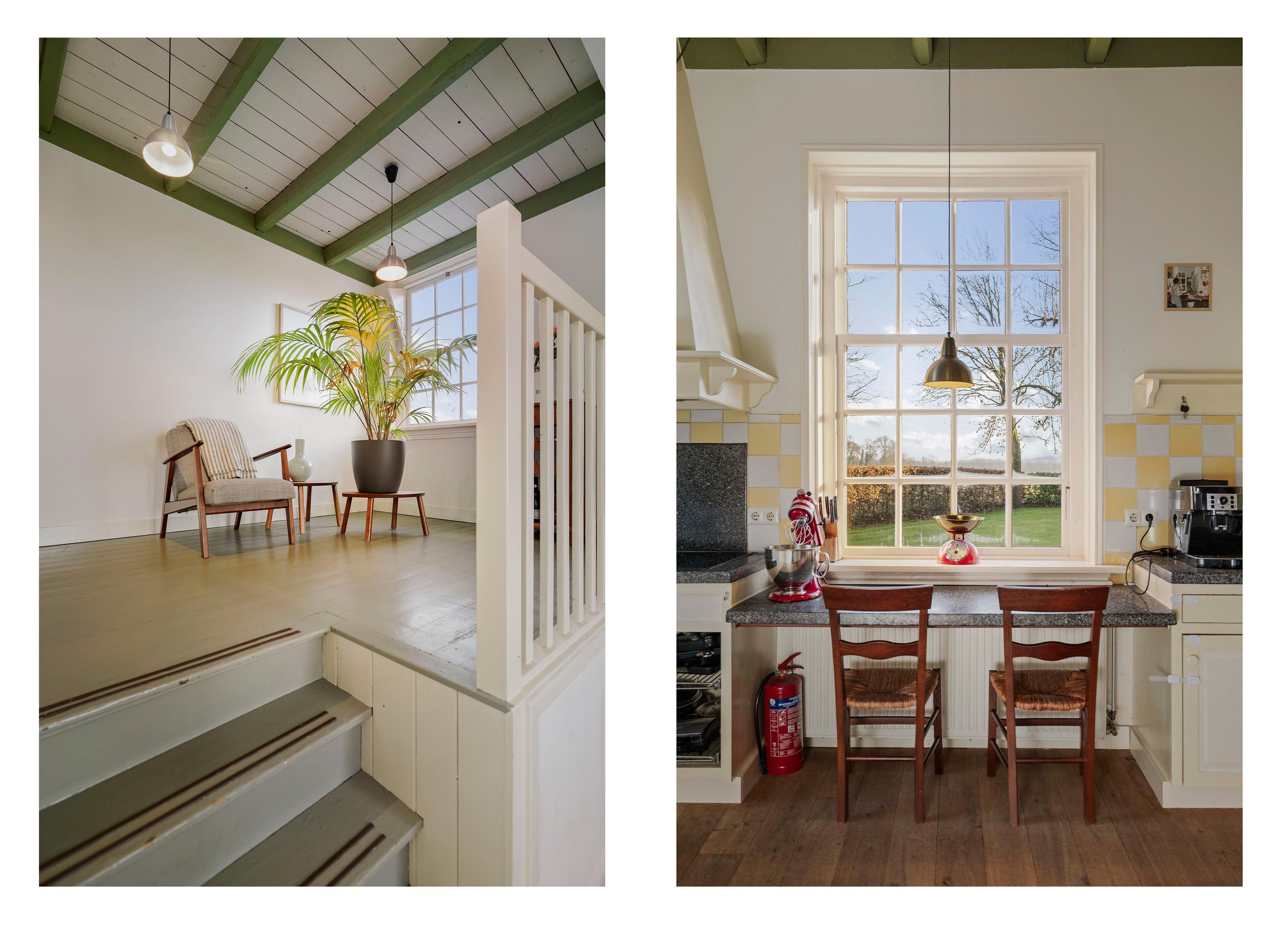 The barn is a fantastic space: over 150 m² of living space, brimming with atmosphere and rural charm. The floor is covered with oak planks and the old trusses still stand proudly in the room. In the heart of the space is a beautiful clay stove. These stoves are loved for their efficient heating, because in addition to keeping the living room warm, they also heat the water. The barn doors—the opening is now filled with glass—have been moved back on the inside and are a reminder of the barn's former function, as this is where the cows used to stand.