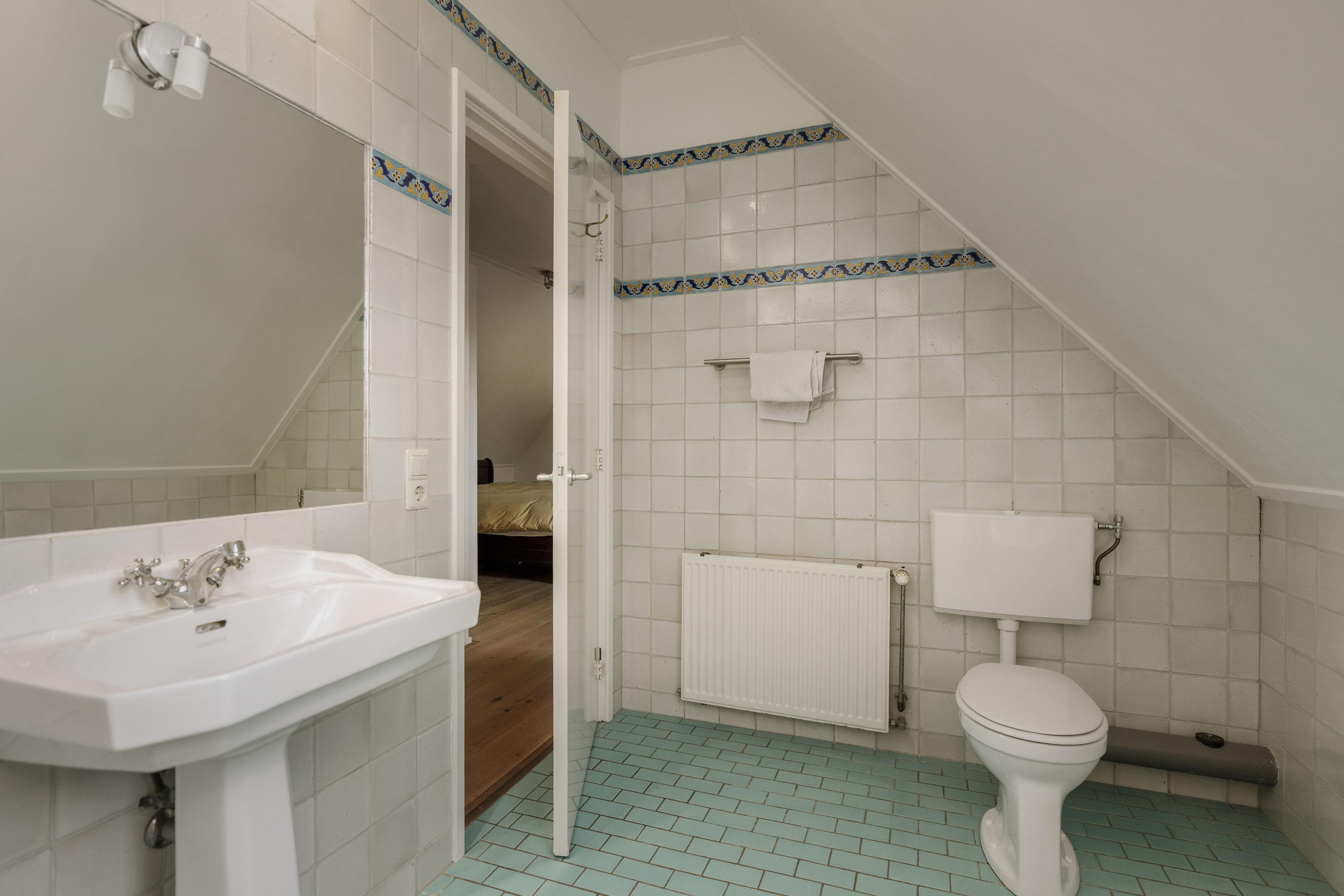 The gravel driveway leads us to the barn. In the Achterhoek region, it is customary to enter the house from the rear, and the entrance is located at the back of the house, offering impressive views of the surrounding farmland. The classic layout has been preserved in the program, as the traditional front door is also located at the front. The hall, with its high ceilings, is sunny and spacious, and the floor is covered with traditional terracotta tiles, which are so typical of this region. The formal hall is decorated with black and white decorative tiles, which contrast beautifully with the fresh white walls and cream-colored woodwork. The hall provides access to the toilet and bathroom on the ground floor, the dining room, the basement, and the upstairs room, which is currently used as an office with a pantry but would also be perfect as a guest room.