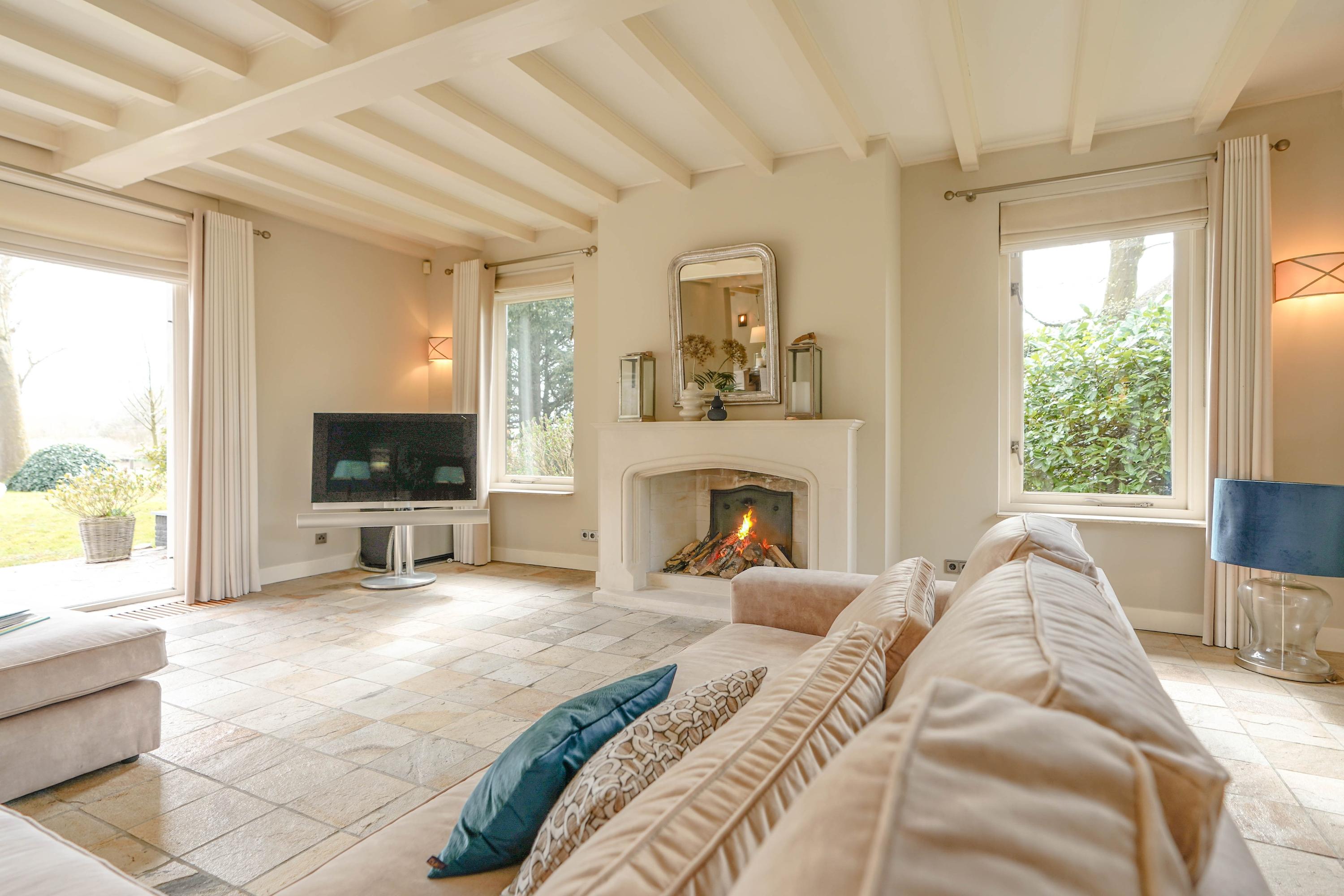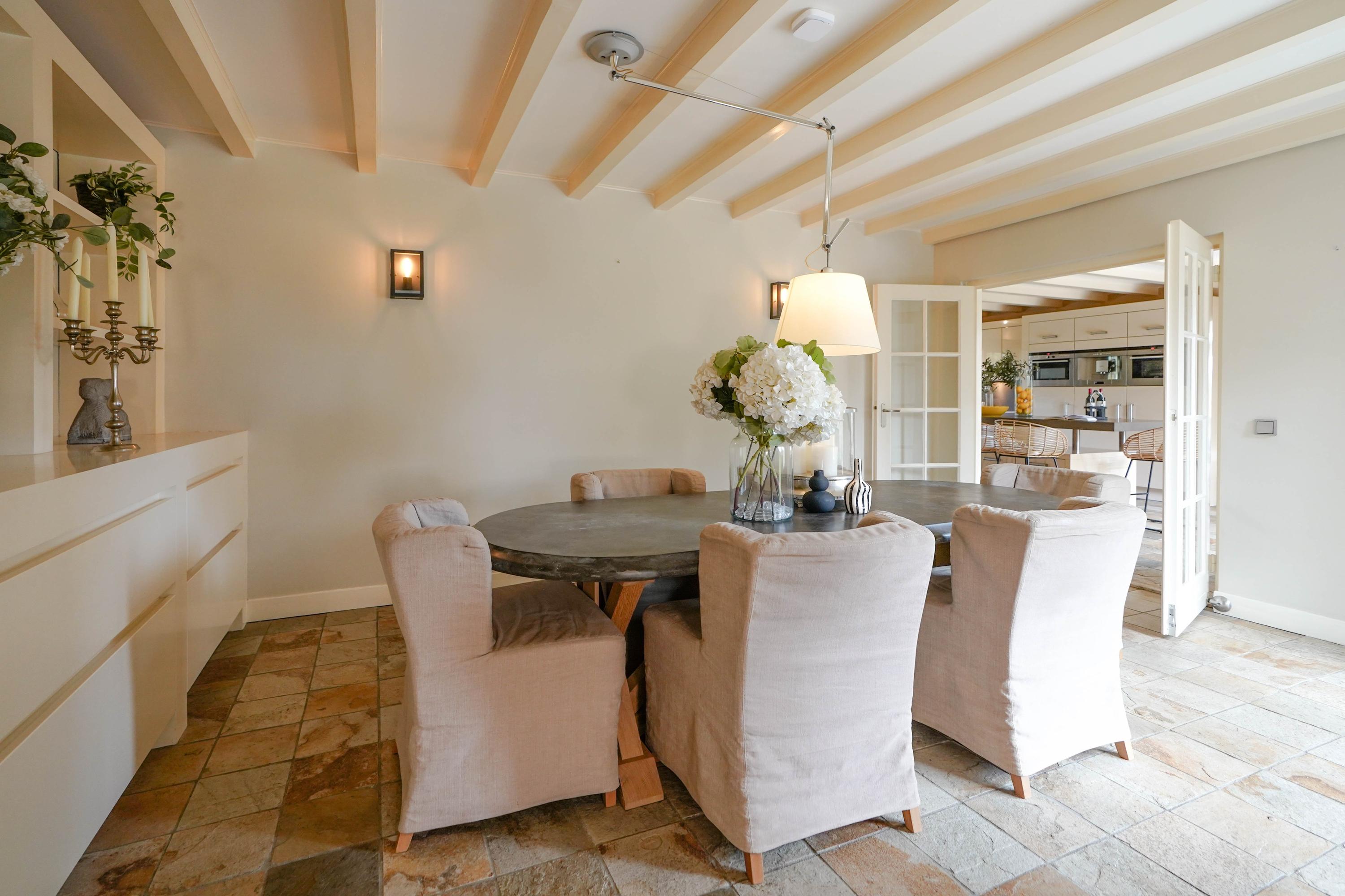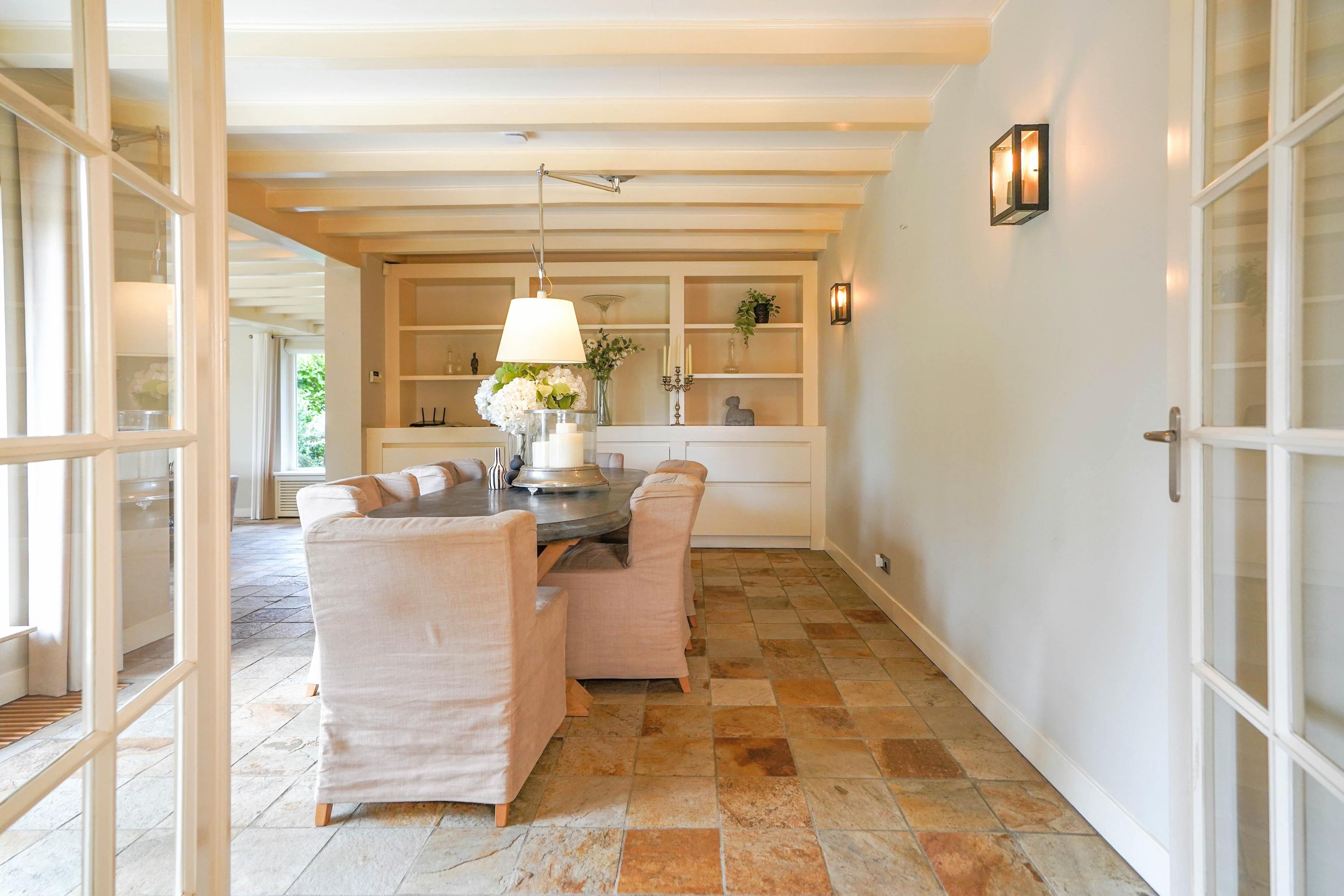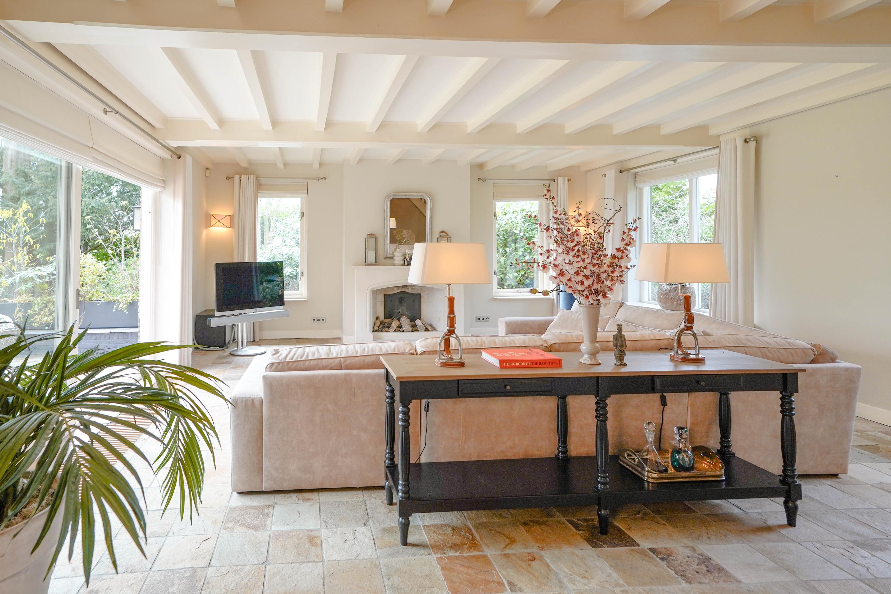 From the hall you enter the very spacious, attractive and bright living room through the double doors with a beautiful sandstone fireplace and sliding doors to one of the terraces. The dining room forms the connection between the living room and the kitchen. The luxury kitchen is spacious, bright and equipped with an island and of course all the usual equipment. Next to the kitchen you will find the utility room with cupboard wall and American fridge. You will also find the washing machine and dryer connections here. The entire ground floor has underfloor heating. From the kitchen you can also walk through French doors onto the terrace, with a nice, covered spot, perfect for a cup of coffee in the morning sun. Behind the kitchen is the lovely, sun-drenched conservatory (equipped with air conditioning) with again the beautiful view of the garden, the water and the nature reserve. Of course you can also walk from the conservatory, through French doors, straight into the garden.