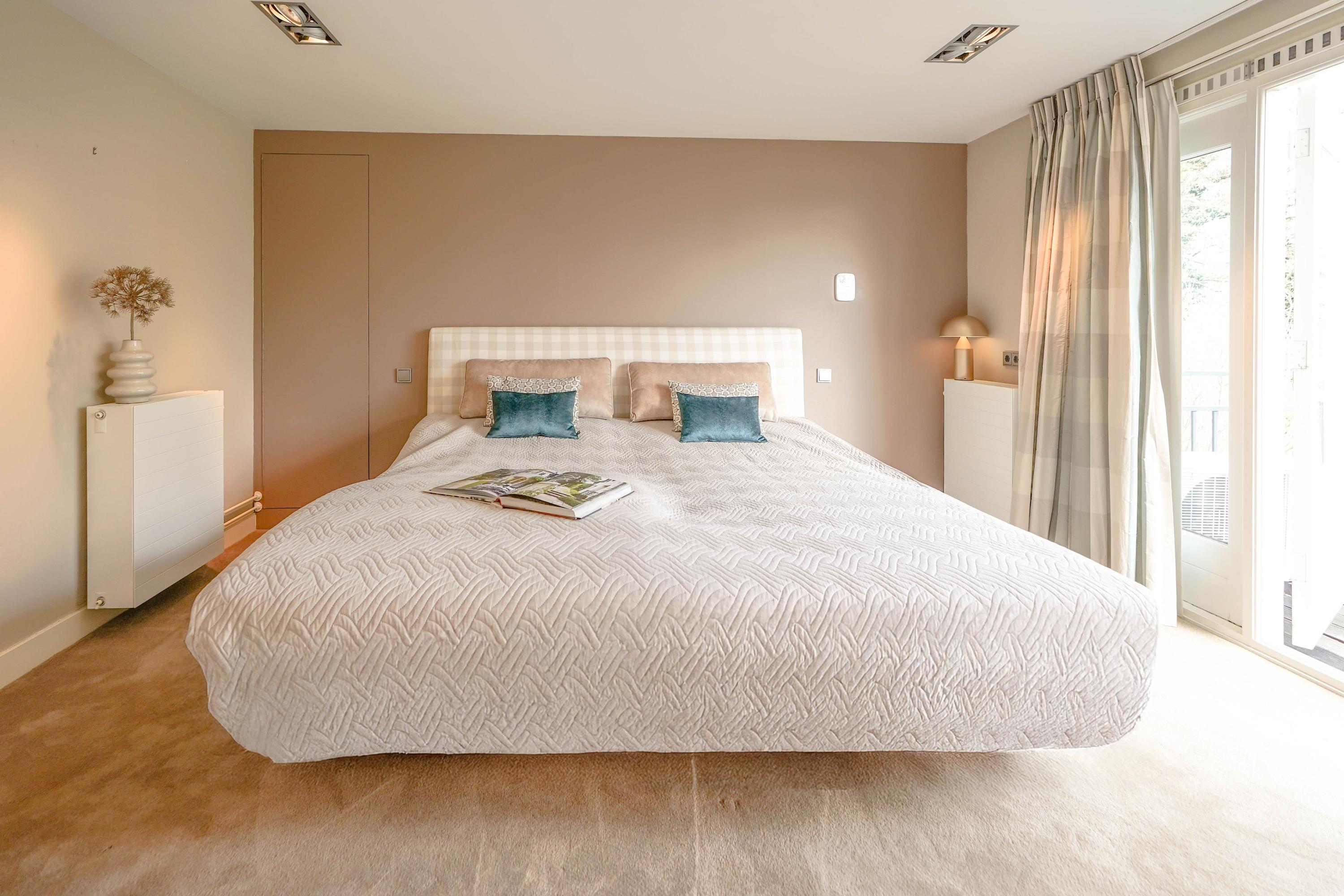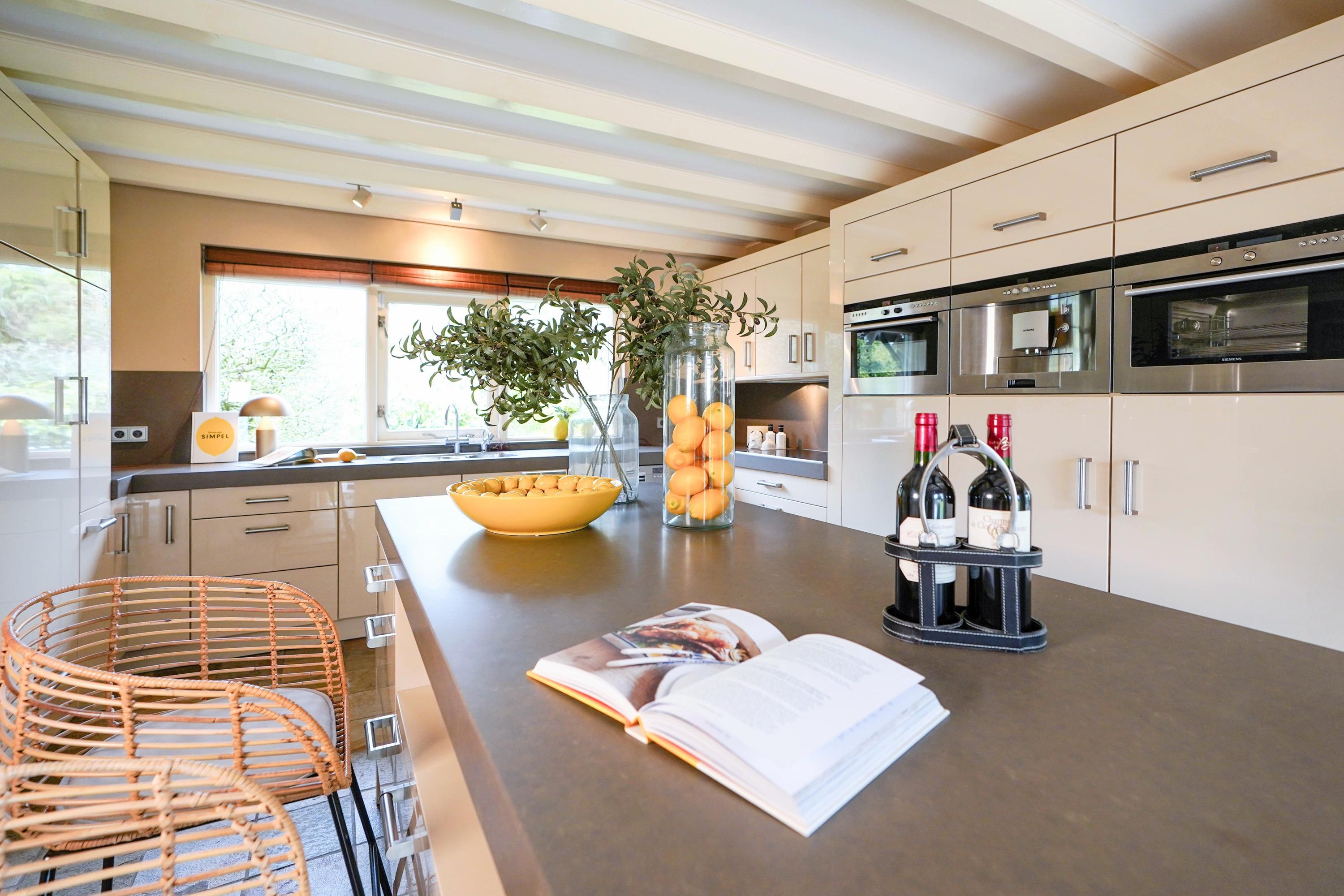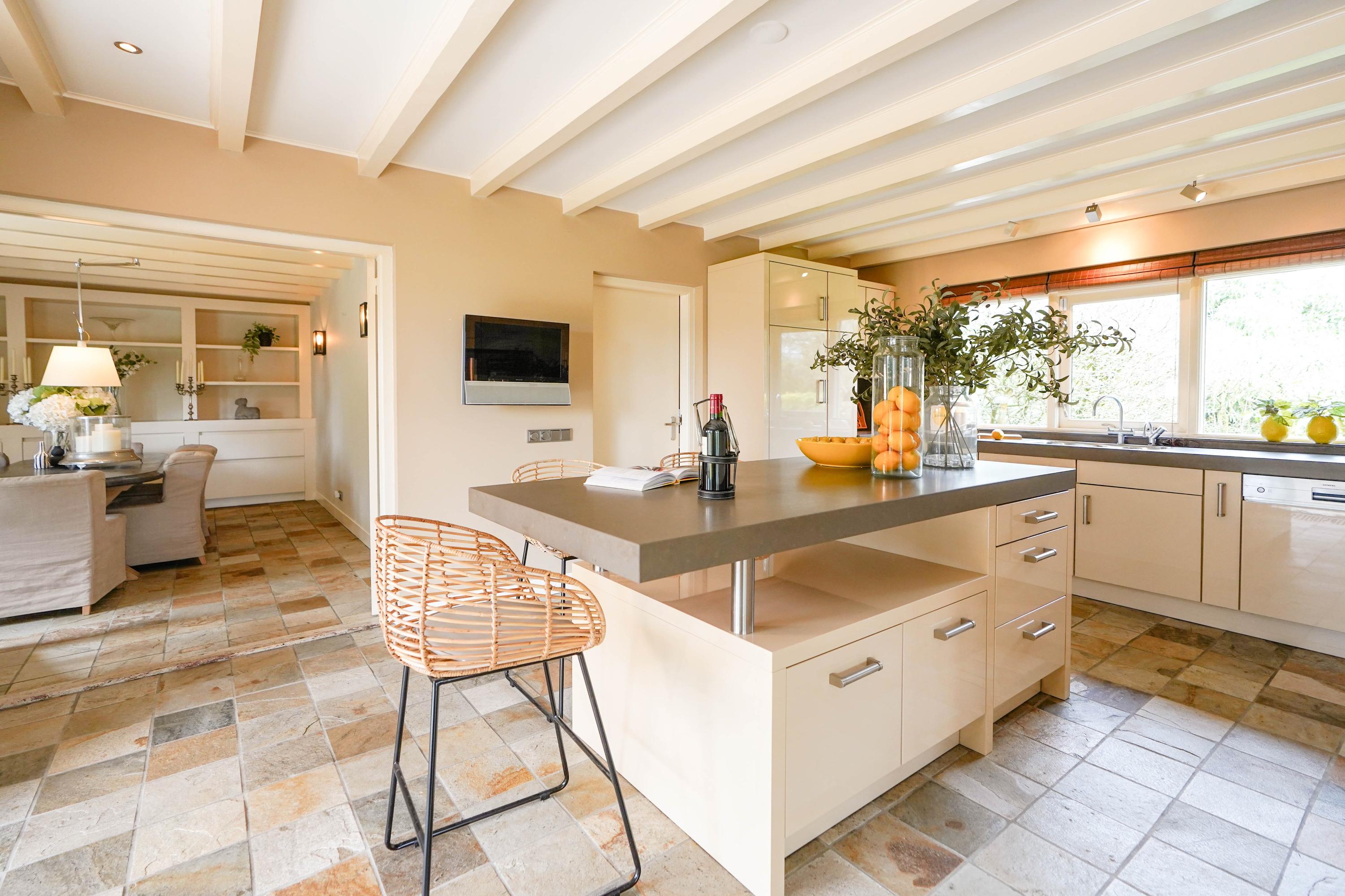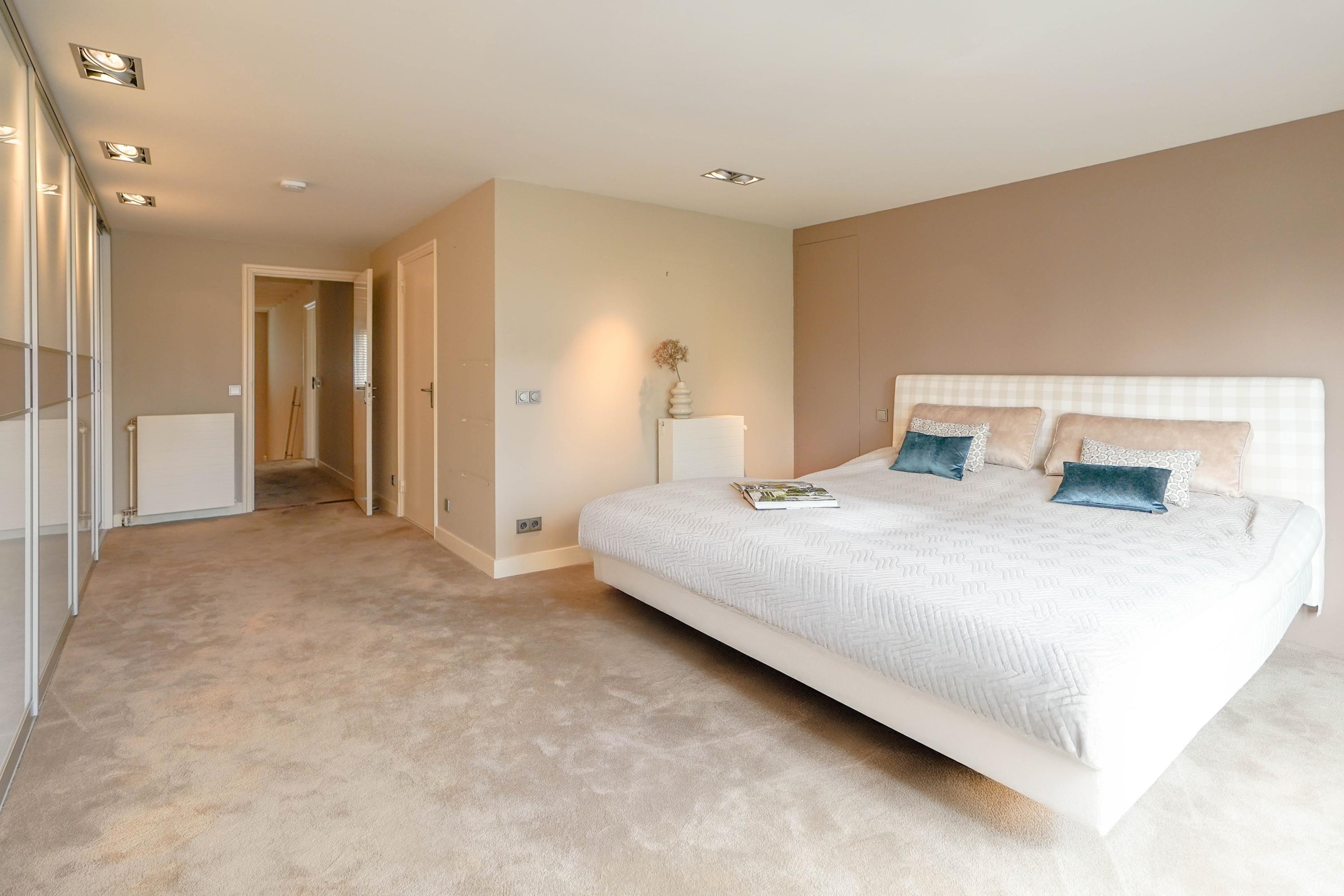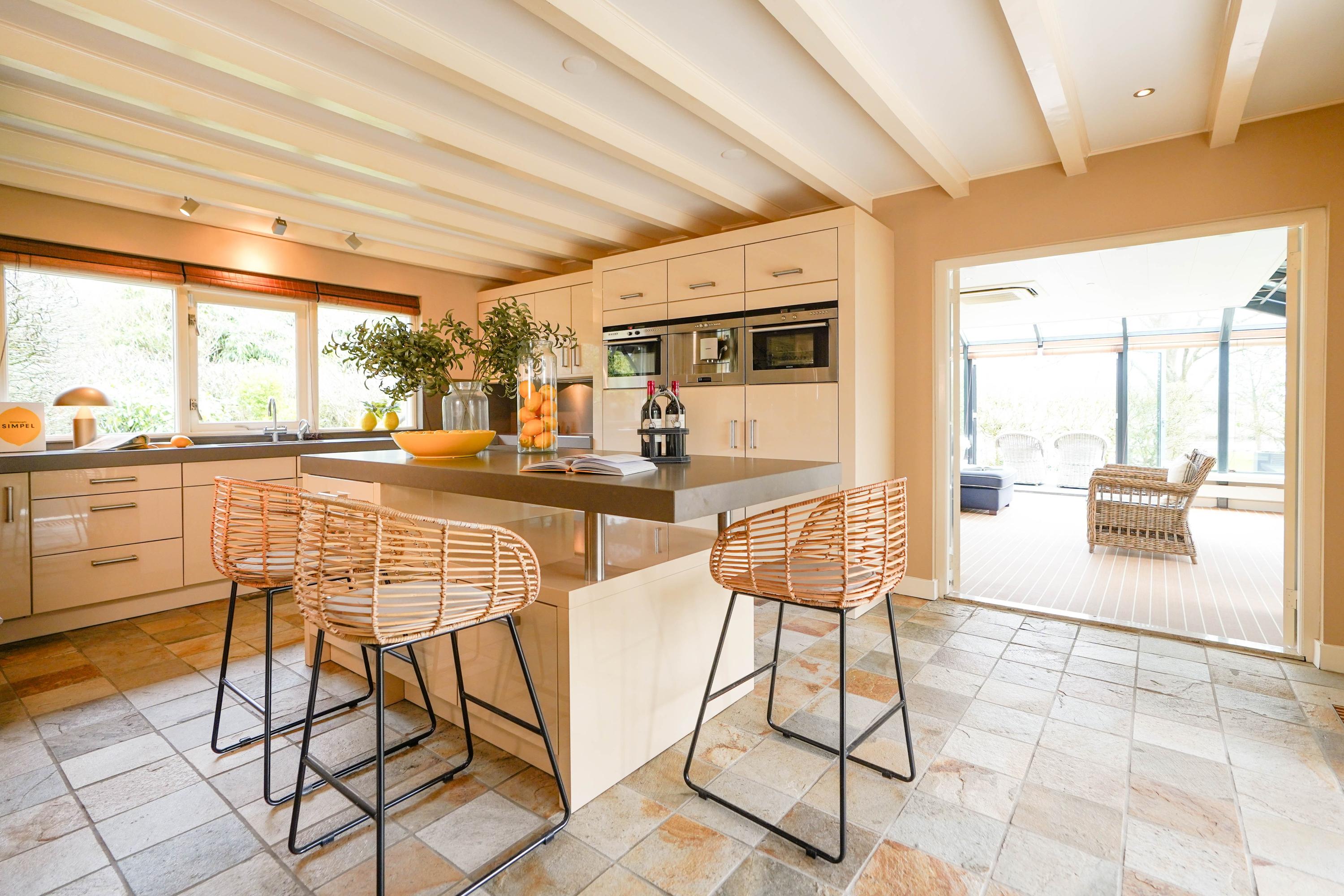 From the hall you enter the very spacious, attractive and bright living room through the double doors with a beautiful sandstone fireplace and sliding doors to one of the terraces. The dining room forms the connection between the living room and the kitchen. The luxury kitchen is spacious, bright and equipped with an island and of course all the usual equipment. Next to the kitchen you will find the utility room with cupboard wall and American fridge. You will also find the washing machine and dryer connections here. The entire ground floor has underfloor heating. From the kitchen you can also walk through French doors onto the terrace, with a nice, covered spot, perfect for a cup of coffee in the morning sun. Behind the kitchen is the lovely, sun-drenched conservatory (equipped with air conditioning) with again the beautiful view of the garden, the water and the nature reserve. Of course you can also walk from the conservatory, through French doors, straight into the garden.