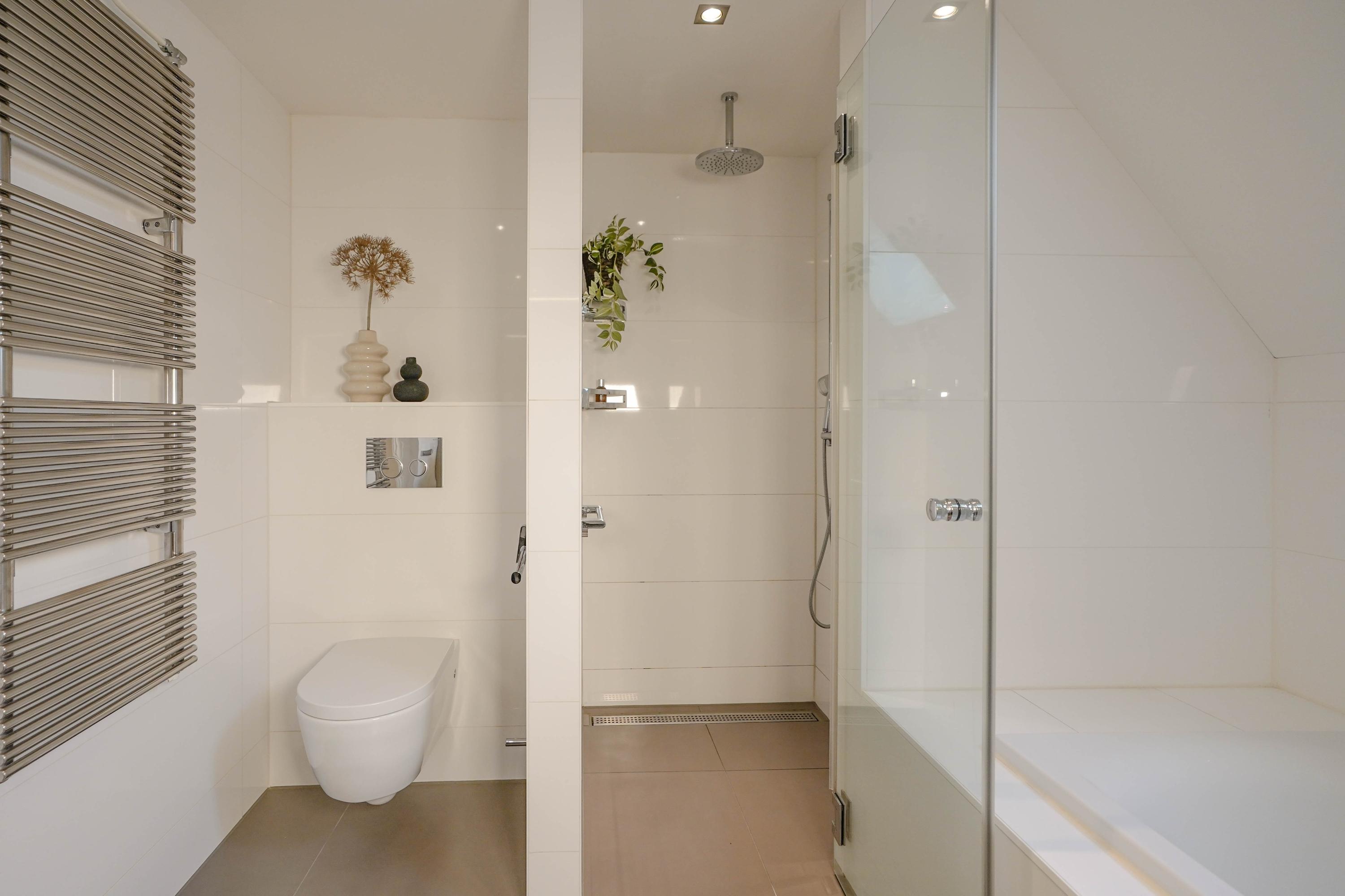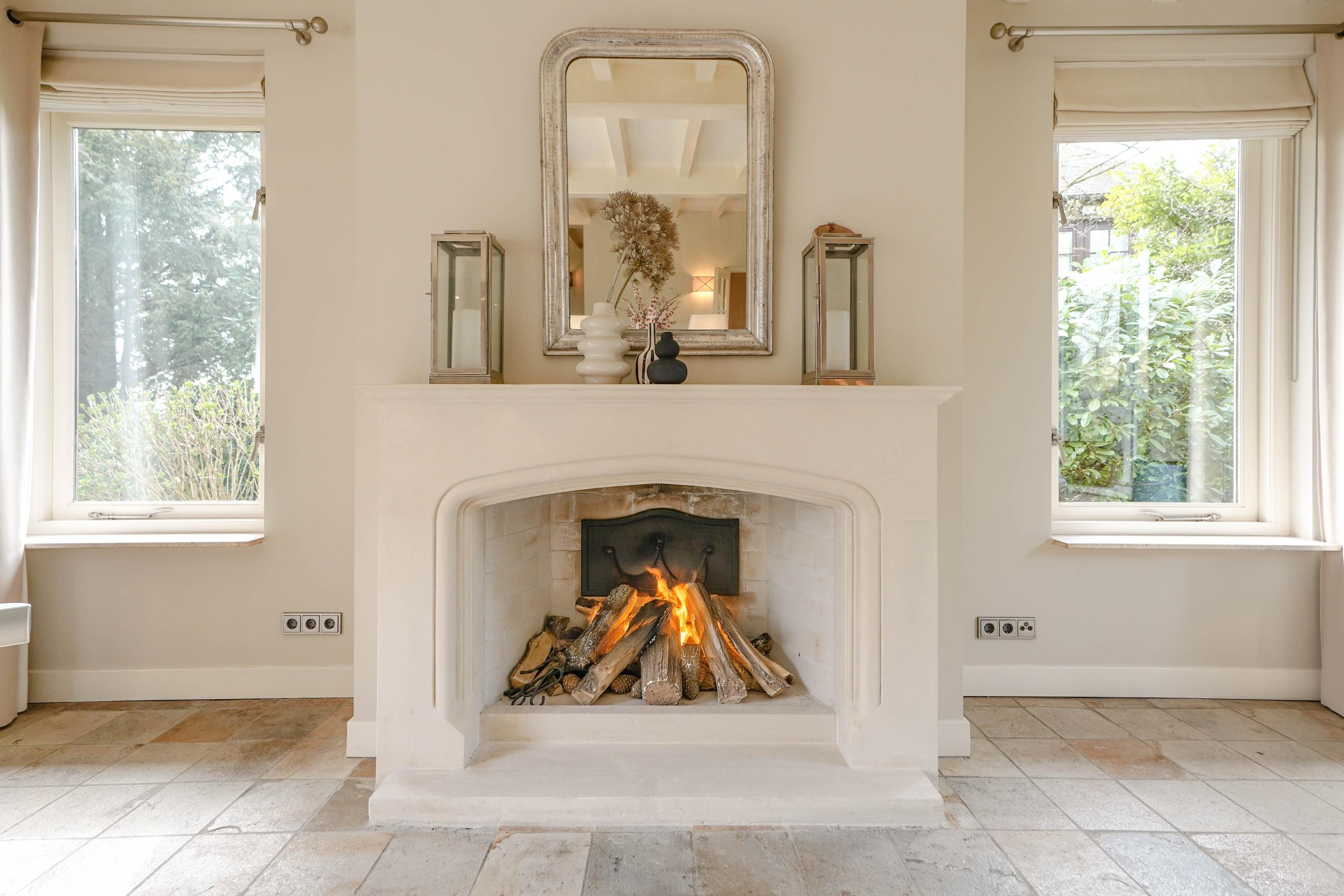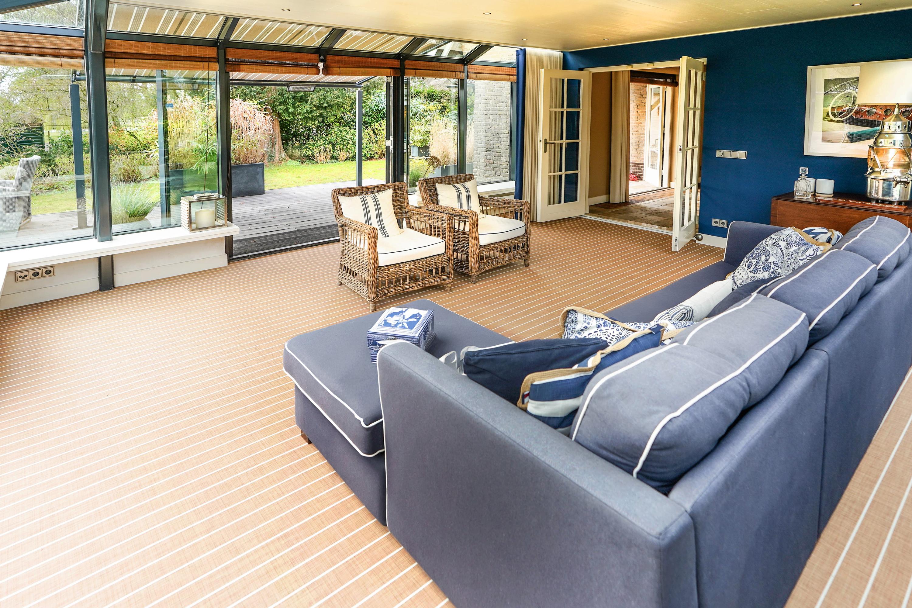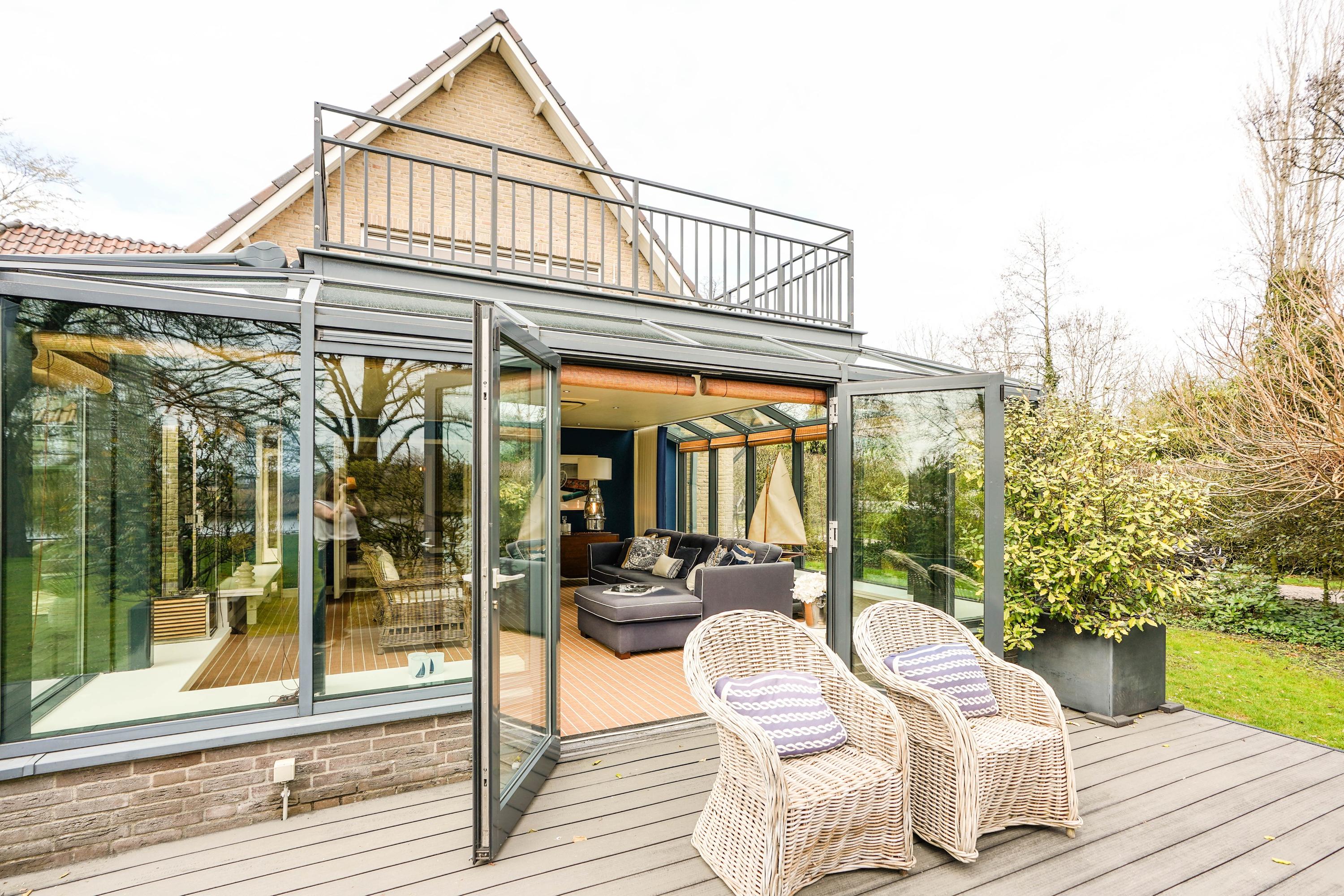 From the hall you enter the very spacious, attractive and bright living room through the double doors with a beautiful sandstone fireplace and sliding doors to one of the terraces. The dining room forms the connection between the living room and the kitchen. The luxury kitchen is spacious, bright and equipped with an island and of course all the usual equipment. Next to the kitchen you will find the utility room with cupboard wall and American fridge. You will also find the washing machine and dryer connections here. The entire ground floor has underfloor heating. From the kitchen you can also walk through French doors onto the terrace, with a nice, covered spot, perfect for a cup of coffee in the morning sun. Behind the kitchen is the lovely, sun-drenched conservatory (equipped with air conditioning) with again the beautiful view of the garden, the water and the nature reserve. Of course you can also walk from the conservatory, through French doors, straight into the garden.