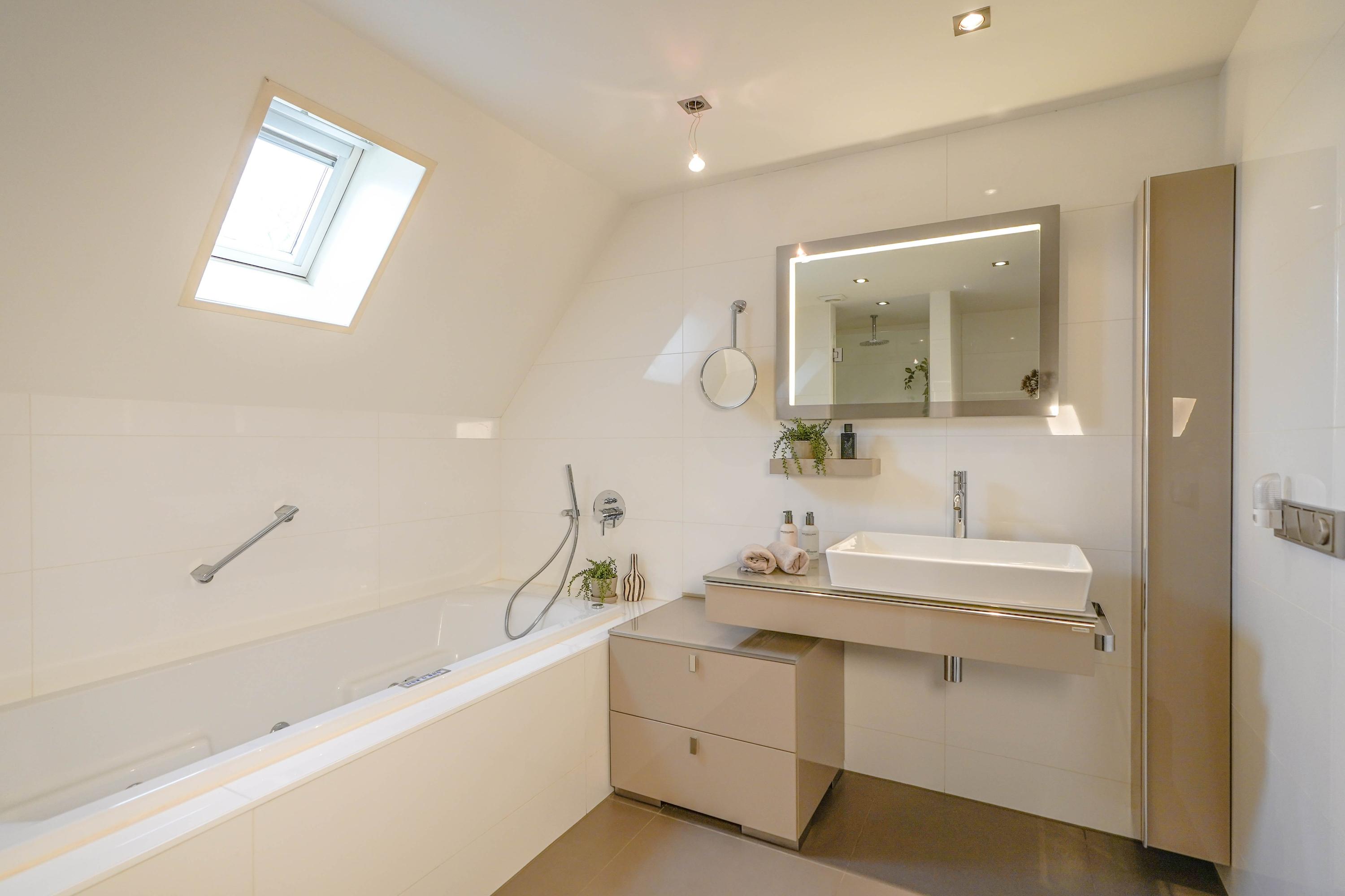 Landing, the first bathroom with shower, double sink and a toilet. Two spacious, identical children's bedrooms with a fixed staircase to a sleeping loft. The master bedroom has its own bathroom en suite (equipped with underfloor heating), fixed cupboard wall and French doors to a roof terrace with breathtaking views. Last but not least, on the first floor you will find the very spacious study with gas fireplace, view of the water, custom-made built-in cupboards and a fixed staircase to the vide and large storage attic.