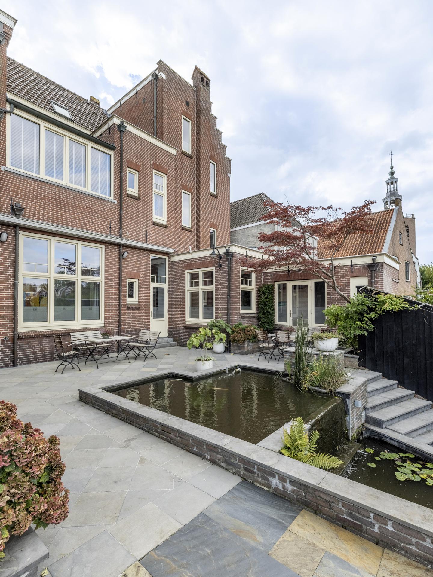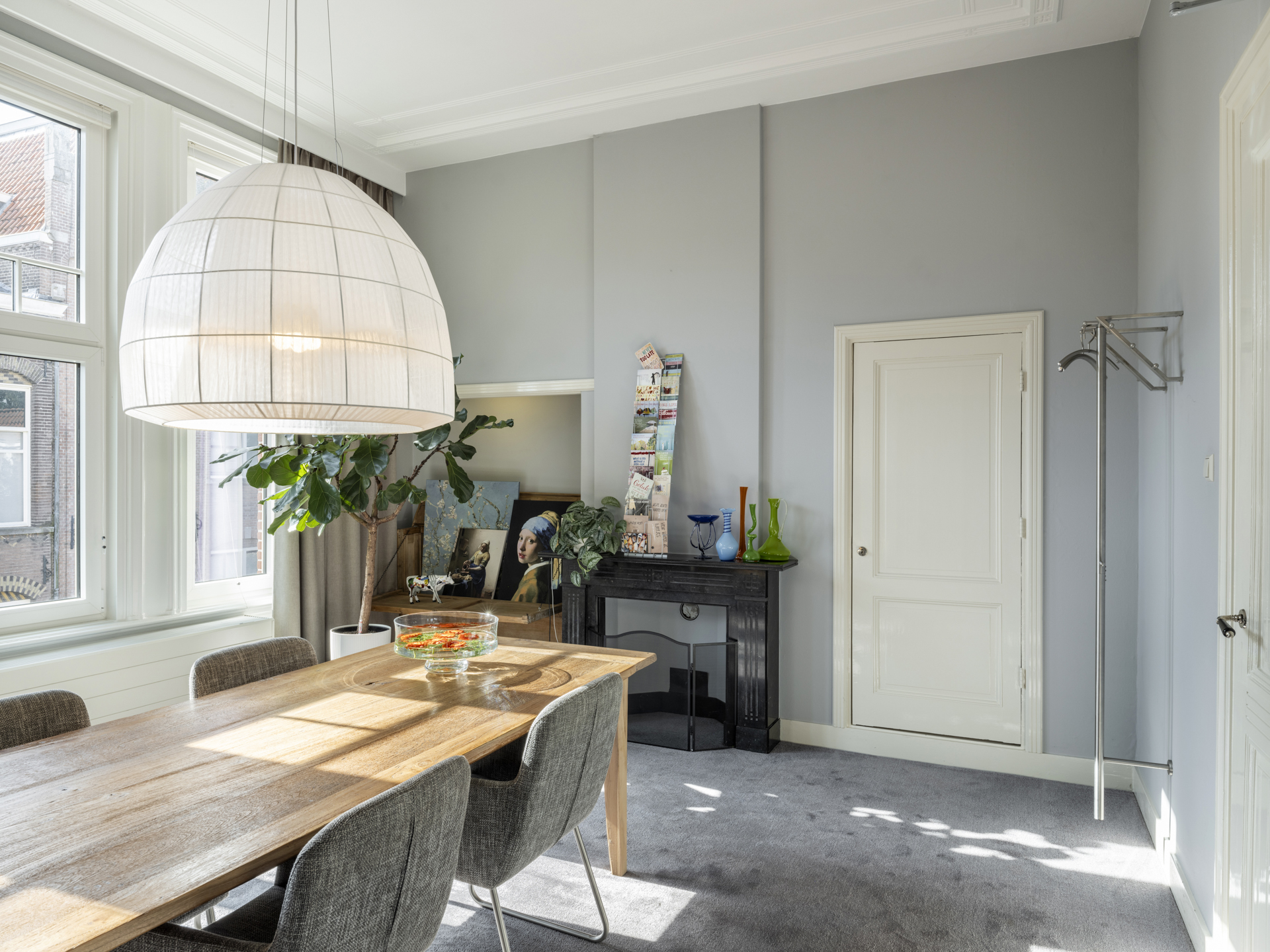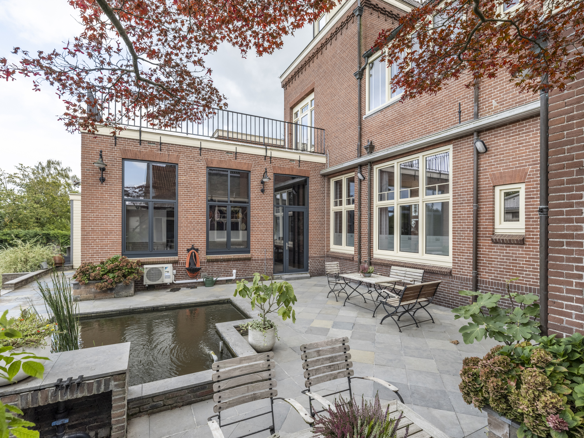 Period elements such as an original hardstone staircase, marble floors, intricate plasterwork, and leaded glass appear throughout. The flow of the home is anchored by a dramatic central hallway, with distinct living and working rooms branching off. Carefully updated, the villa marries heritage with modern comfort: high-grade insulation, HR++ double glazing, 23 solar panels, and three heating systems.