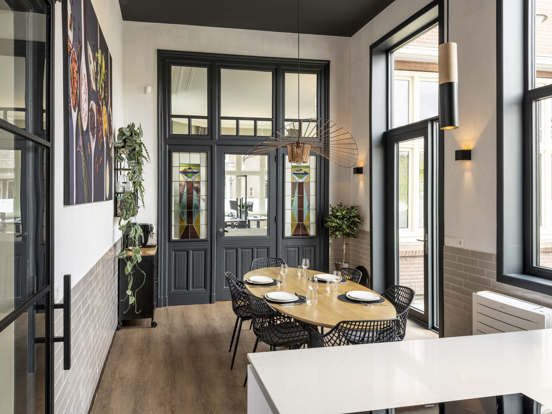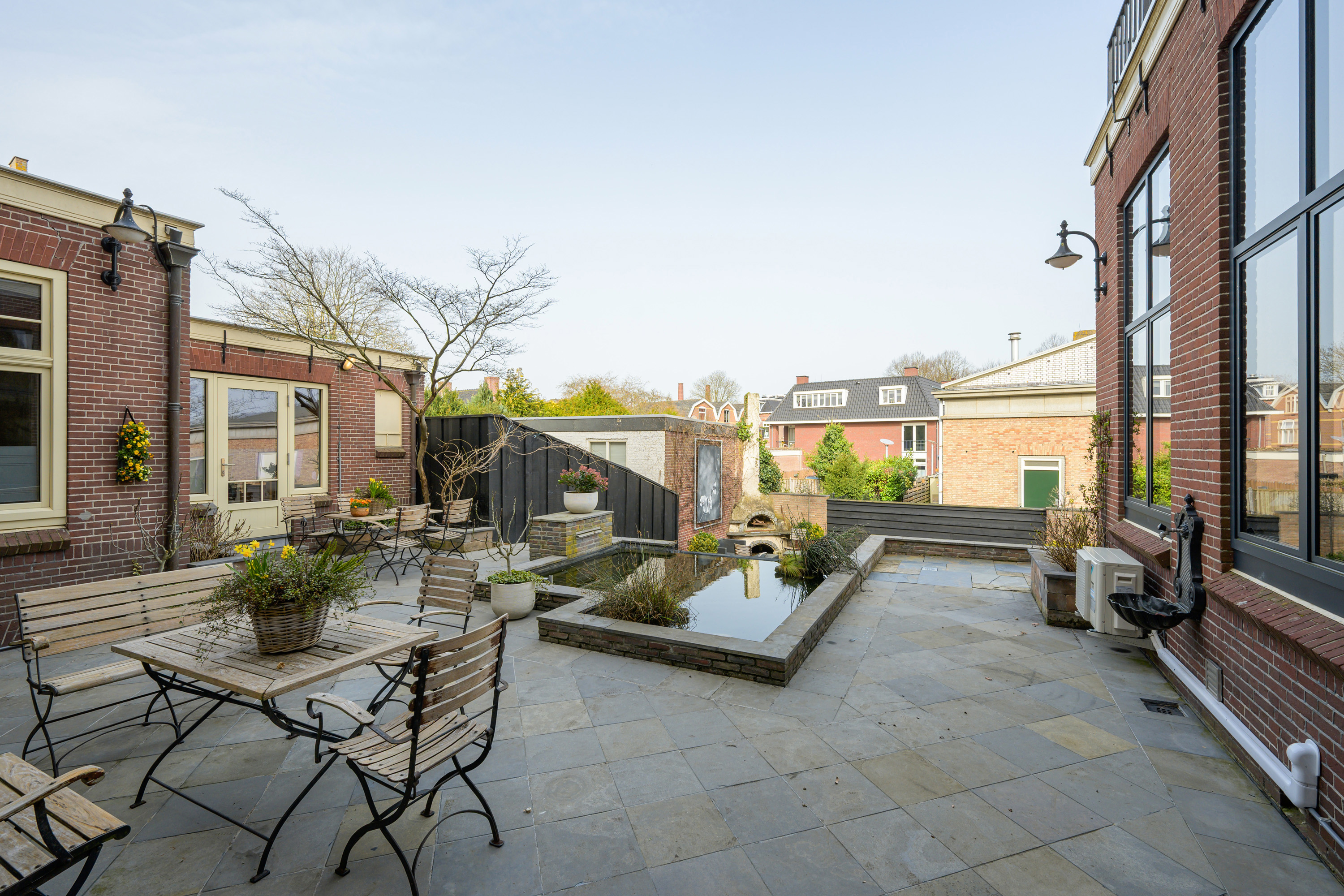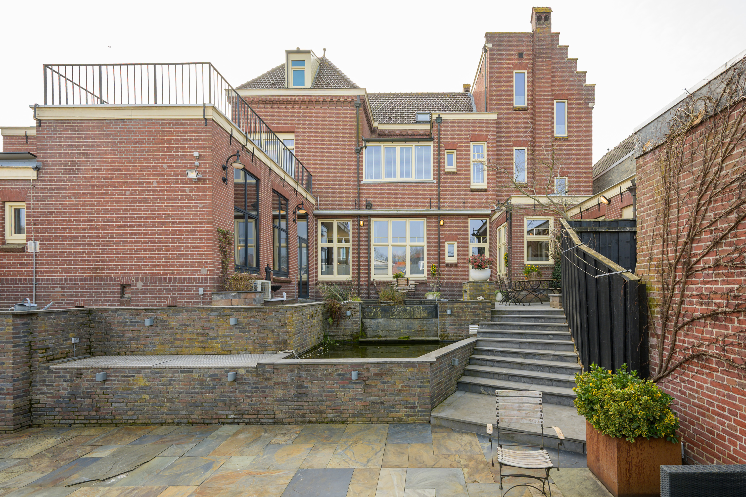 Period elements such as an original hardstone staircase, marble floors, intricate plasterwork, and leaded glass appear throughout. The flow of the home is anchored by a dramatic central hallway, with distinct living and working rooms branching off. Carefully updated, the villa marries heritage with modern comfort: high-grade insulation, HR++ double glazing, 23 solar panels, and three heating systems.