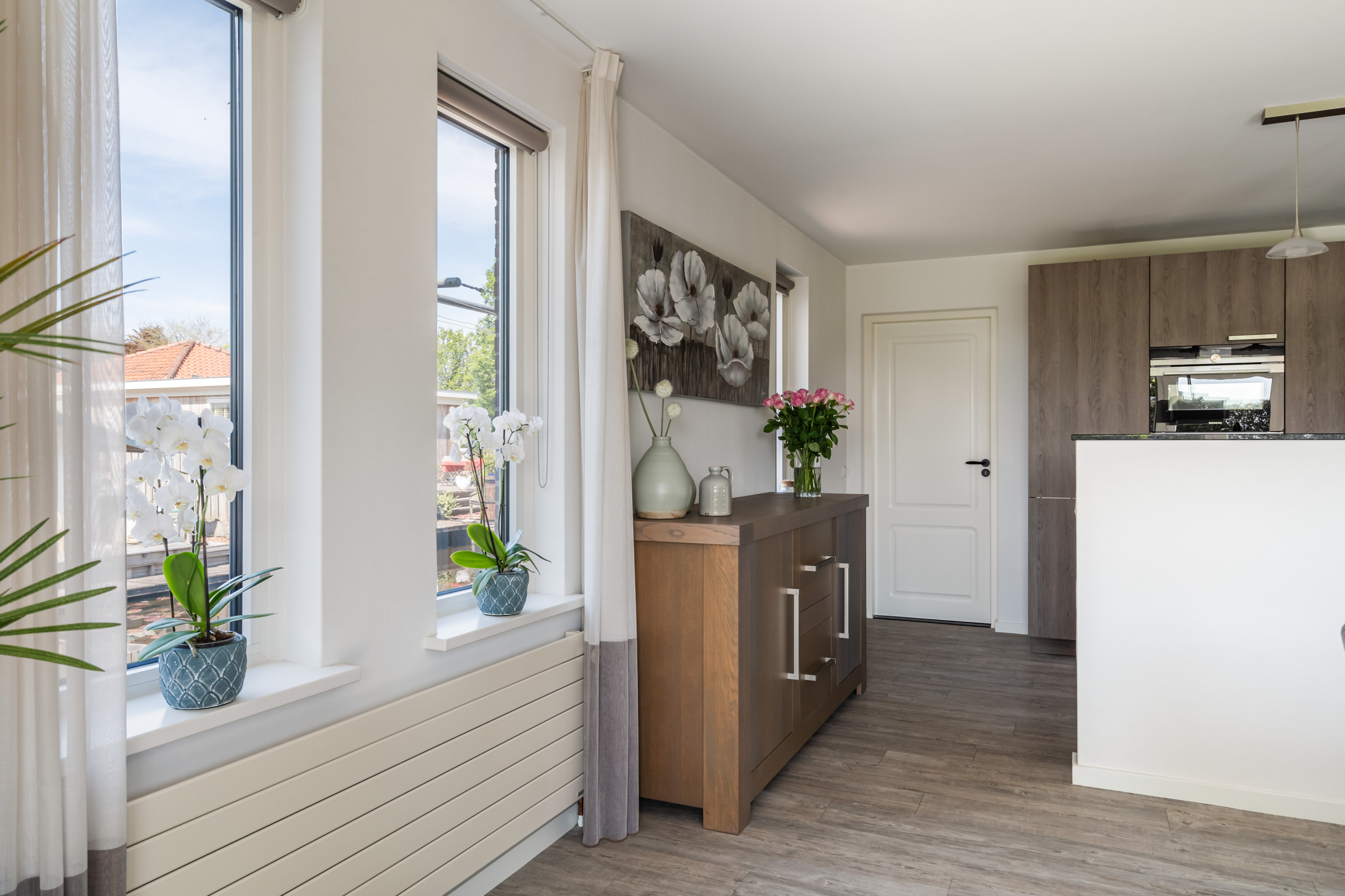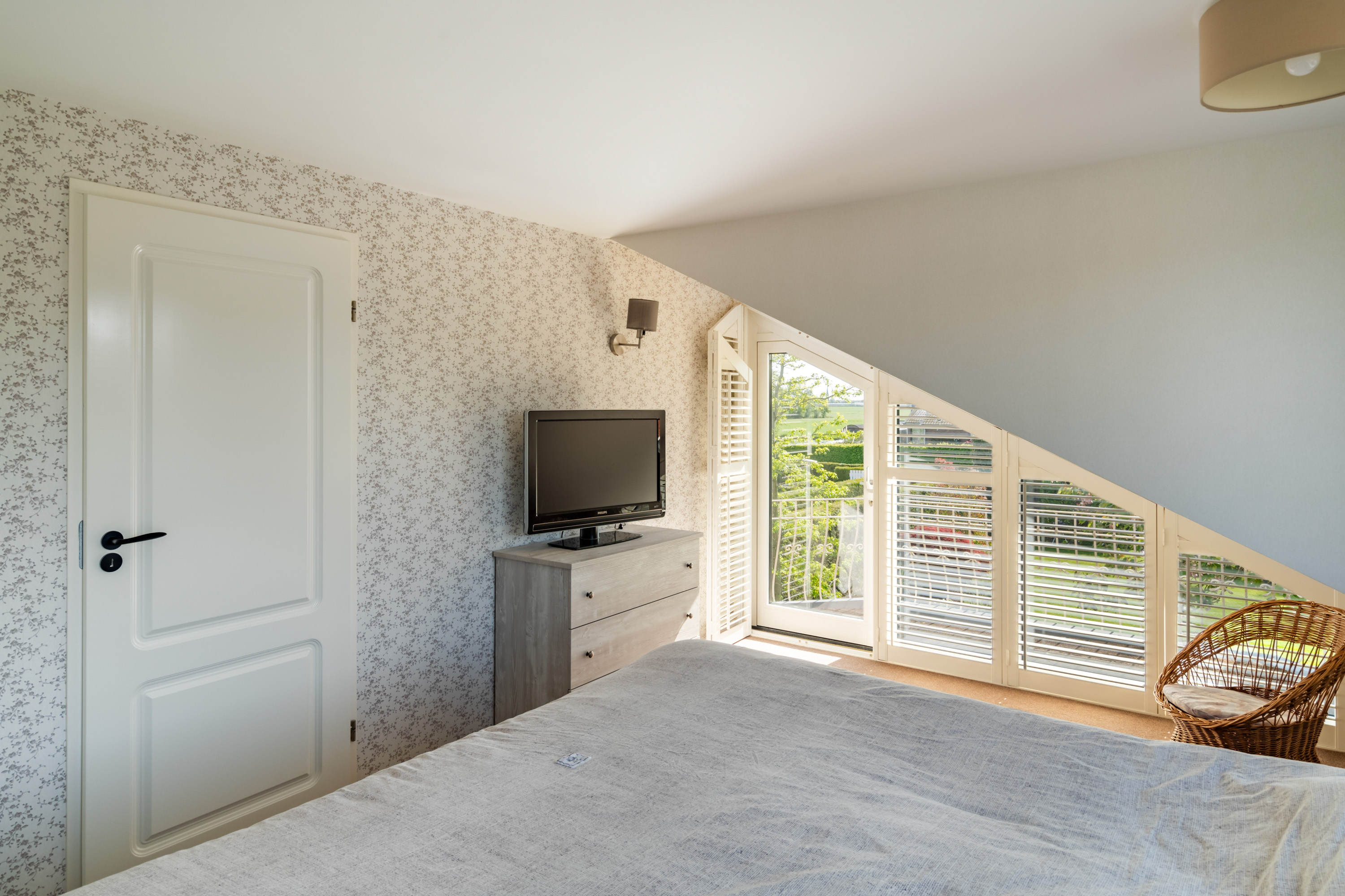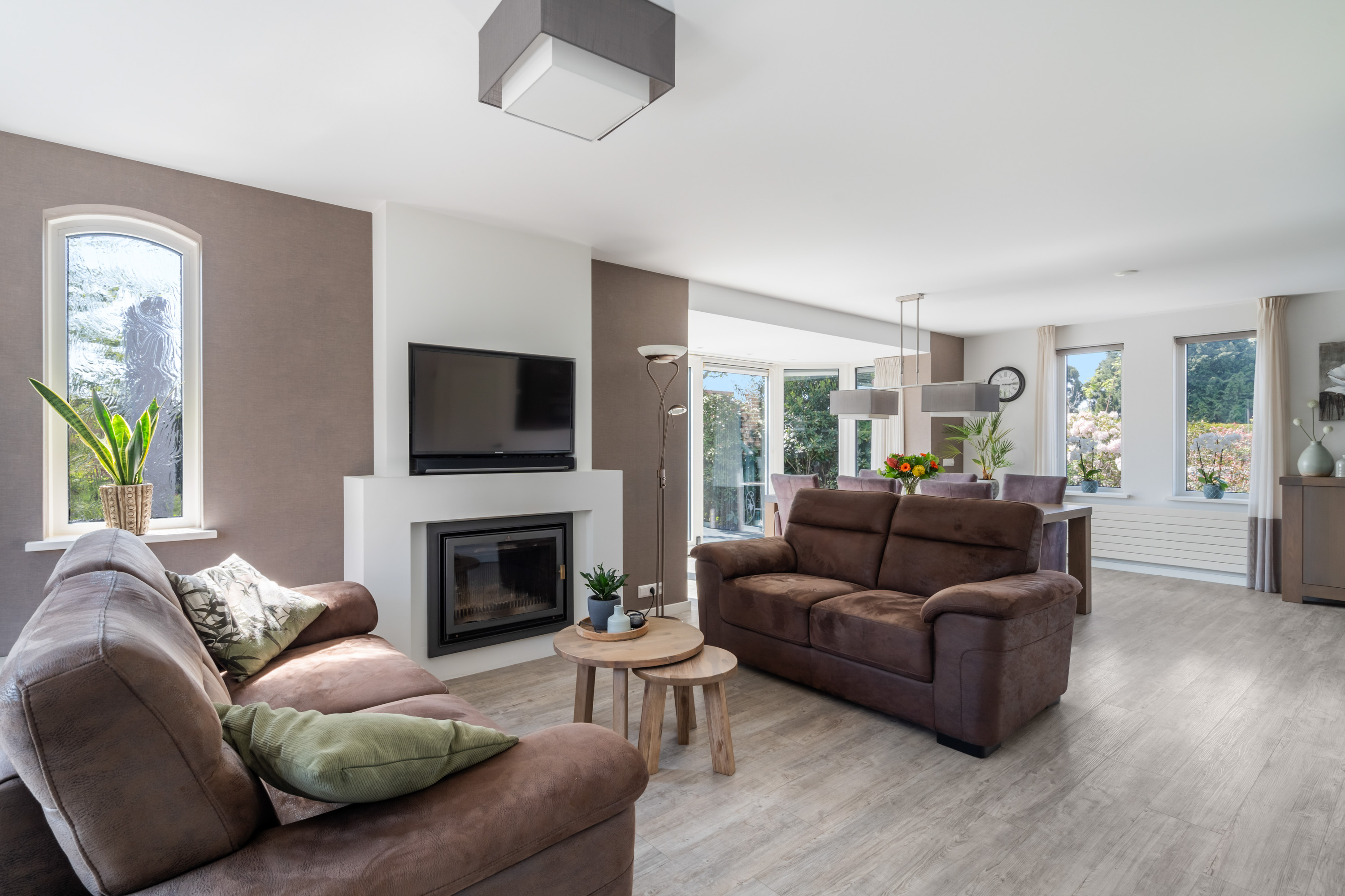 The living room is spacious and bright, with large windows, a side window, a cozy bay window, and sliding doors (with screen) opening to the garden. Around the charming wood-burning fireplace, there’s room for a generous seating area. The PVC floor with underfloor heating adds comfort and a modern feel.