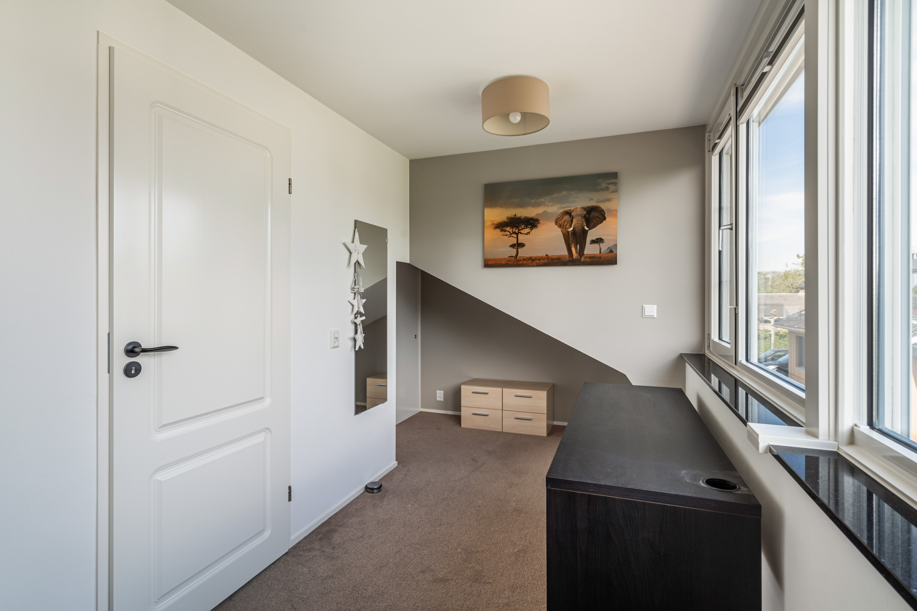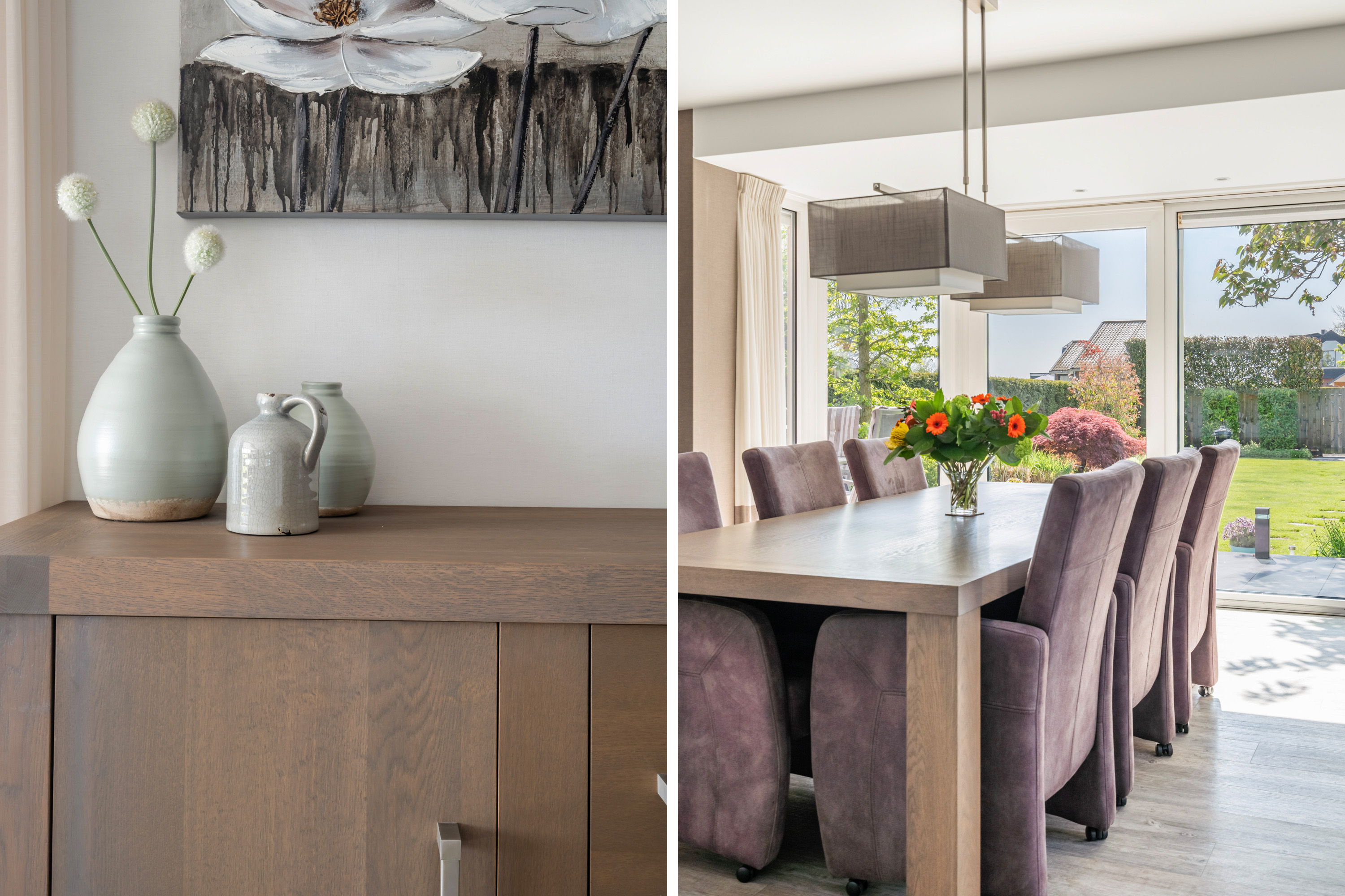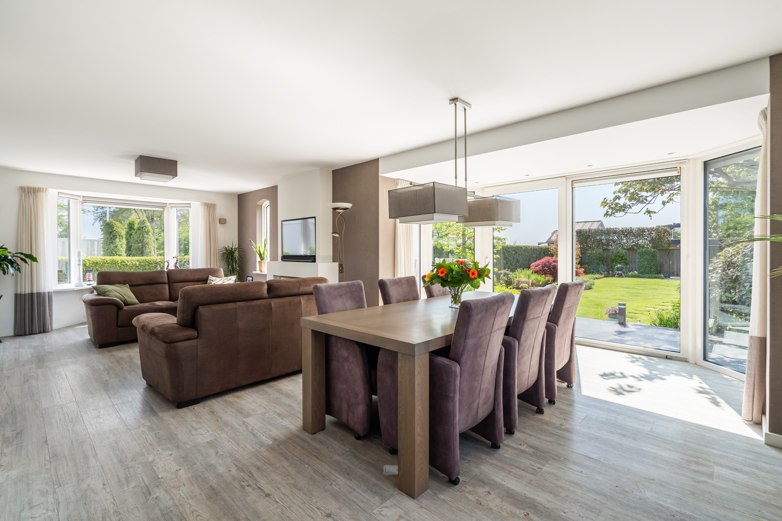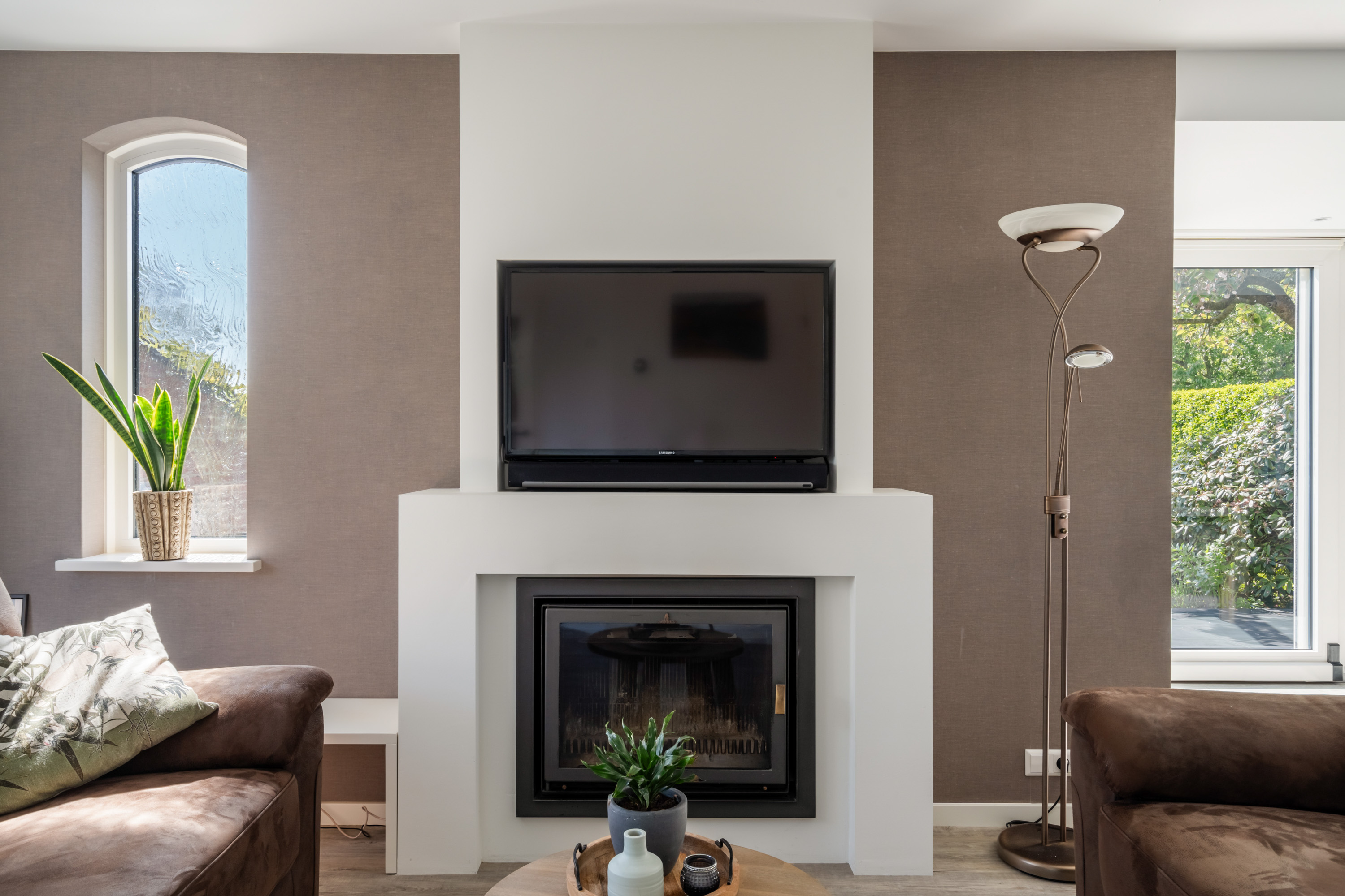 The living room is spacious and bright, with large windows, a side window, a cozy bay window, and sliding doors (with screen) opening to the garden. Around the charming wood-burning fireplace, there’s room for a generous seating area. The PVC floor with underfloor heating adds comfort and a modern feel.