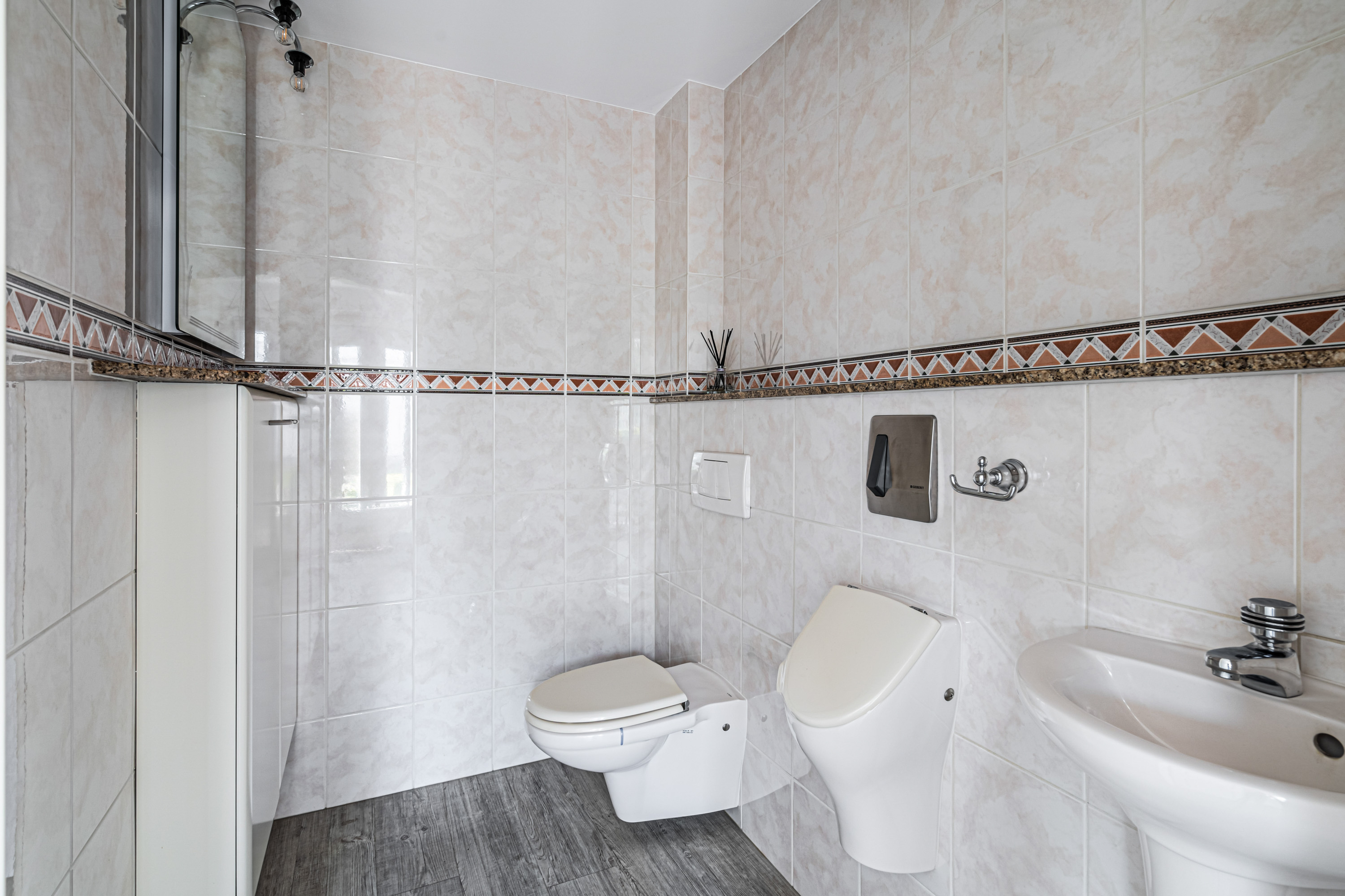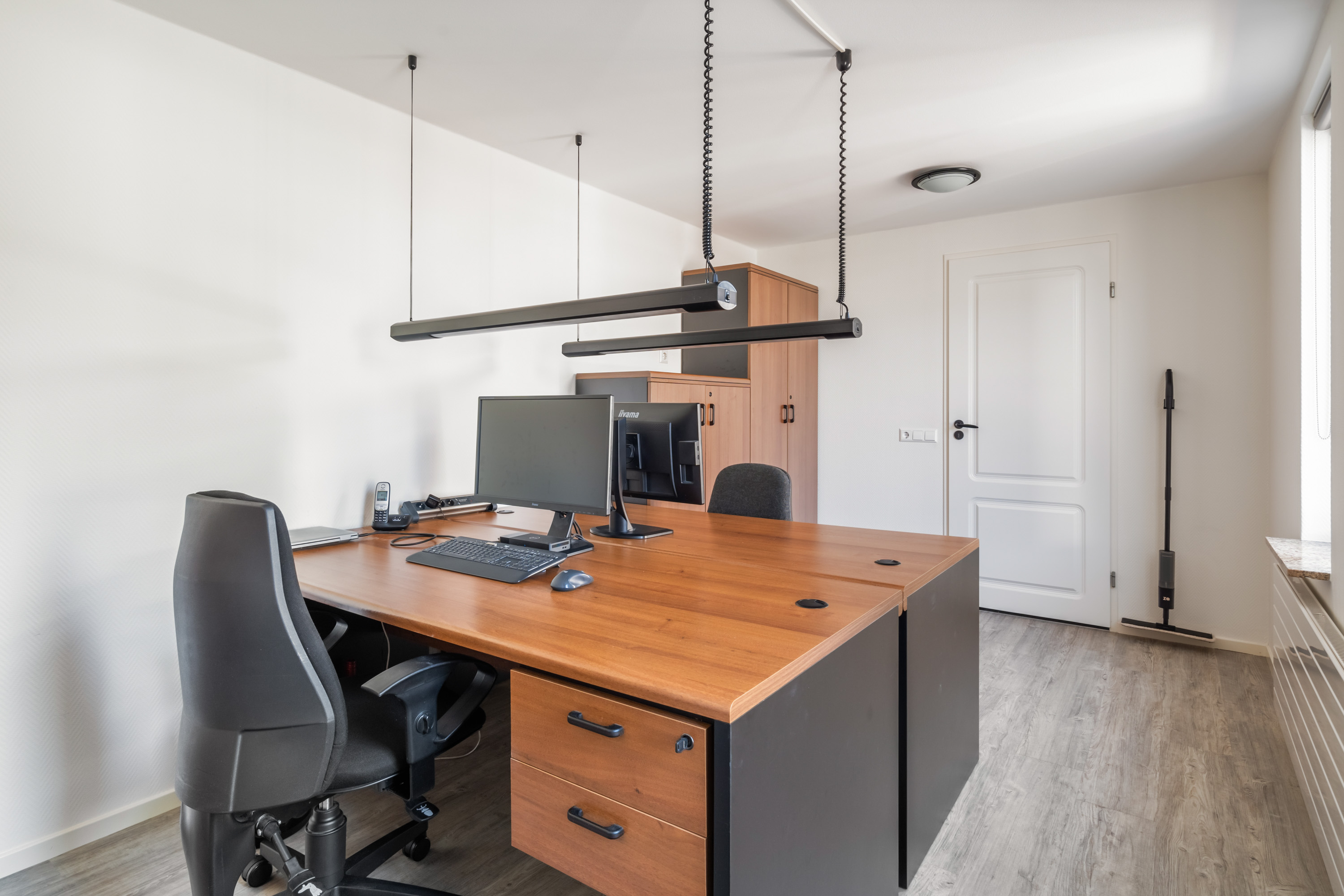 At the rear of the house, you'll find a spacious and light-filled office with PVC flooring and windows on all sides. Ideal for working from home, a private practice, or creative hobbies. This space is accessible via the side entrance, making it perfect for business visitors.