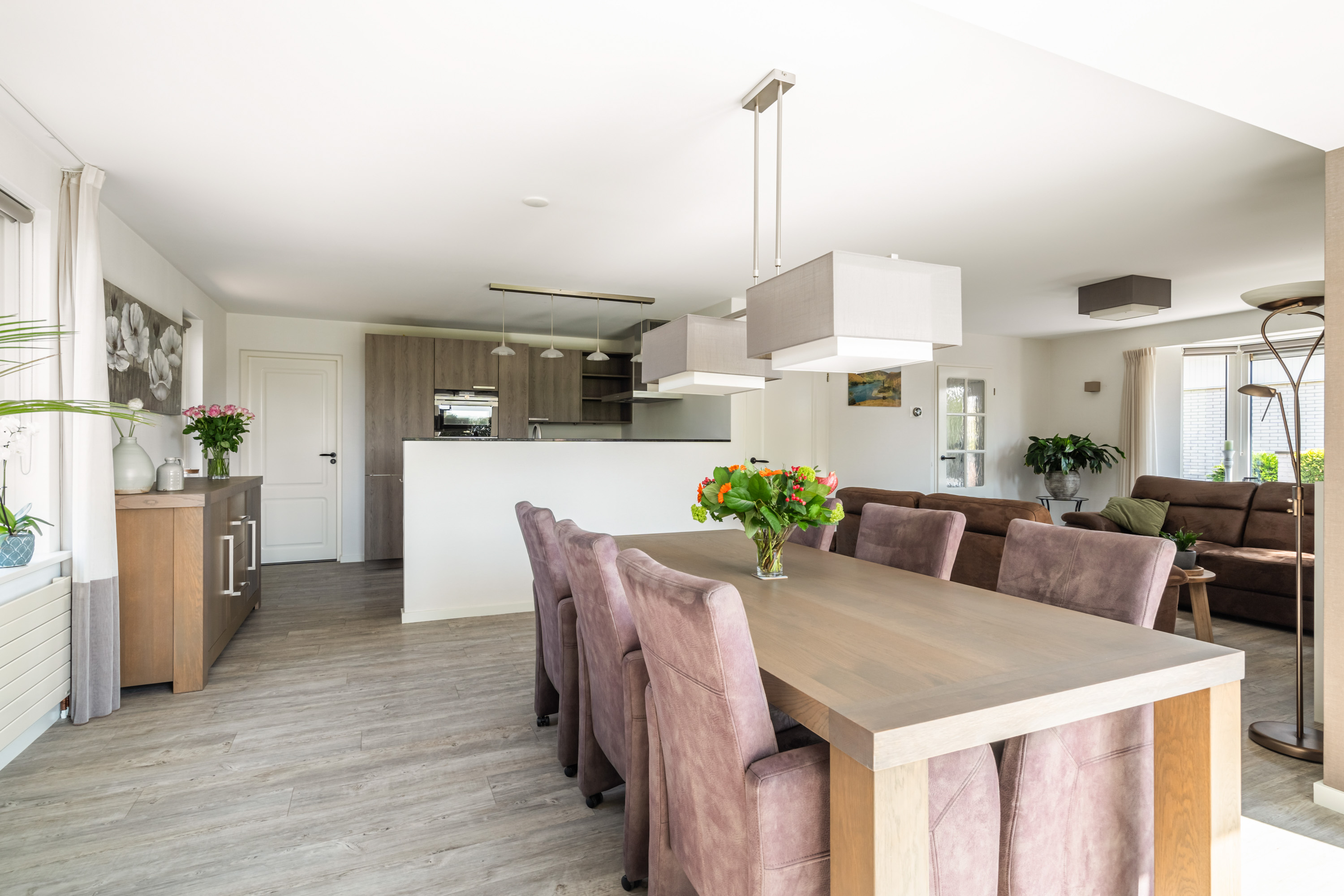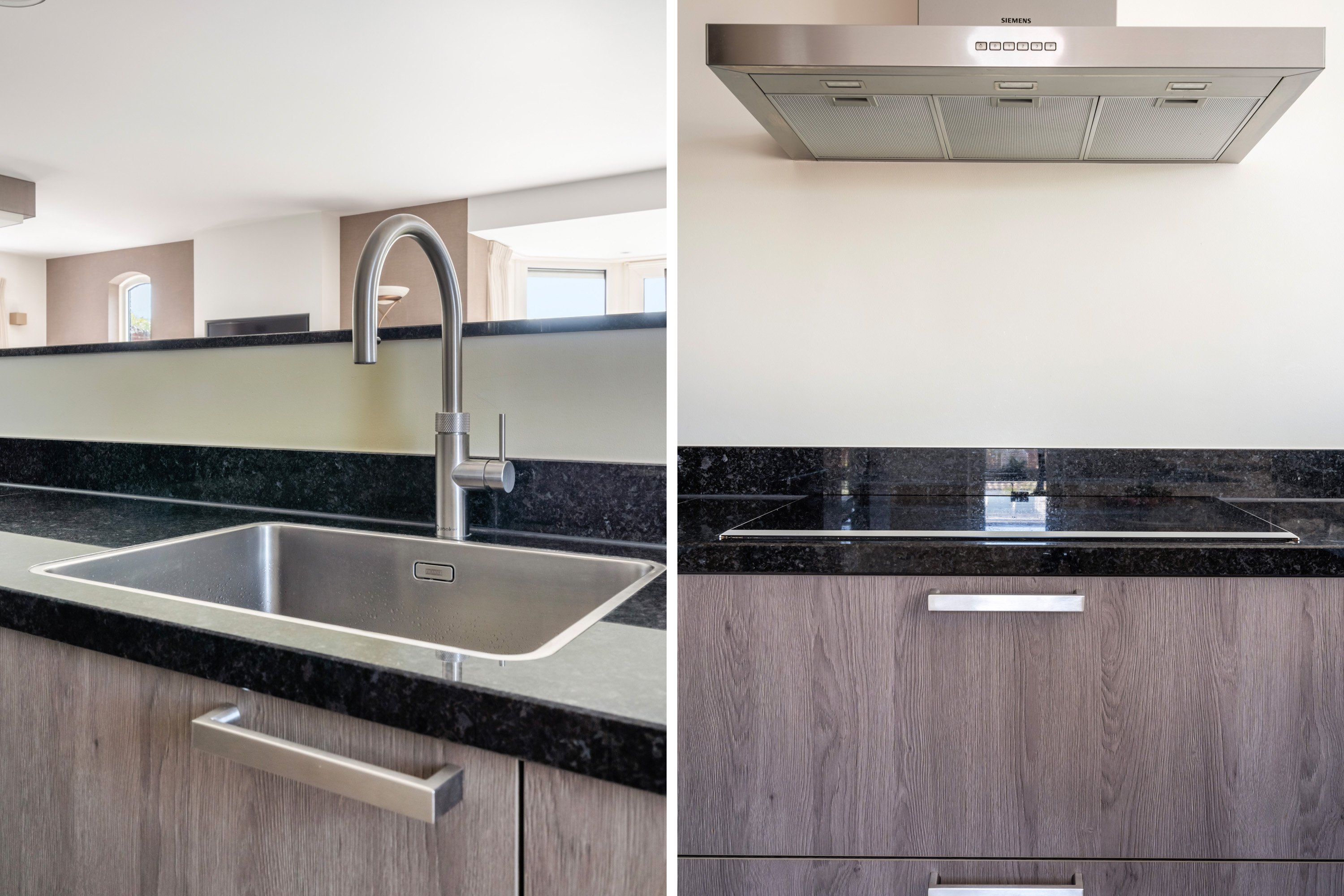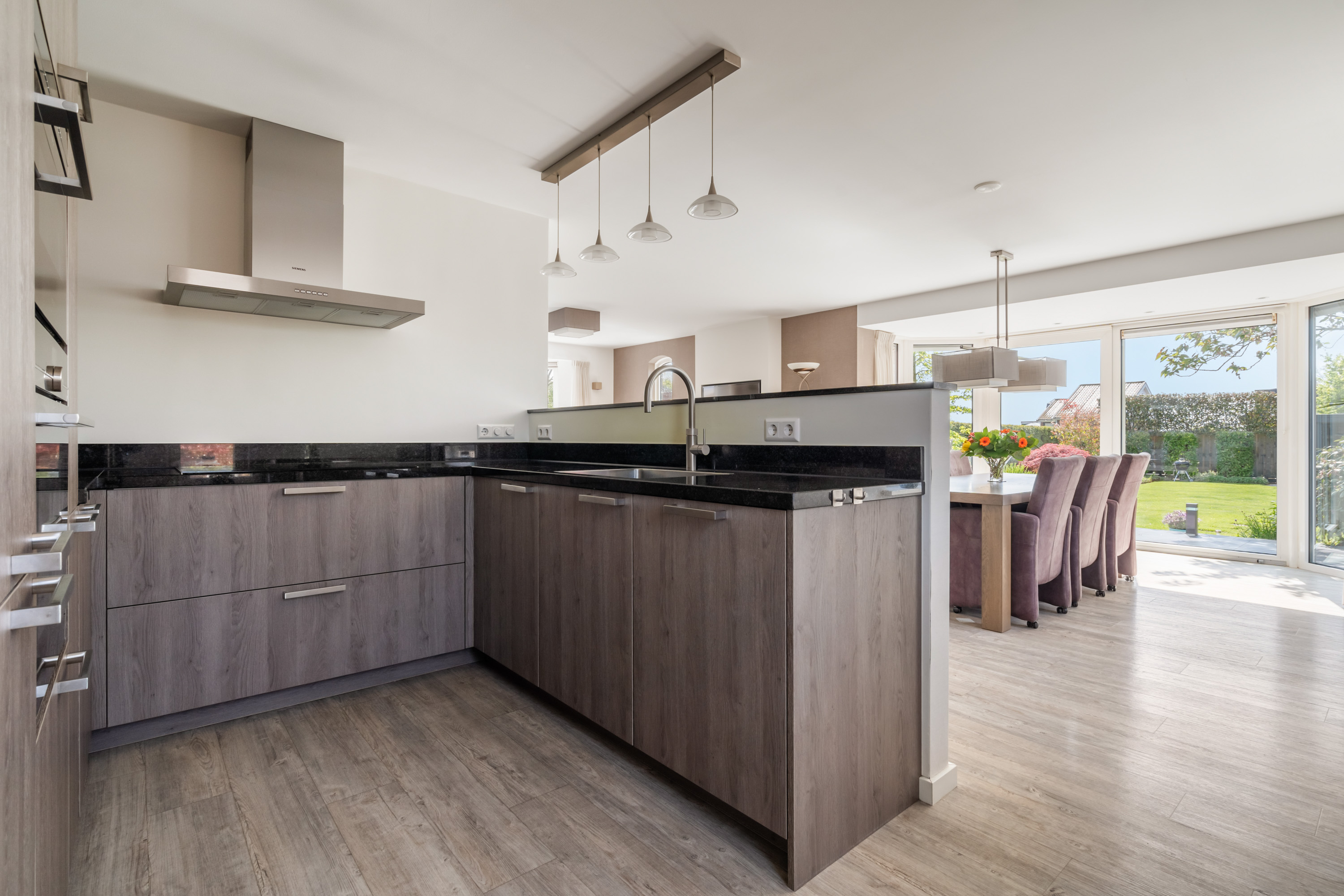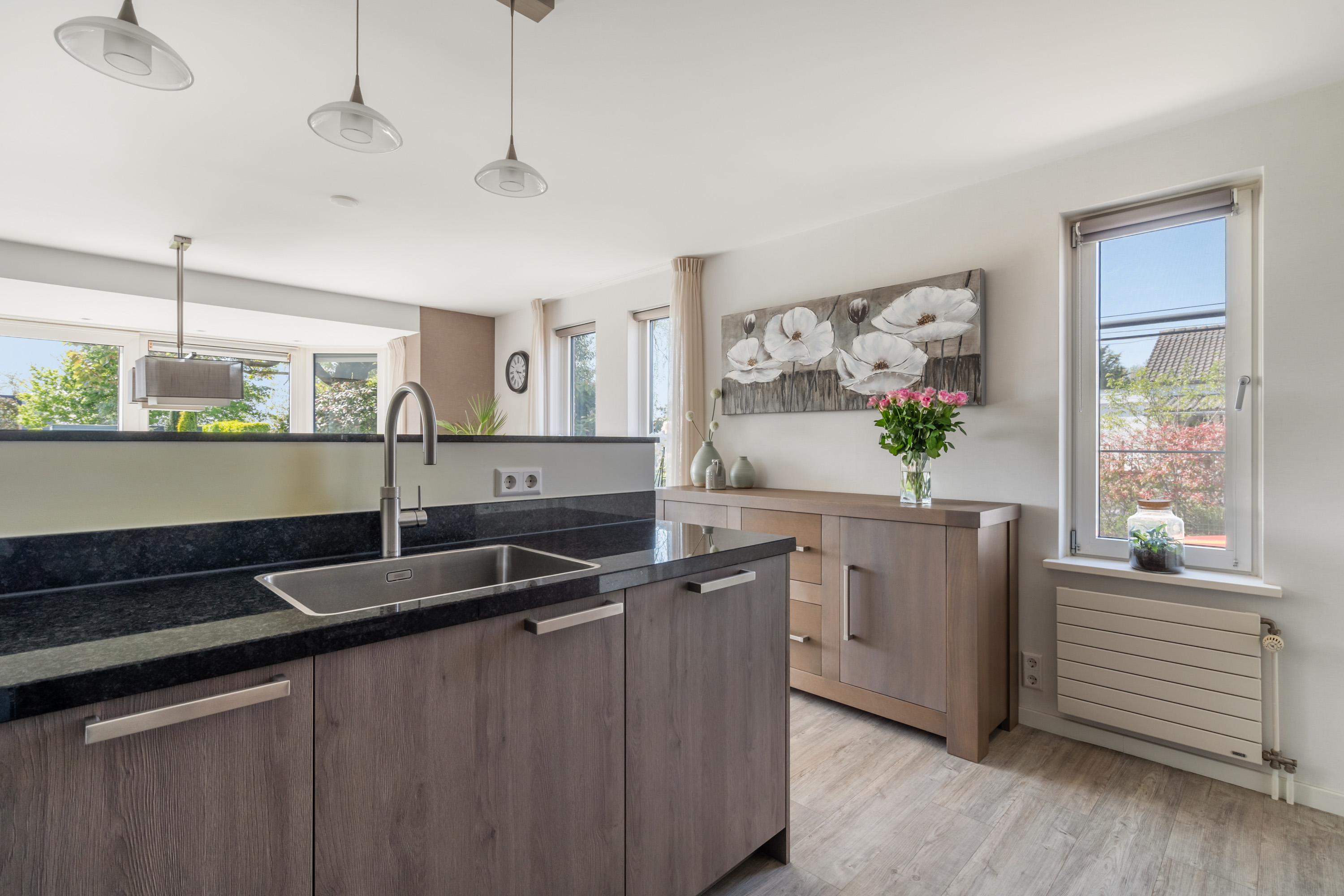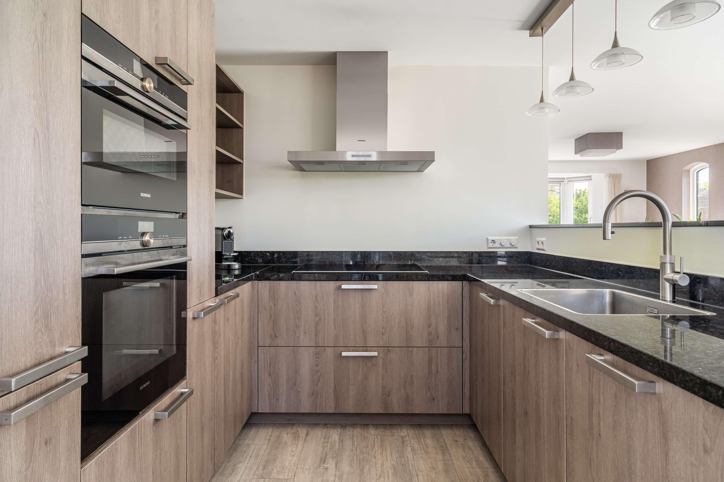 Cook in style: the open U-shaped kitchen is equipped with high-end Siemens appliances, including an induction cooktop with warming zone, steam oven, combi microwave, dishwasher, recirculating hood, pull-out pantry, and a Quooker. The bay window offers space for a large dining table with views of the garden and water.